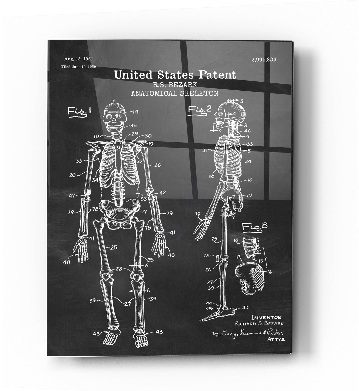 Anatomical Skeleton Blueprint Patent Chalkboard printed on crystal clear acrylic glass. Official US Patent remastered by Epic Art. Available on blackboard or parchment background.