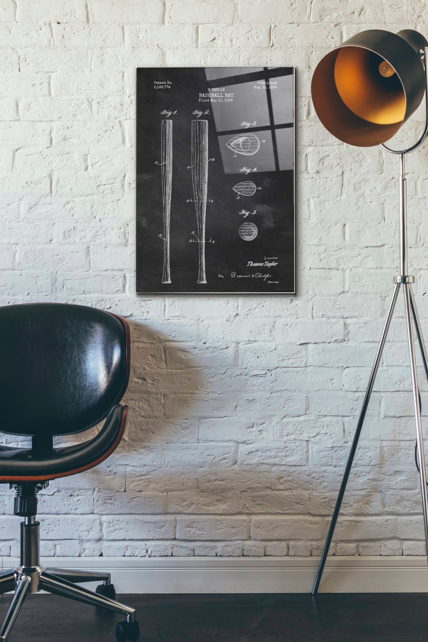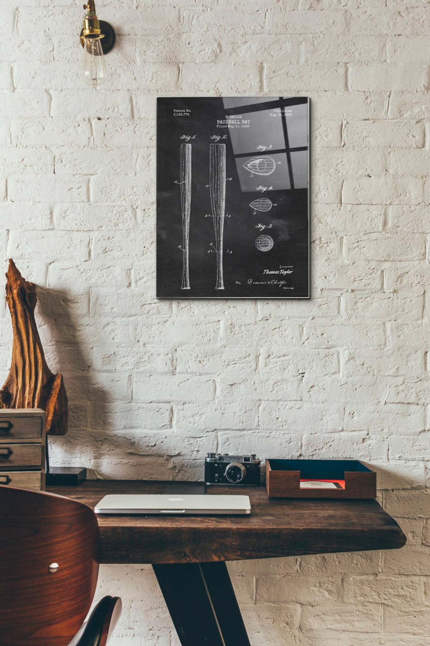 Baseball Bat Blueprint Patent Chalkboard printed on crystal clear acrylic glass. Official US Patent remastered by Epic Art. Available on blackboard or parchment background.