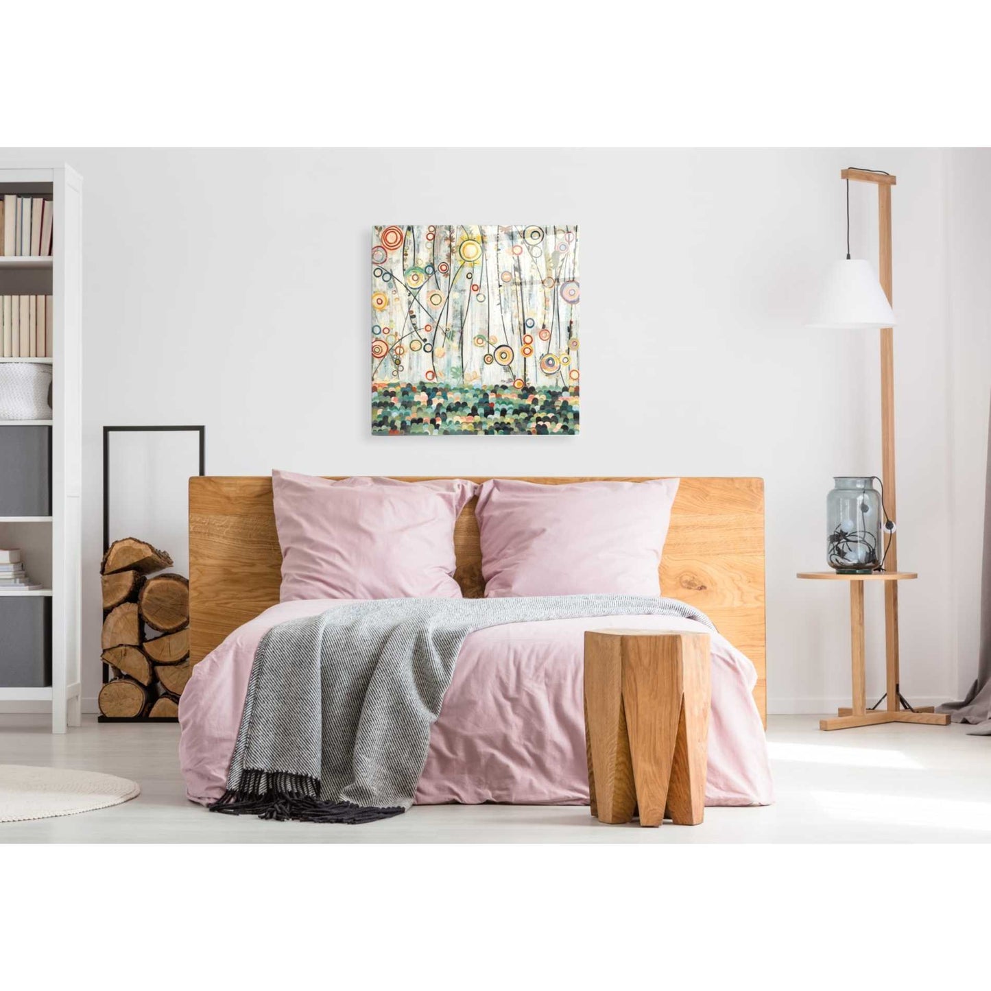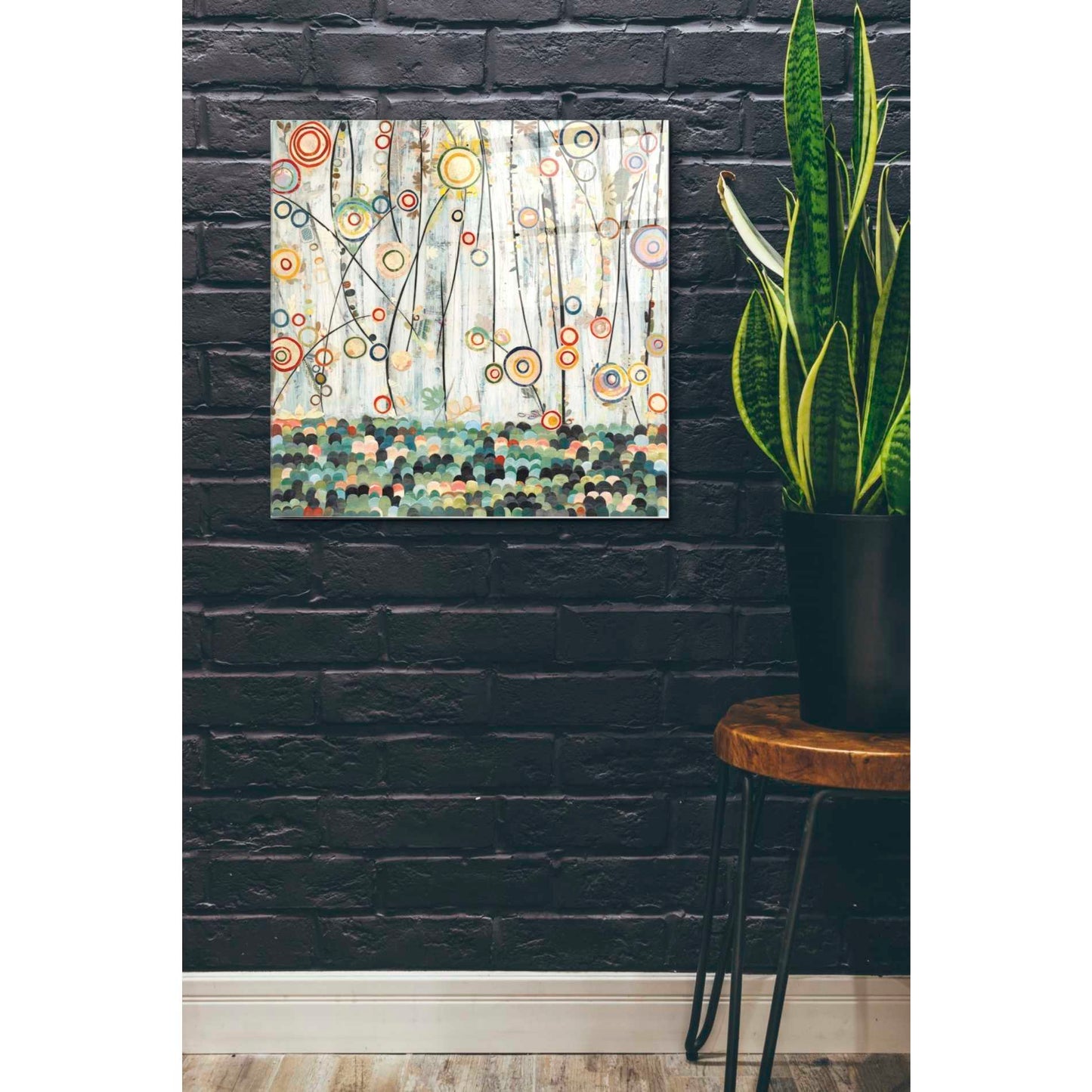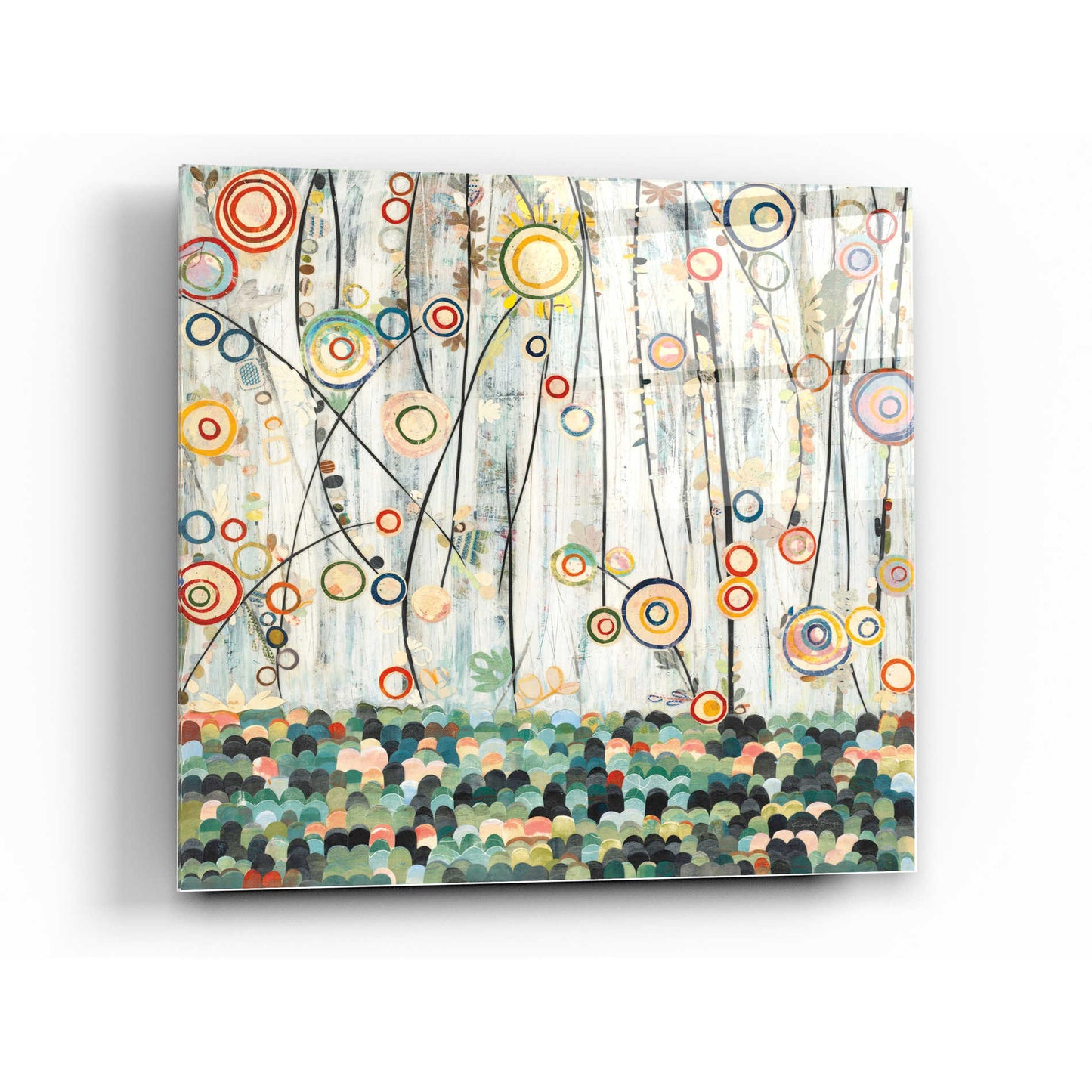 "Blooming Meadow" by Candra Boggs printed on crystal clear acrylic glass. Featuring an abstract painting of flowers. This is made up of circles and bright colors creating the view of flowers in a field.
