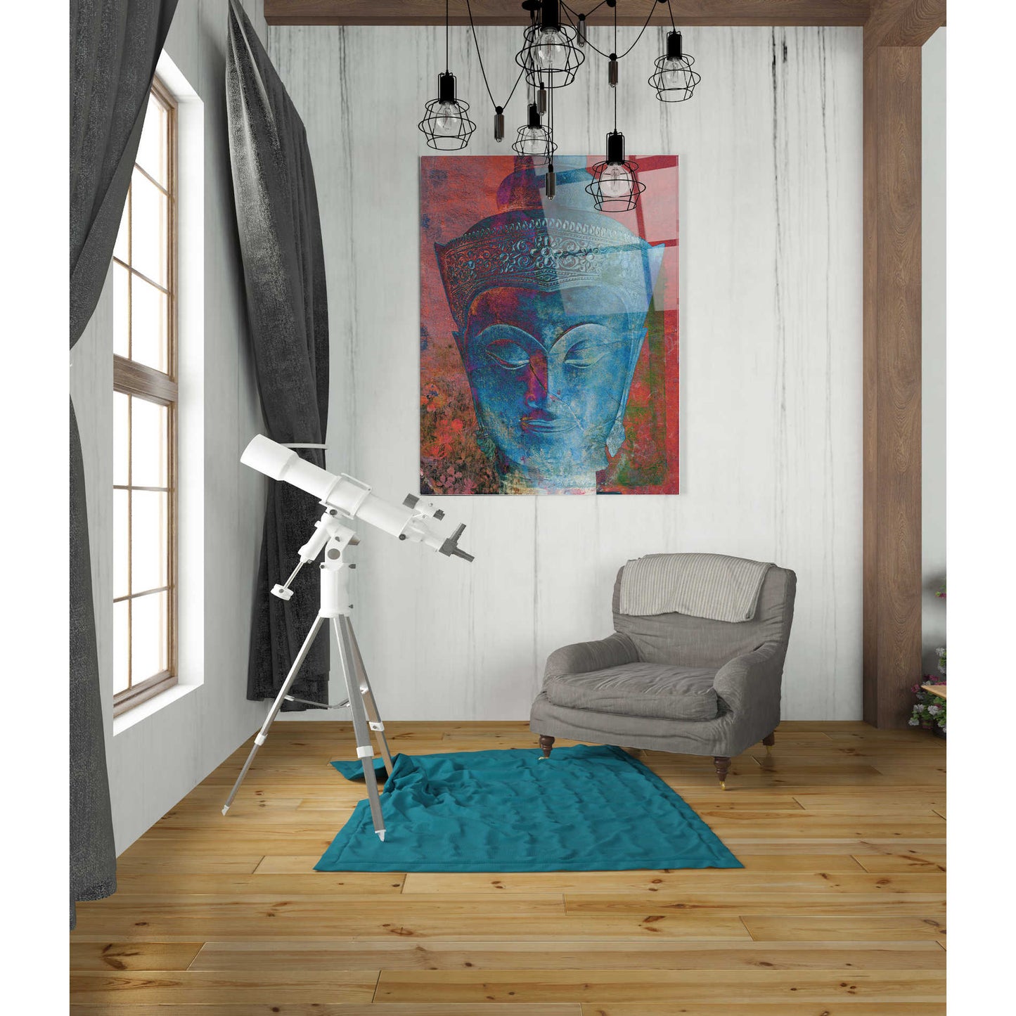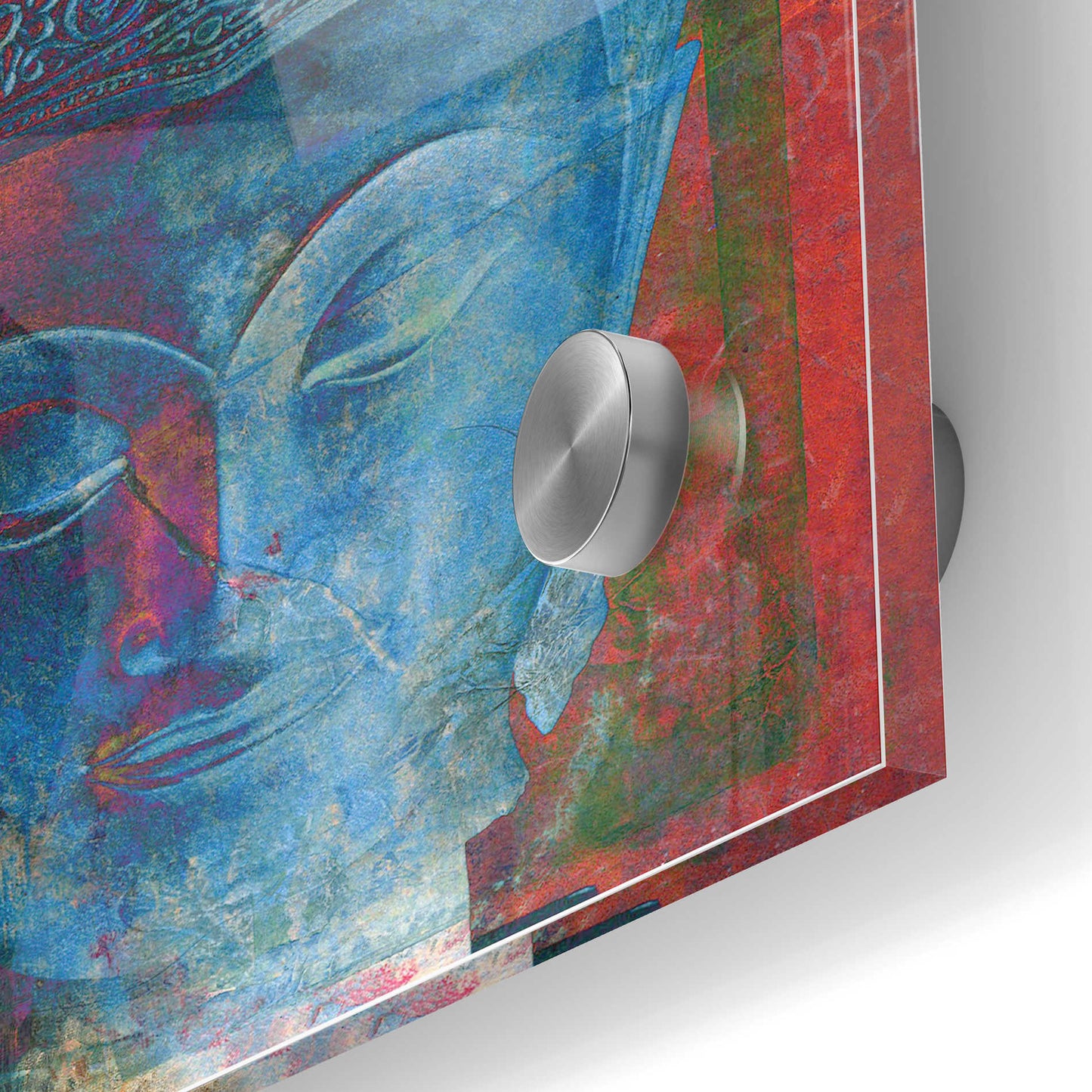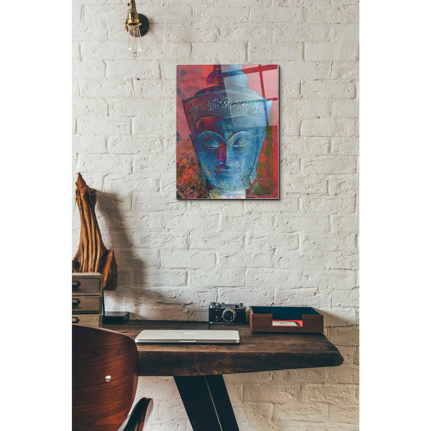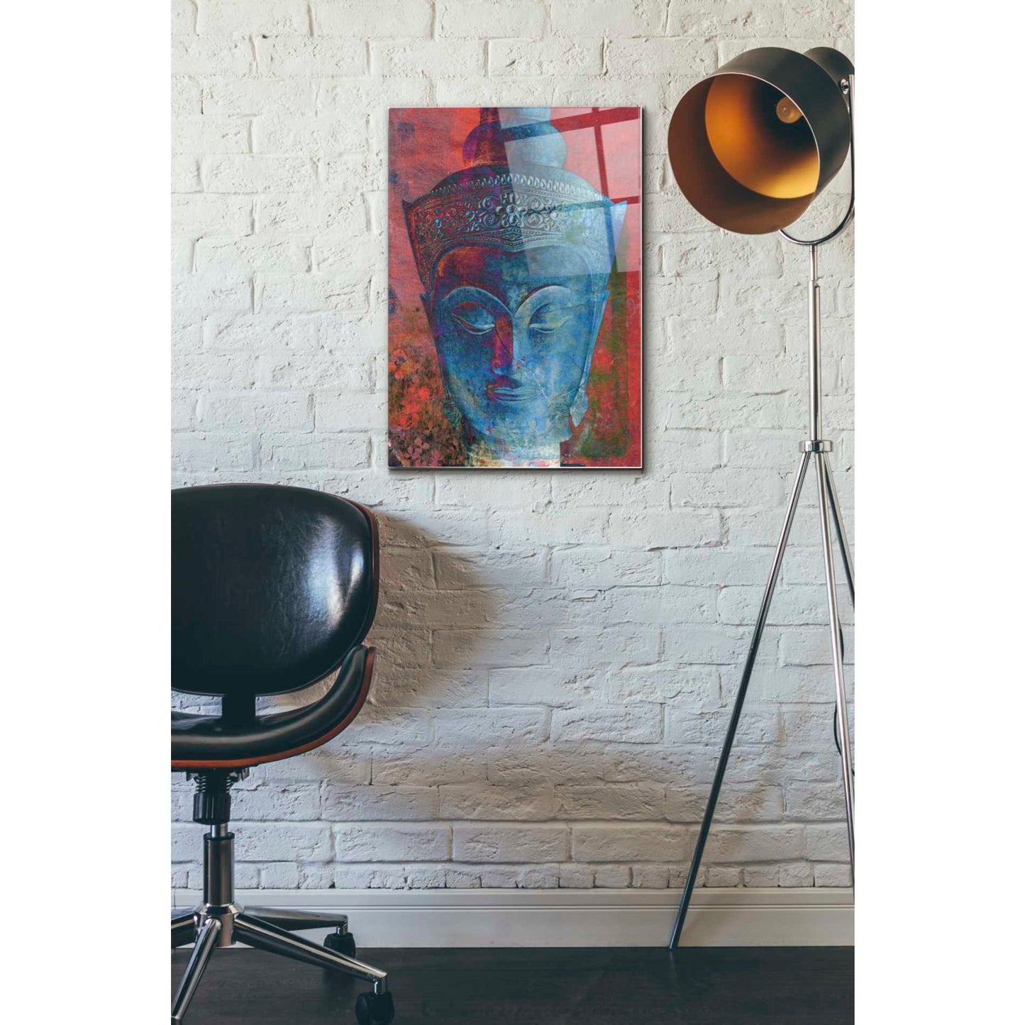 "Blue Buddha Head" by Elena Ray printed on crystal clear acrylic glass. Featuring a blue Buddha head on red background.
