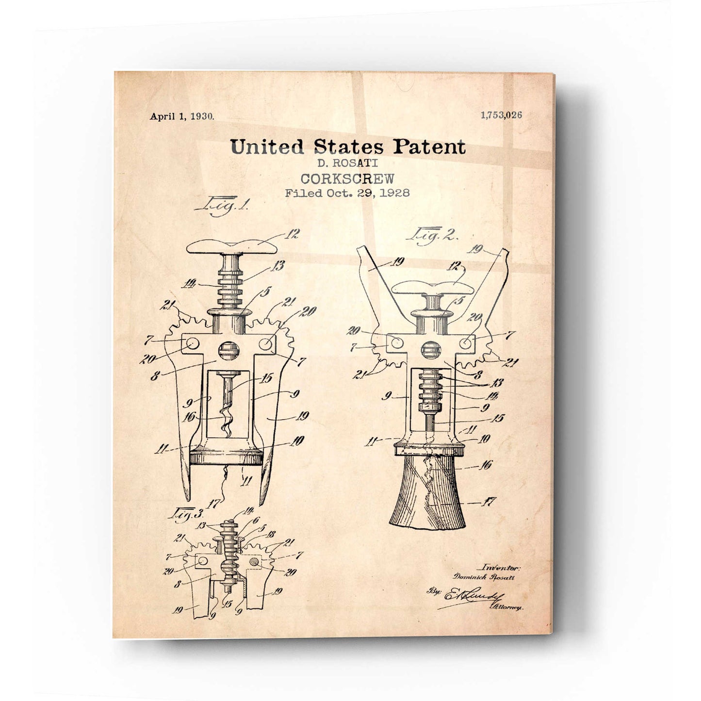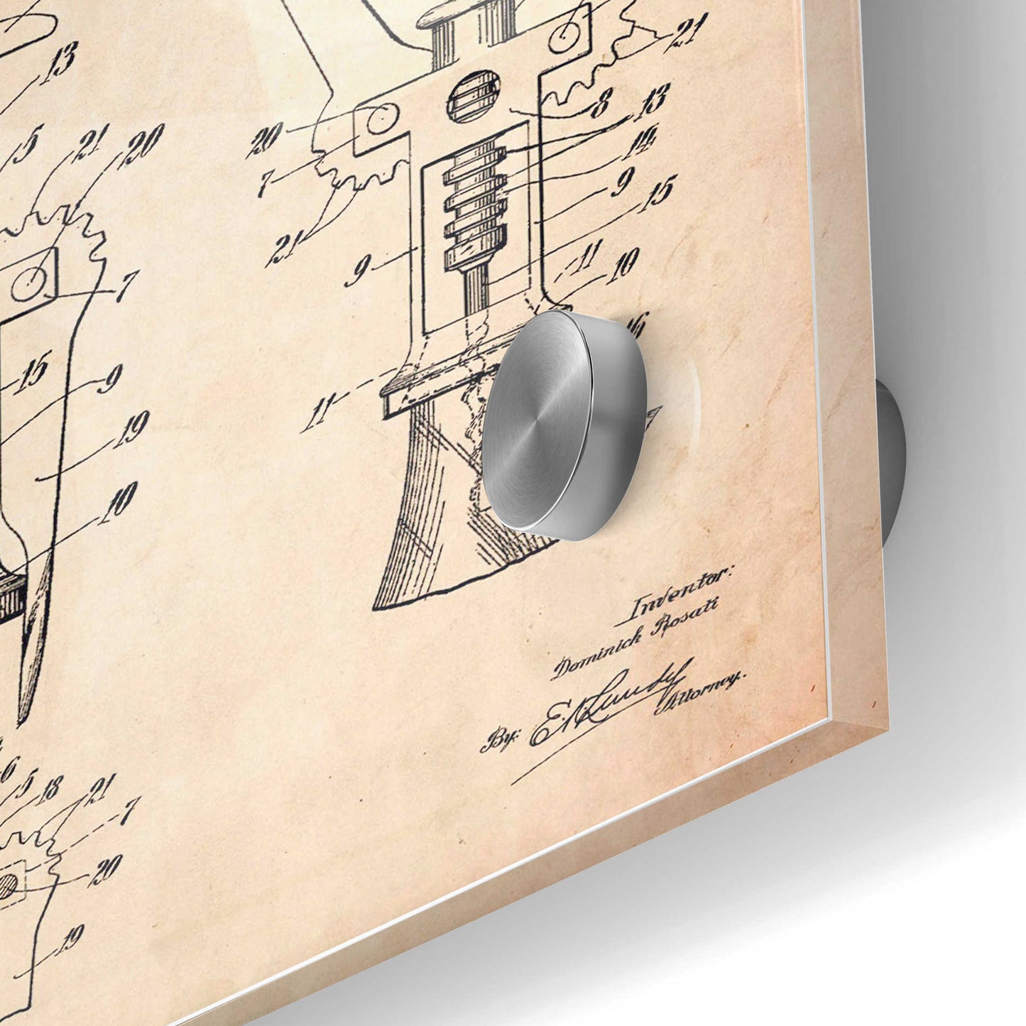 "Corkscrew Blueprint Patent Parchment printed on crystal clear acrylic glass. Official US Patent remastered" by Epic Art. Available on blackboard or parchment background. Acrylic wall art looks amazing in your home or business. Printed on the back of the acrylic giving it depth and easy maintenance. The super durable and hard-to-damage qualities make it the ideal wall art for hotels, rental properties, and restaurants. Now Epic Art brings it to you at unbelievably low prices making it very affordable for your home as well. From small sizes to extra large sizes, it is easy to hang, won"t shatter like glass if it ever falls down, and is easy to maintain. Simply dust it off or use a damp soft cloth for cleaning. For small sizes, mounting brackets and padded bumpers will be attached for simple hanging. For the larger sizes, pre-drilled holes and fitted metal standoffs are included for easy wall installation.