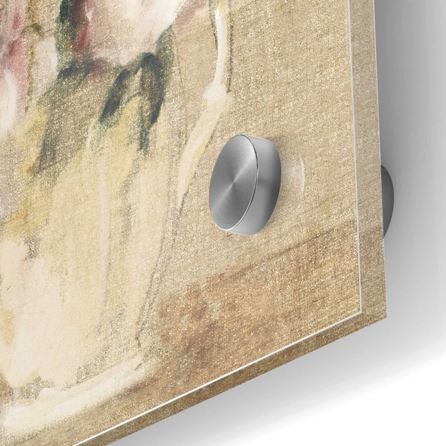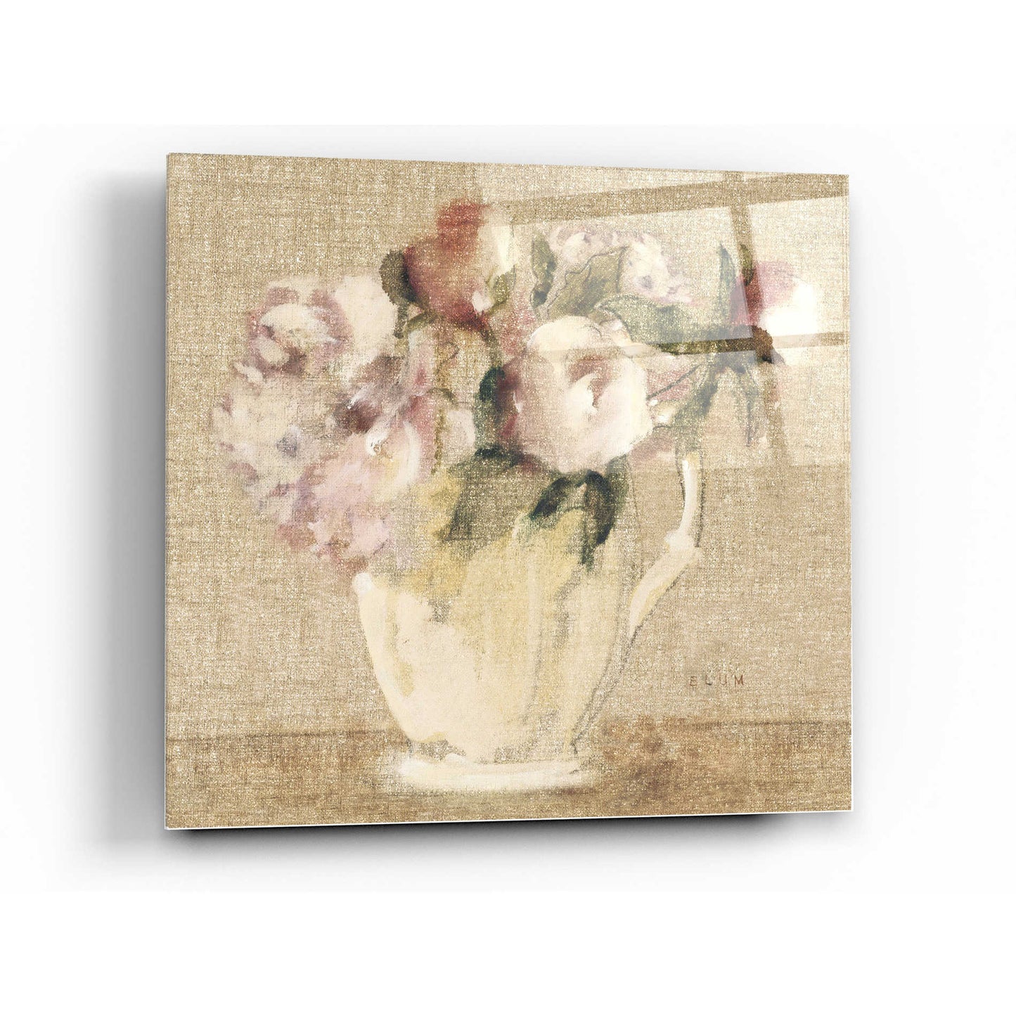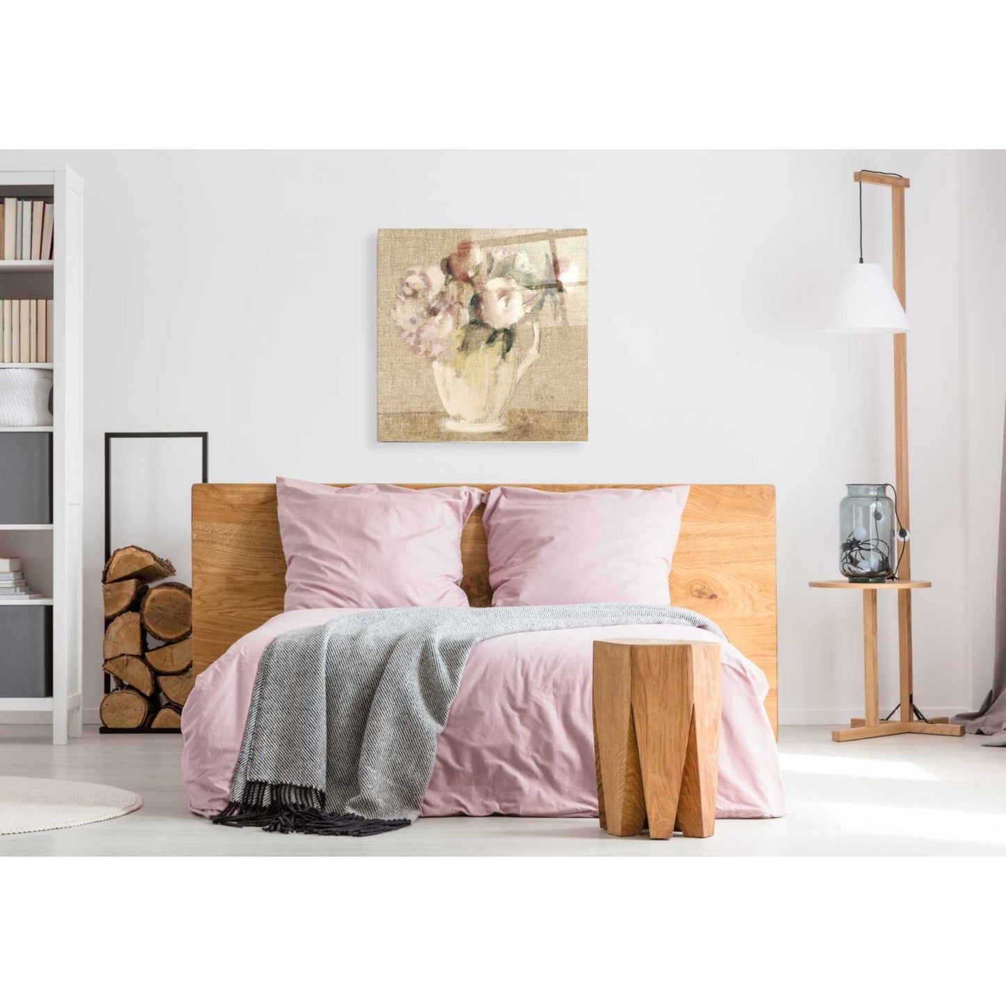 "Cottage Bouquet III" by Cheri Blum printed on crystal clear acrylic glass. Featuring a painting of an arrangement of white and pink flowers in a vase. This is a perfect stand alone piece but also pairs great with any of the other art in the "Cottage Bouquet" series.