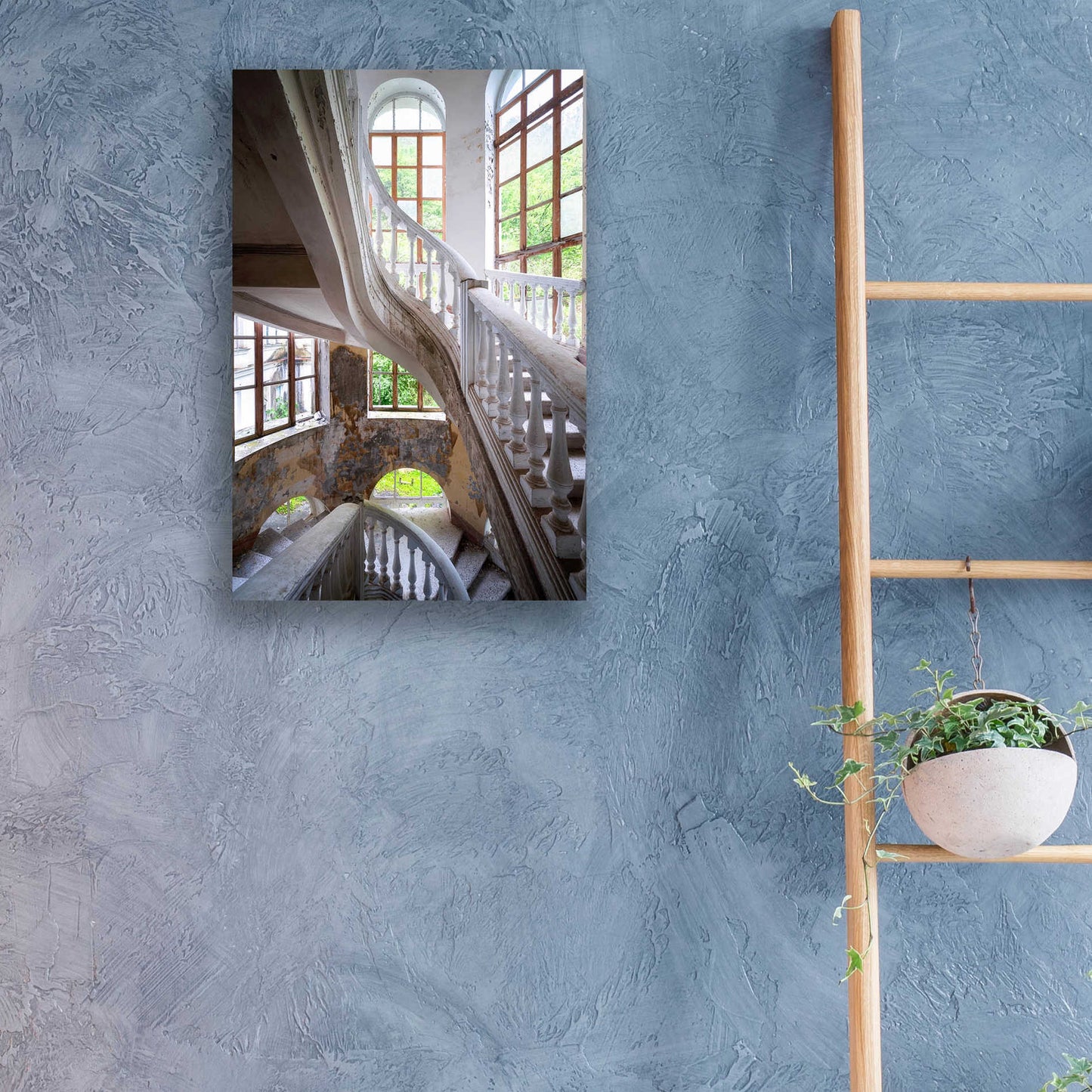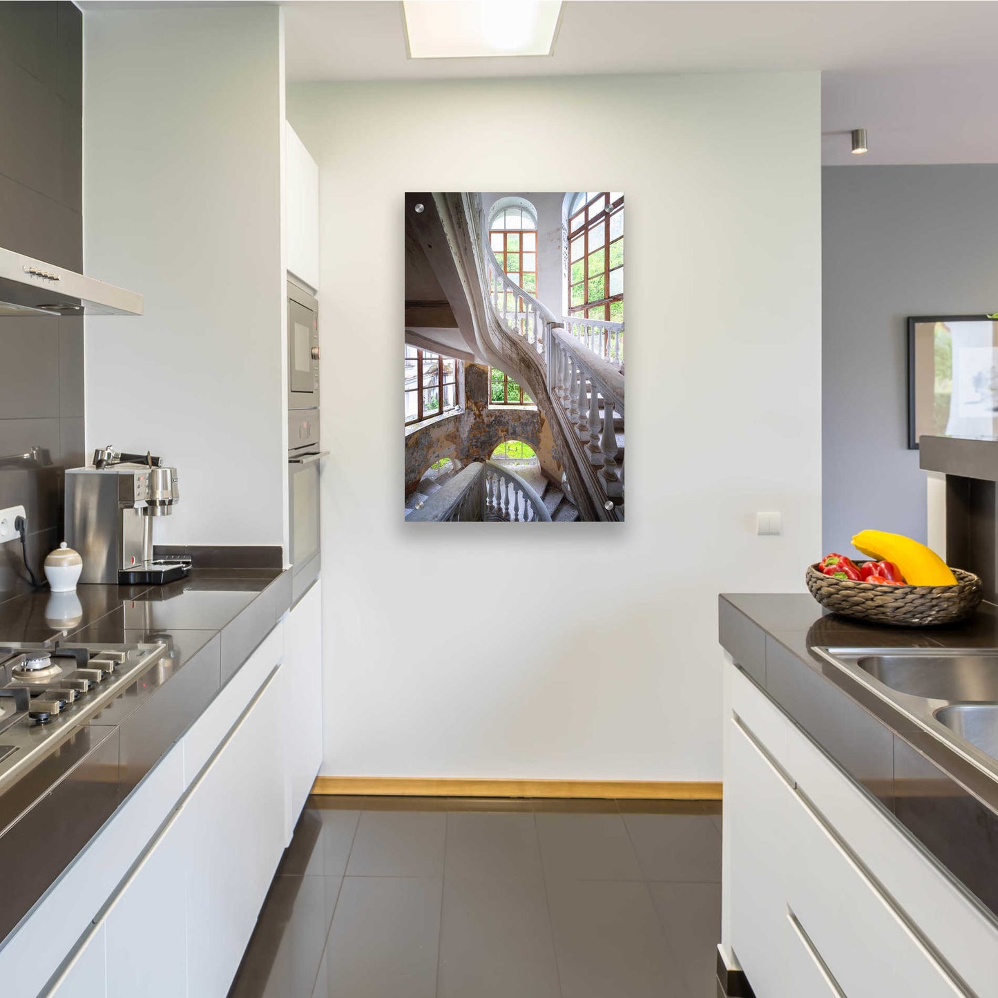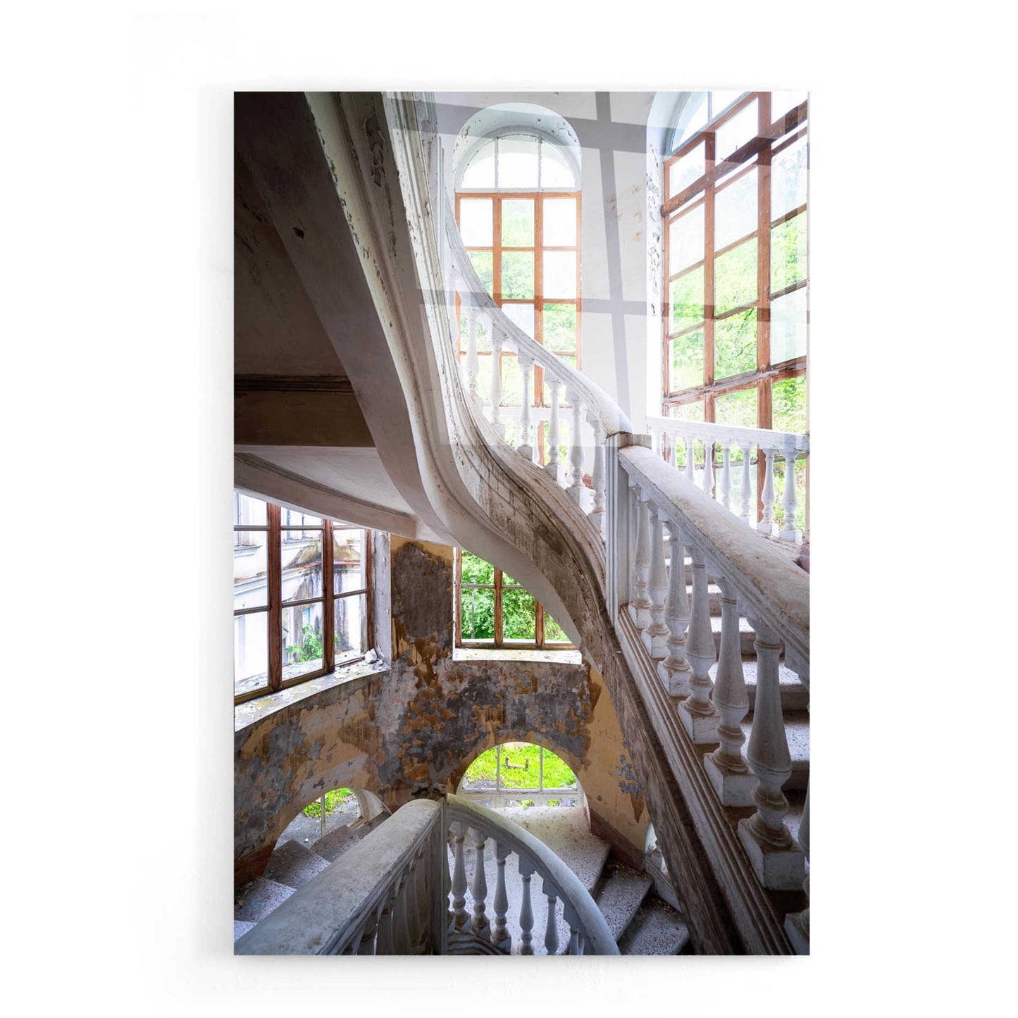 "Curved Stairs" by Roman Robroek. Roman is award-winning, urban photography born and raised in the south of the Netherlands. He specializes in capturing interiors and exteriors of buildings with the use of natural light only. He likes to bring abandoned and decayed buildings a curiosity to the viewer: “What was the story behind those buildings? Who used to live there? What purpose did these objects serve and why were they abandoned?” Acrylic wall art looks amazing in your home or business. Printed on the back of the acrylic giving it depth and easy maintenance. The highly durable and hard-to-damage qualities make high definition acrylic the ideal wall art for hotels, rental properties, and restaurants. Now Epic Art brings you unmatched value in contemporary wall decor for your home as well. From small sizes to extra large sizes, it is easy to hang, won"t shatter like glass if it ever falls down, and is easy to maintain. Simply dust it off or use a damp soft cloth for cleaning.