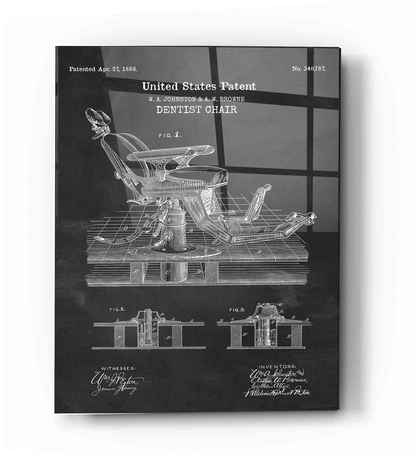 Dentist Chair Blueprint Patent Chalkboard printed on crystal clear acrylic glass. Official US Patent remastered by Epic Art. Available on blackboard or parchment background.
