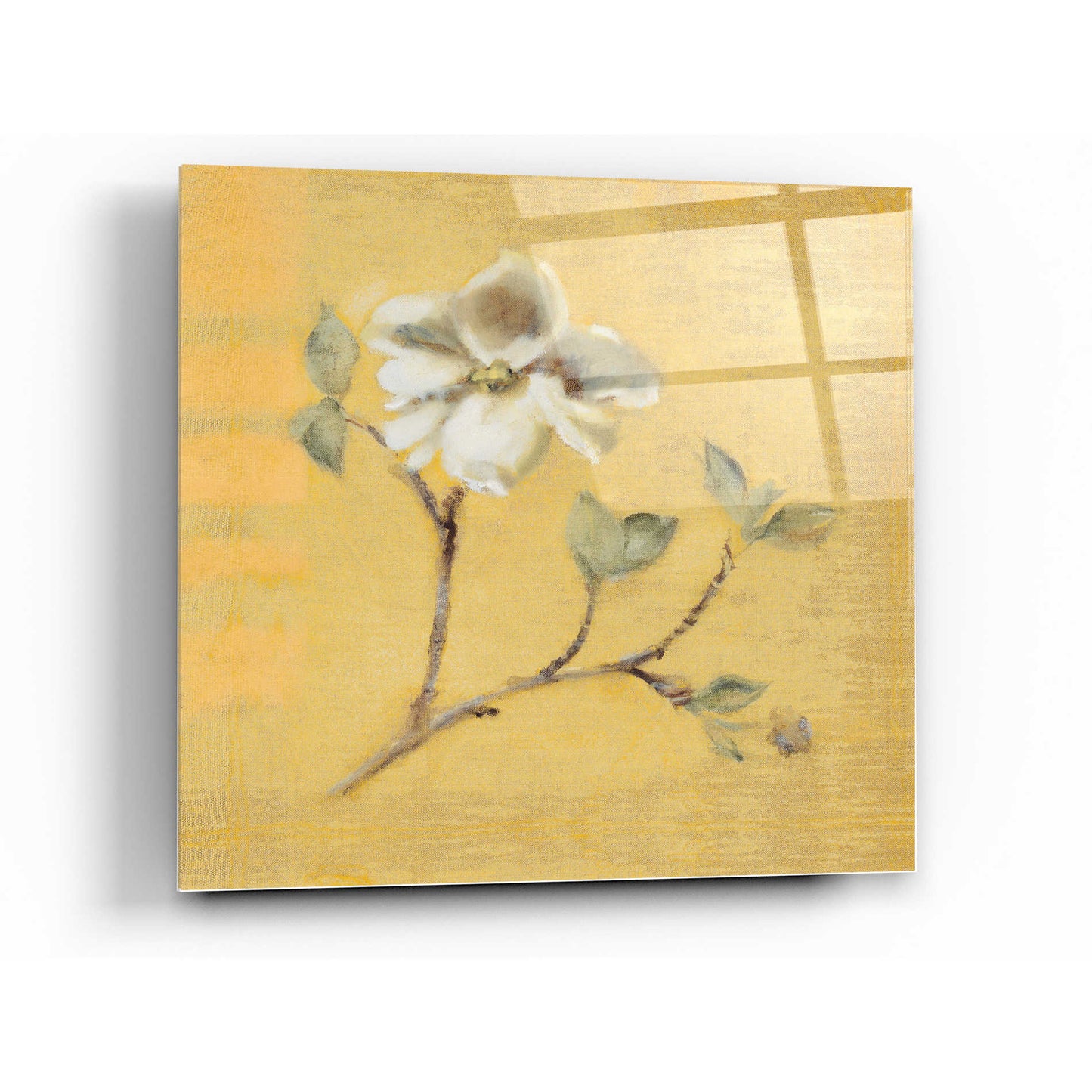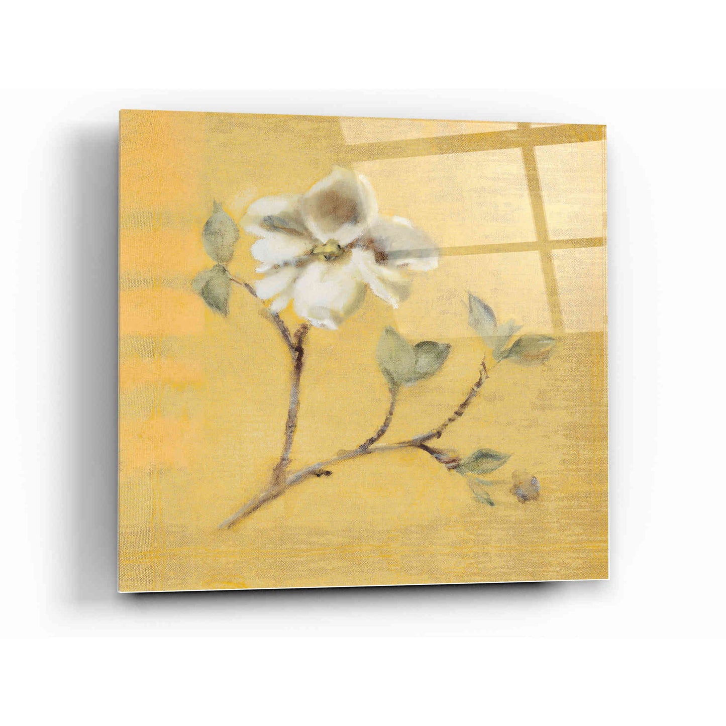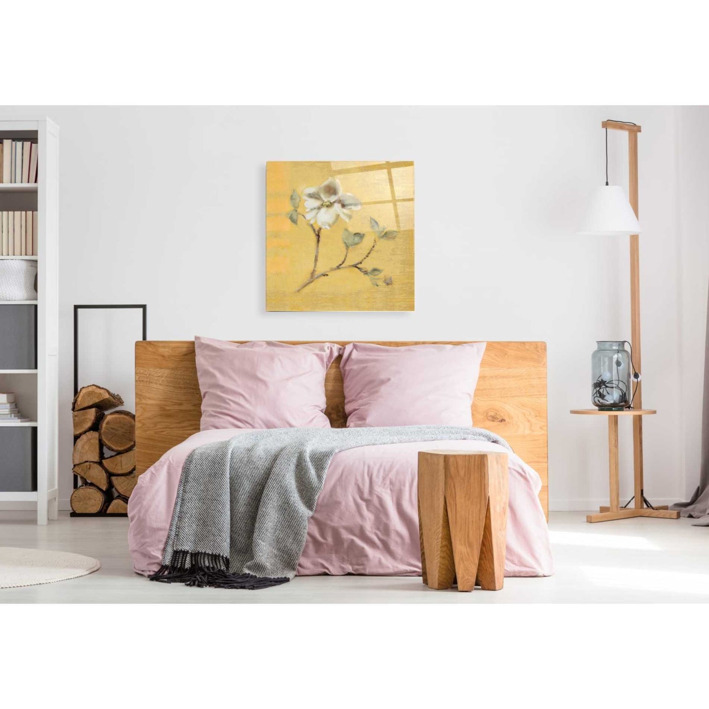 "Dogwood Blossom on Gold" by Cheri Blum printed on crystal clear acrylic glass. Featuring a painting of a white dogwood flower with a gold background. This is perfect for any room with and pairs well with "Magnolia Blossom on Gold."