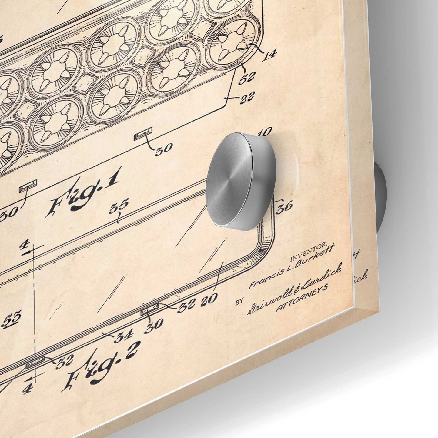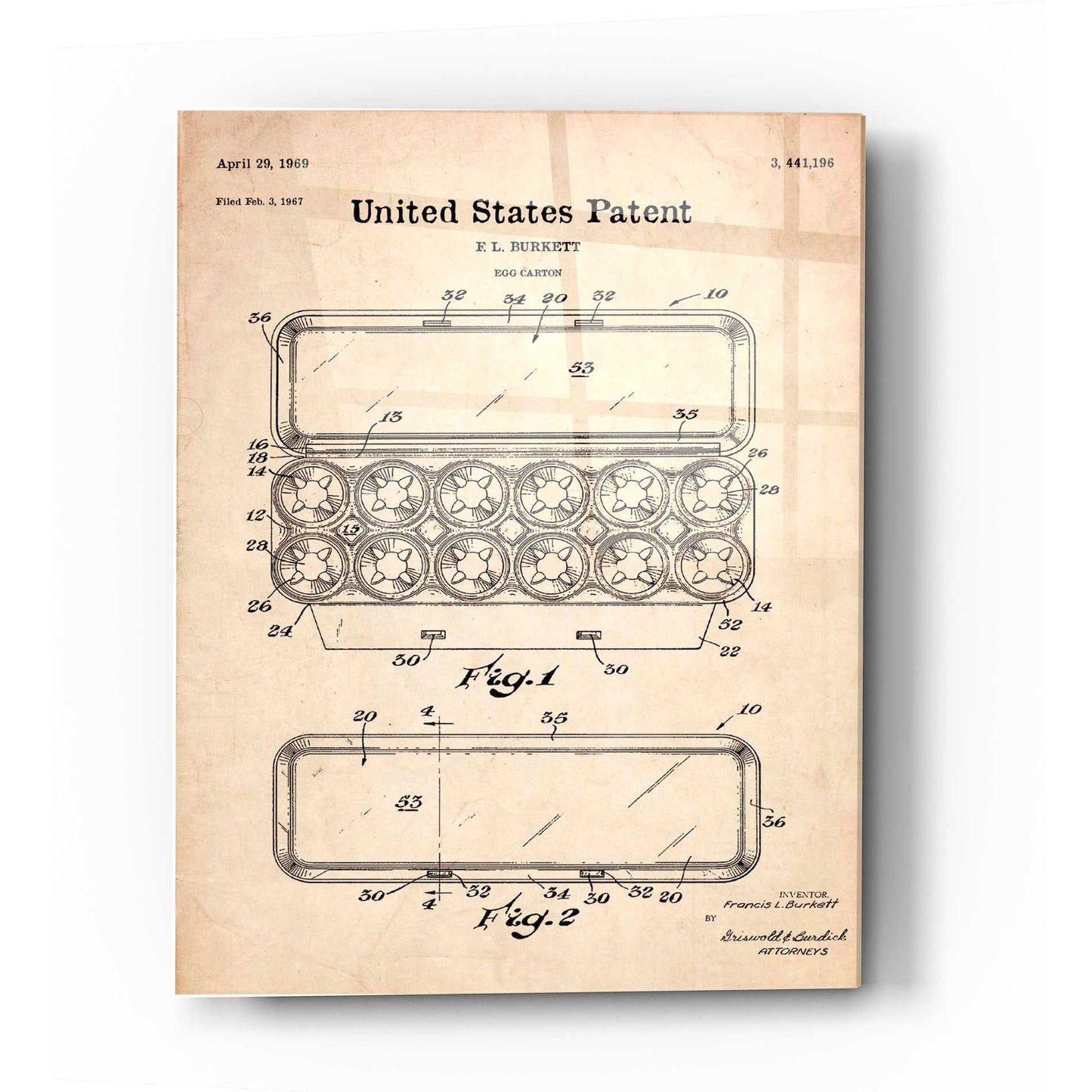 "Egg Carton Blueprint Patent Parchment printed on crystal clear acrylic glass. Official US Patent remastered" by Epic Art. Available on blackboard or parchment background. Acrylic wall art looks amazing in your home or business. Printed on the back of the acrylic giving it depth and easy maintenance. The super durable and hard-to-damage qualities make it the ideal wall art for hotels, rental properties, and restaurants. Now Epic Art brings it to you at unbelievably low prices making it very affordable for your home as well. From small sizes to extra large sizes, it is easy to hang, won"t shatter like glass if it ever falls down, and is easy to maintain. Simply dust it off or use a damp soft cloth for cleaning. For small sizes, mounting brackets and padded bumpers will be attached for simple hanging. For the larger sizes, pre-drilled holes and fitted metal standoffs are included for easy wall installation.