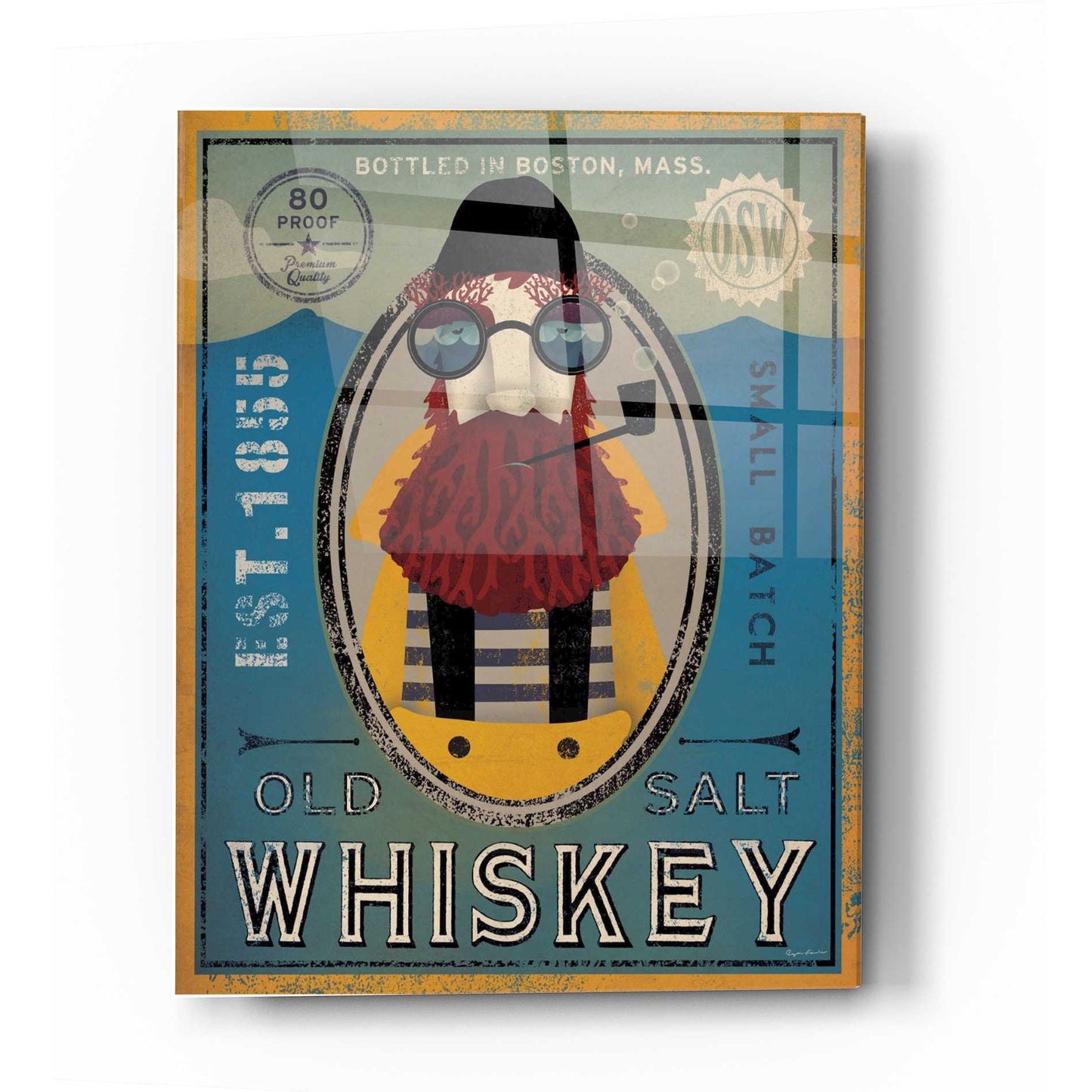 "Fisherman IV Old Salt Whiskey" by Ryan Fowlerprinted on crystal clear acrylic glass. Ryan Fowler studied photography and photographic printing methods, both in a darkroom and on a computer. He uses his drawings, paintings, and graphic illustrations to create his work inspired" by nature, advertising design, and New England and Pacific Northwest iconography. Ryan uses a combination of traditional and modern techniques for his various subject matters; which include animals, landscapes, children"s art, typography, and graphic design. Acrylic wall art looks amazing in your home or business. Printed on the back of the acrylic giving it depth and easy maintenance. The super durable and hard-to-damage qualities make it the ideal wall art for hotels, rental properties, and restaurants. Now Epic Art brings it to you at unbelievably low prices making it very affordable for your home as well. From small sizes to extra large sizes, it is easy to hang, won"t shatter like glass if it ever falls down, and is easy to maintain. Simply dust it off or use a damp soft cloth for cleaning. For small sizes, mounting brackets and padded bumpers will be attached for simple hanging. For the larger sizes, pre-drilled holes and fitted metal standoffs are included for easy wall installation.