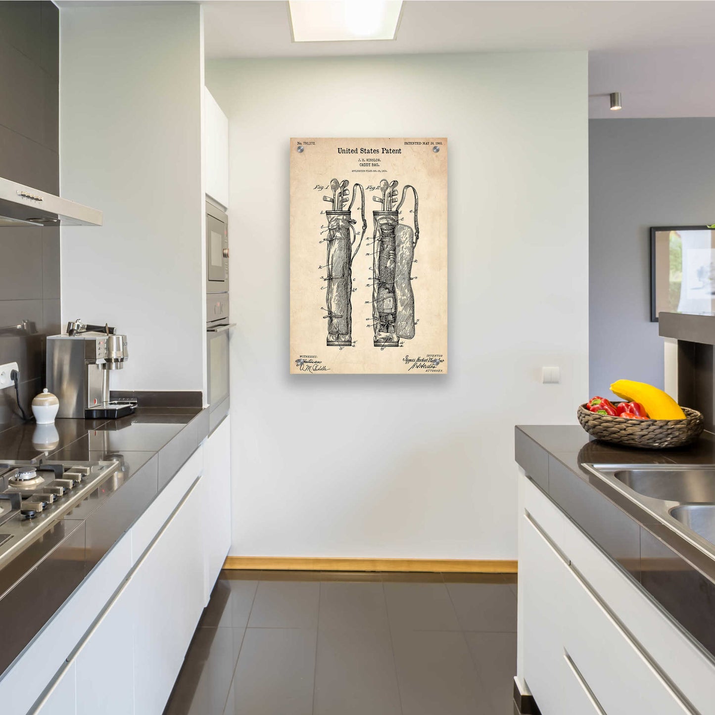 "Golf Bag Caddy Vintage Patent Blueprint printed on crystal clear acrylic glass. Official US Patent remastered" by Epic Art. Available on blackboard or parchment background. Acrylic wall art looks amazing in your home or business. Printed on the back of the acrylic giving it depth and easy maintenance. The super durable and hard-to-damage qualities make it the ideal wall art for hotels, rental properties, and restaurants. Now Epic Art brings it to you at unbelievably low prices making it very affordable for your home as well. From small sizes to extra large sizes, it is easy to hang, won"t shatter like glass if it ever falls down, and is easy to maintain. Simply dust it off or use a damp soft cloth for cleaning. For small sizes, mounting brackets and padded bumpers will be attached for simple hanging. For the larger sizes, pre-drilled holes and fitted metal standoffs are included for easy wall installation.