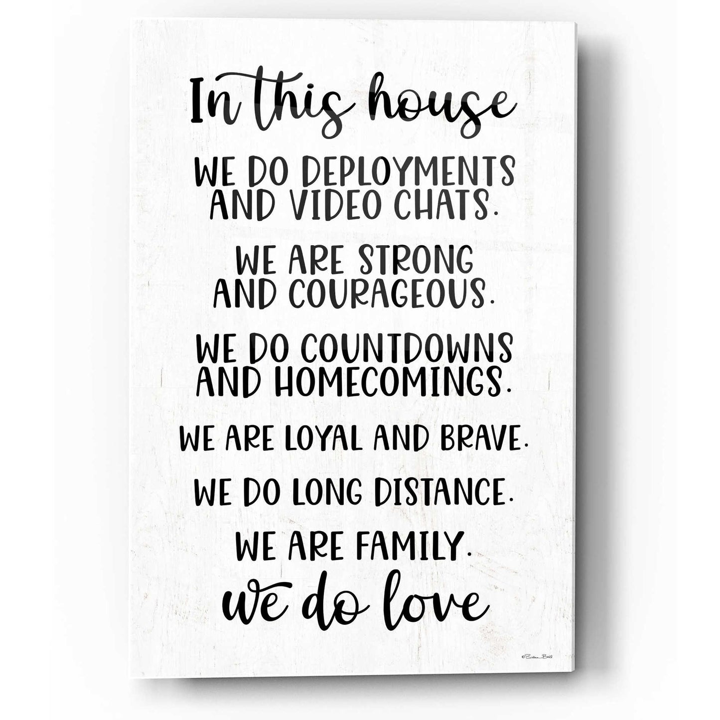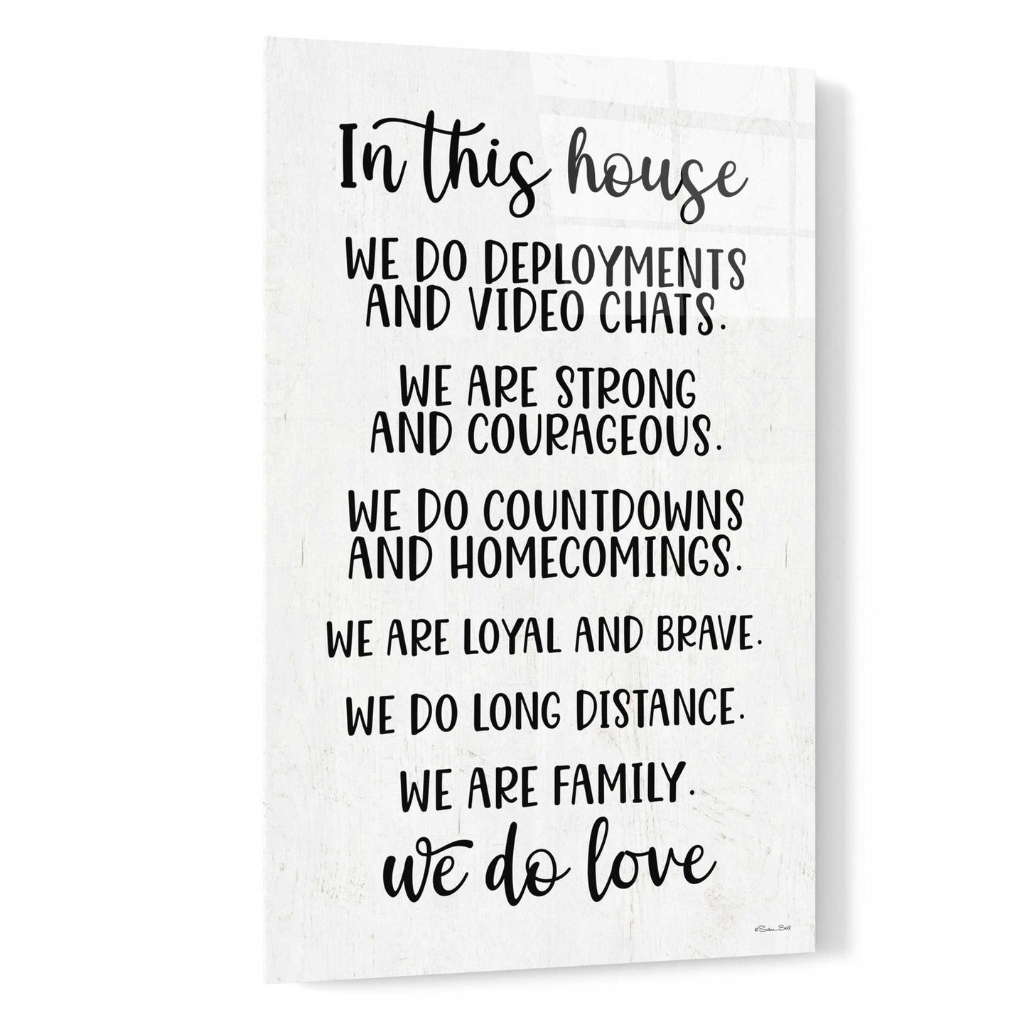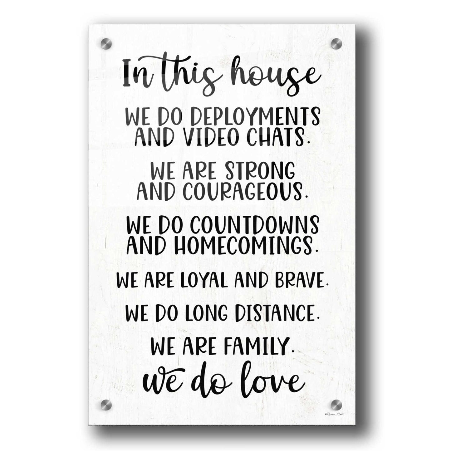 "In This House Military" by Susan Ball. Susan discovered her love for art when she began tole painting with her mom in high school. Several craft shows and product lines later, she discovered her niche in inspirational, typography art. After battling breast cancer, she creates art to motivate, encourage, and inspire people as well as appreciate the little things in life. Acrylic wall art looks amazing in your home or business. Printed on the back of the acrylic giving it depth and easy maintenance. The highly durable and hard-to-damage qualities make high definition acrylic the ideal wall art for hotels, rental properties, and restaurants. Now Epic Art brings you unmatched value in contemporary wall decor for your home as well. From small sizes to extra large sizes, it is easy to hang, won't shatter like glass if it ever falls down, and is easy to maintain. Simply dust it off or use a damp soft cloth for cleaning.