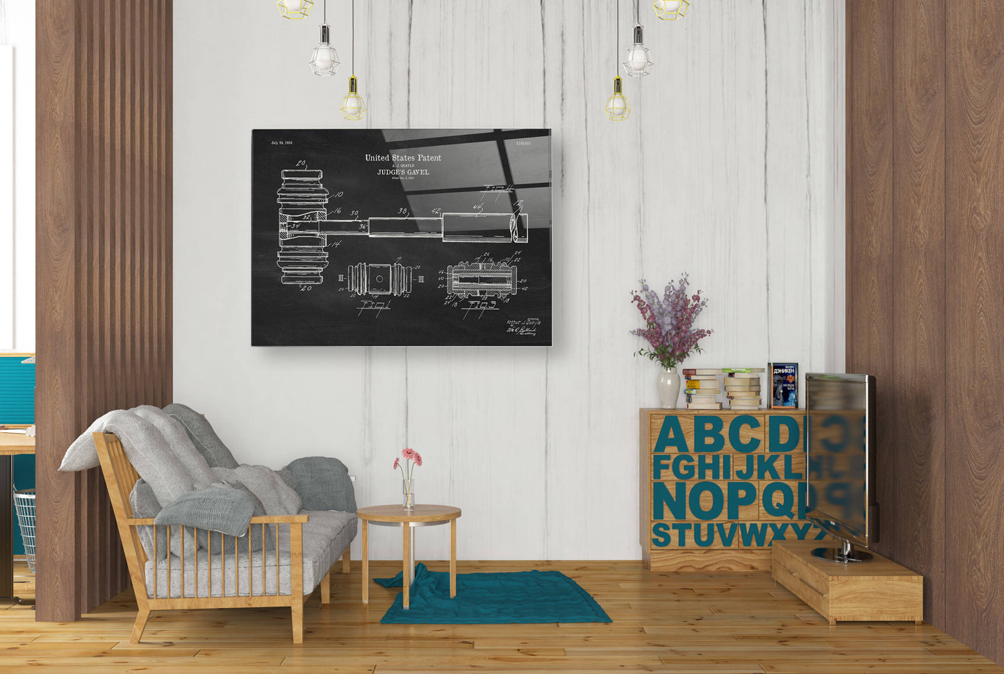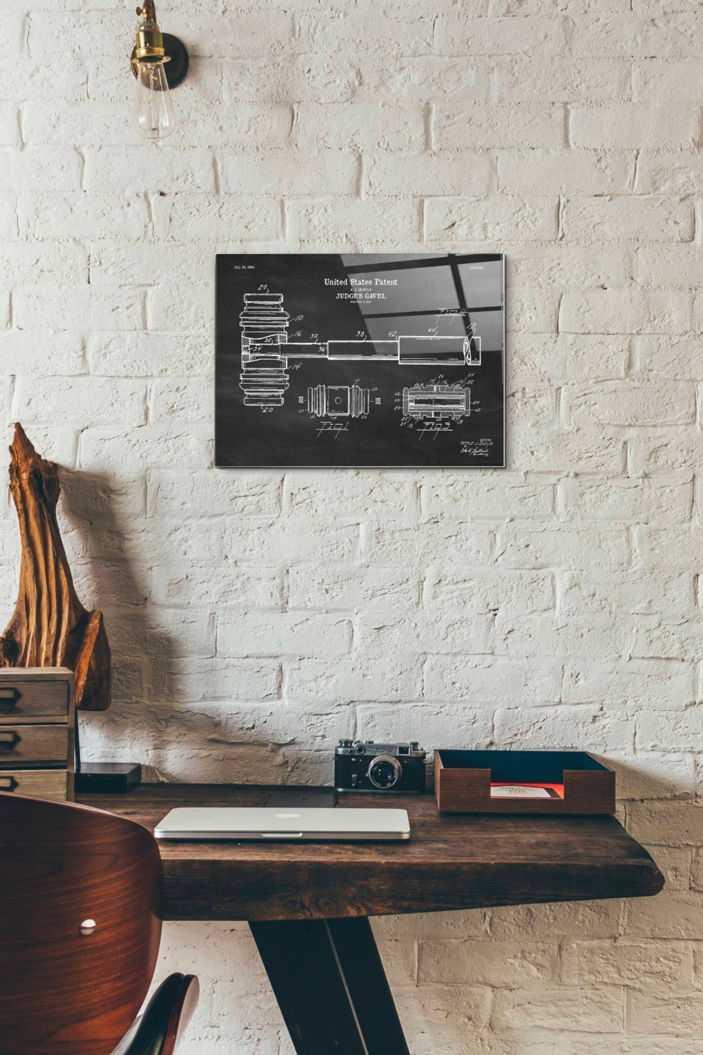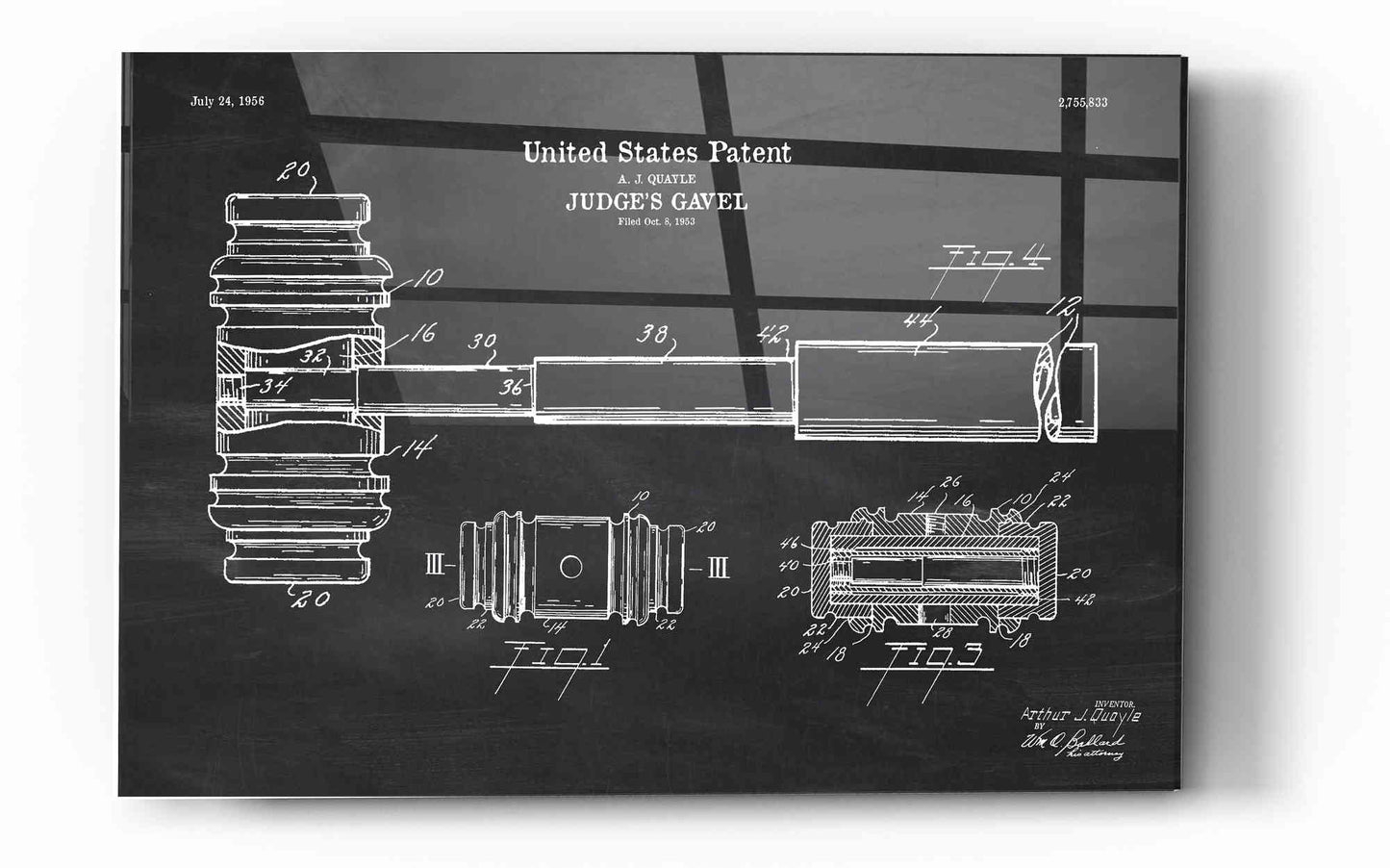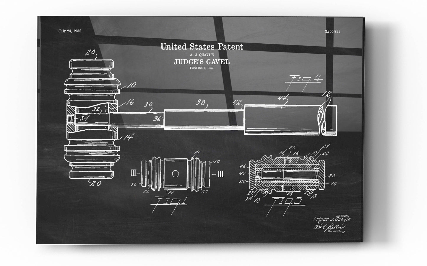 Judges Gavel Blueprint Patent Chalkboard printed on crystal clear acrylic glass. Official US Patent remastered by Epic Art. Available on blackboard or parchment background.