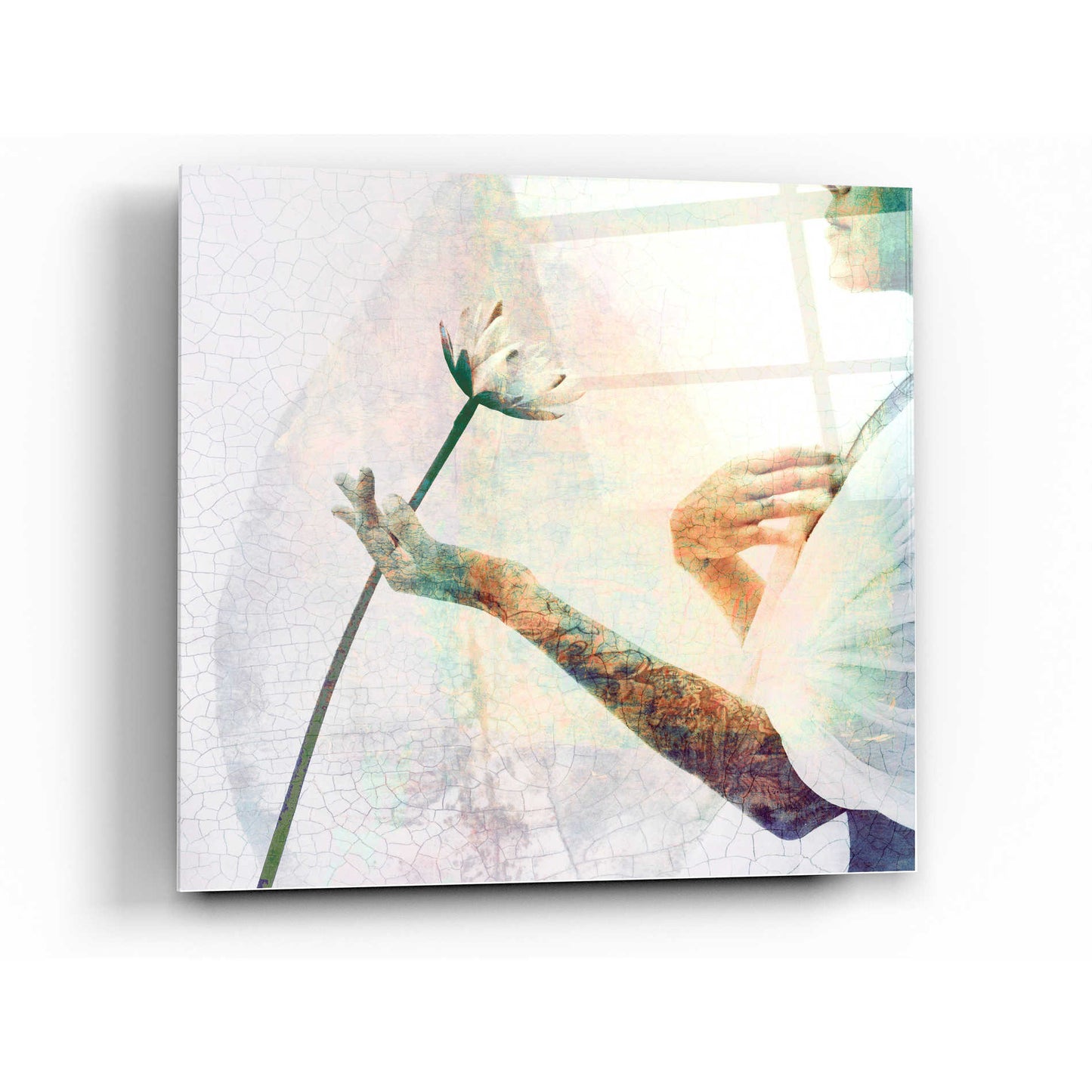"Knowledge From The Heart" by Elena Ray printed on crystal clear acrylic glass. Featuring an illuminated woman and a lotus flower blossom. A serene addition to your home or office.