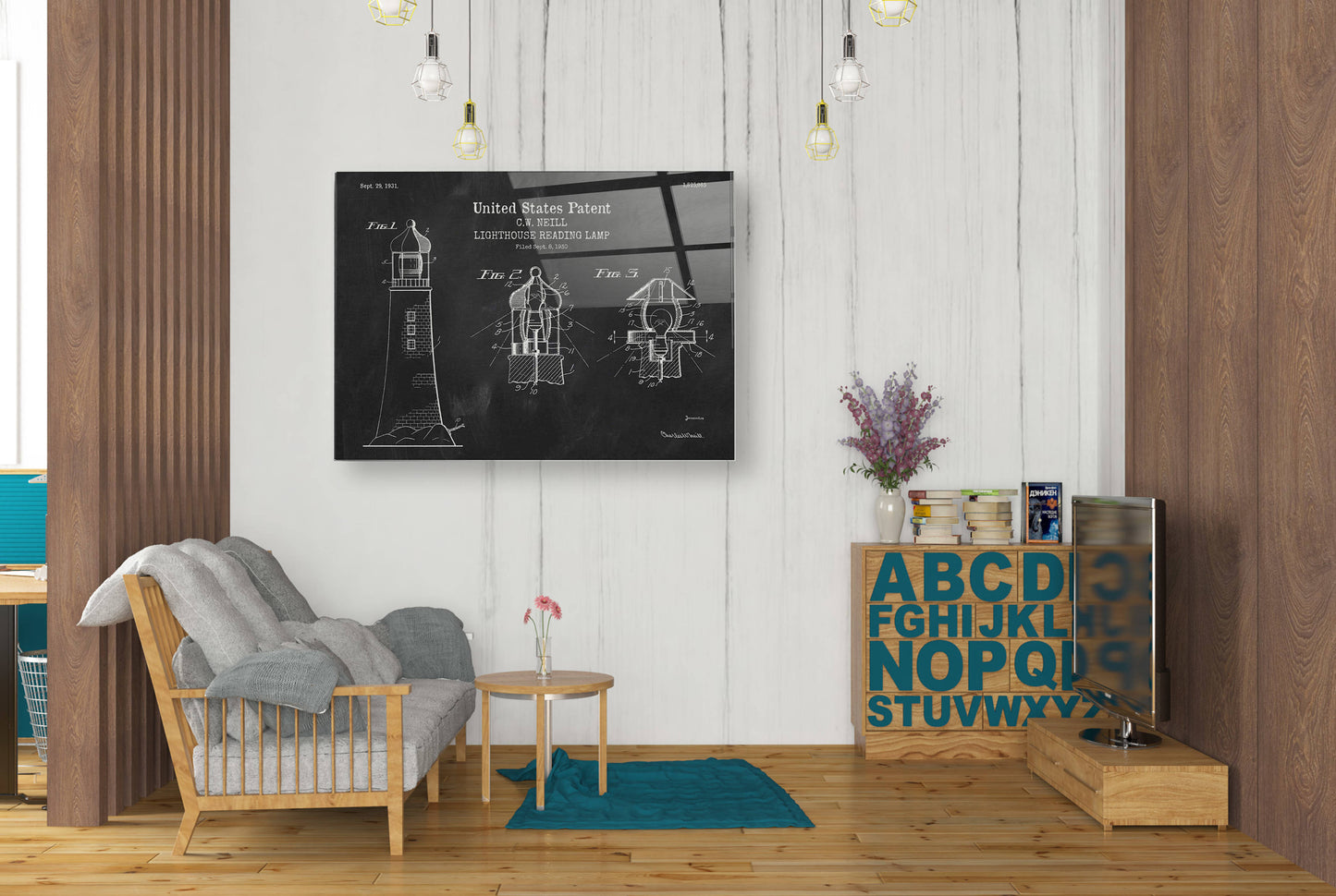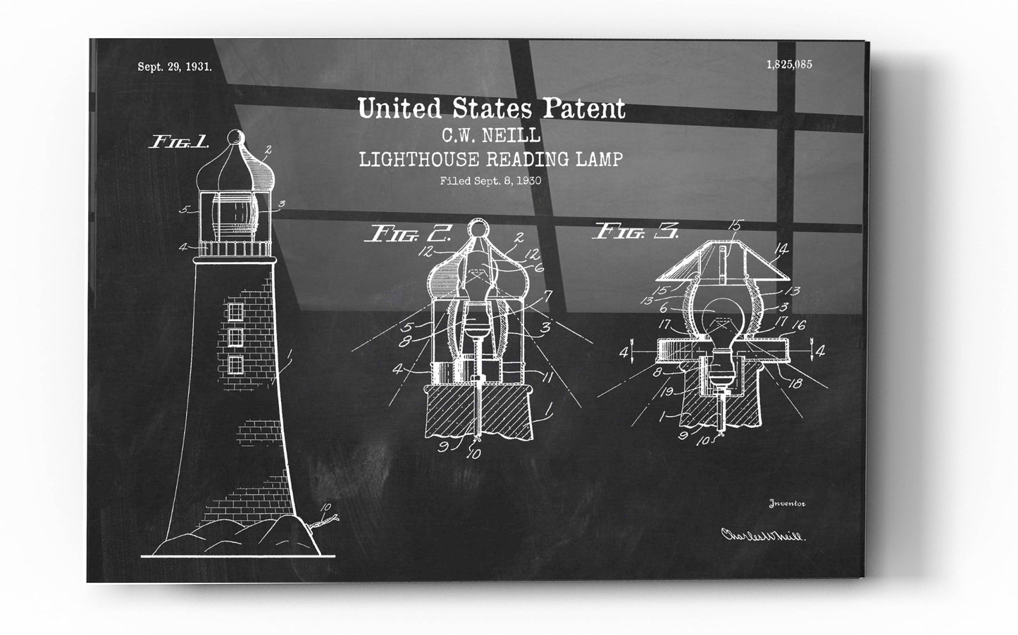 Lighthouse Reading Lamp Blueprint Patent Chalkboard printed on crystal clear acrylic glass. Official US Patent remastered by Epic Art. Available on blackboard or parchment background.