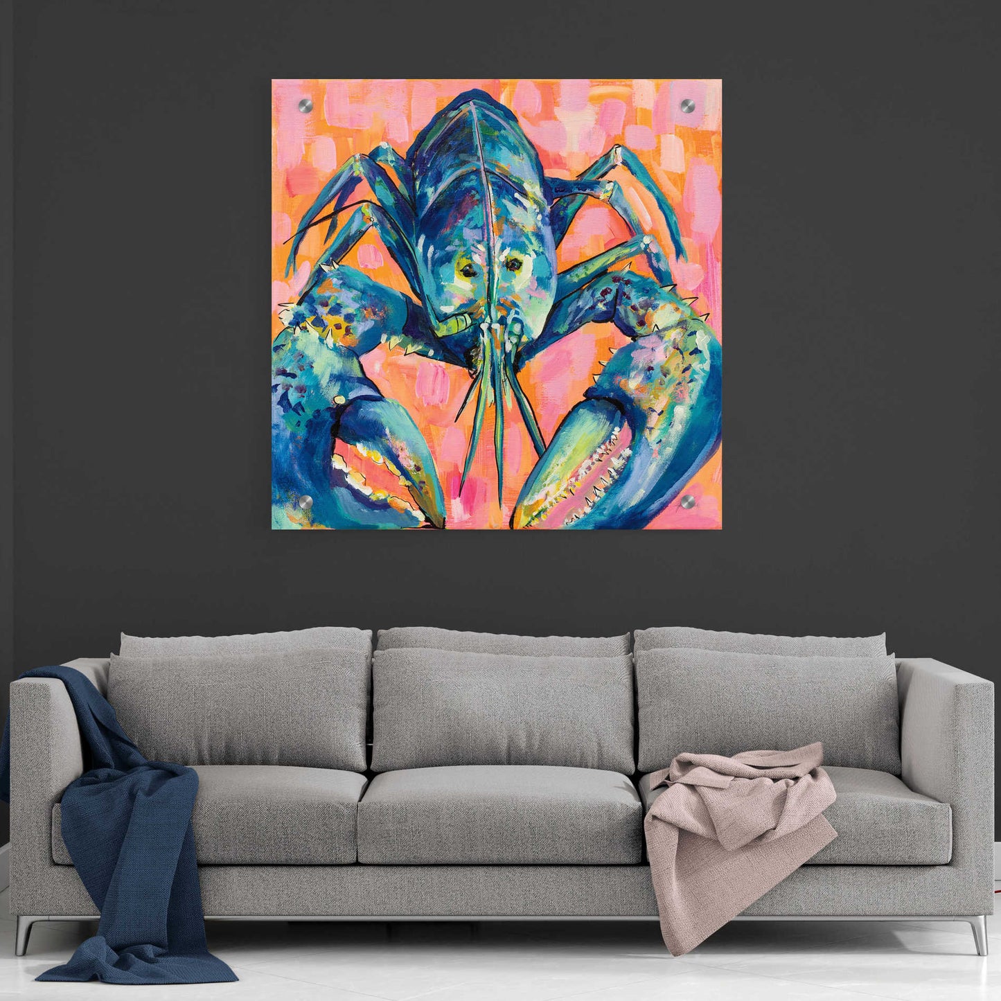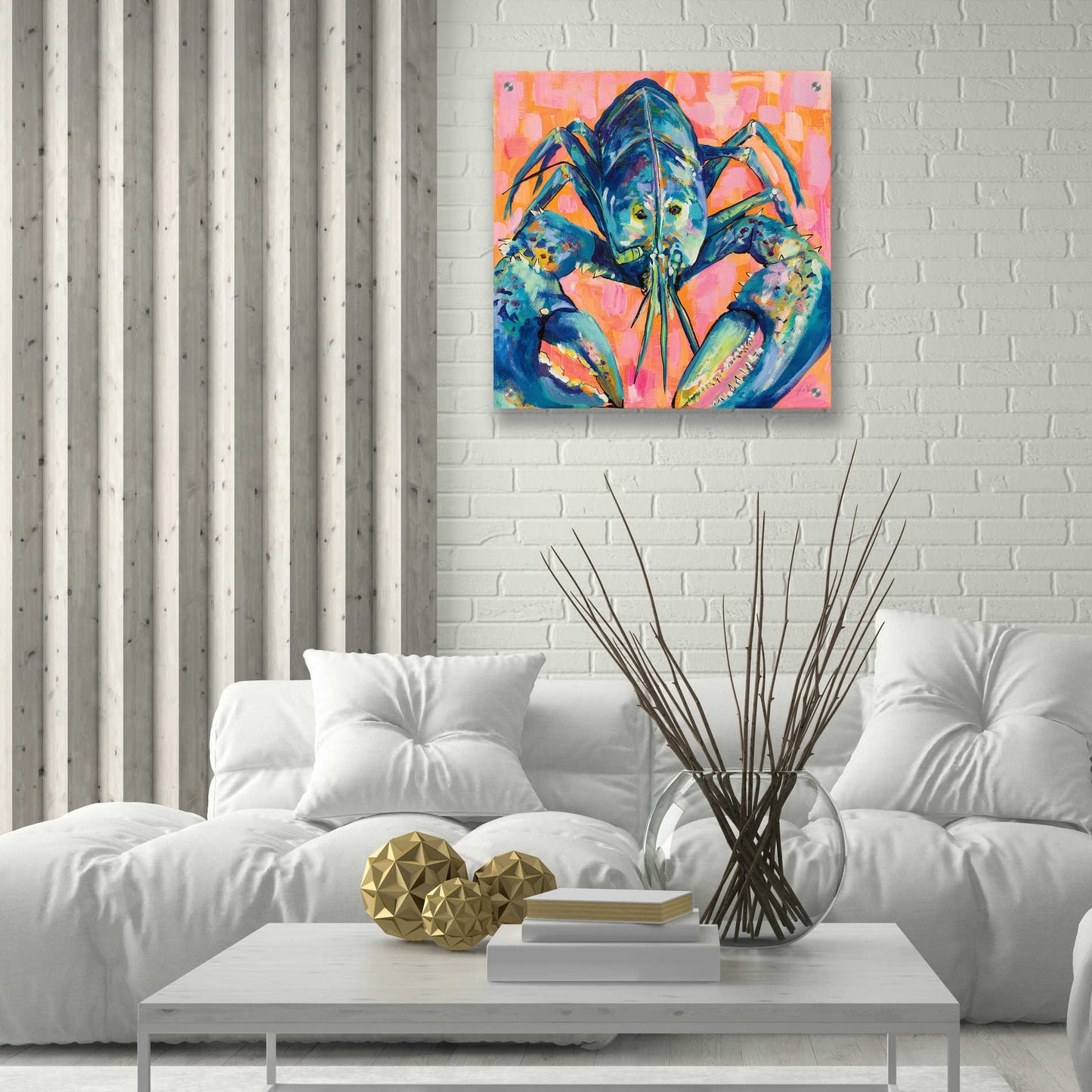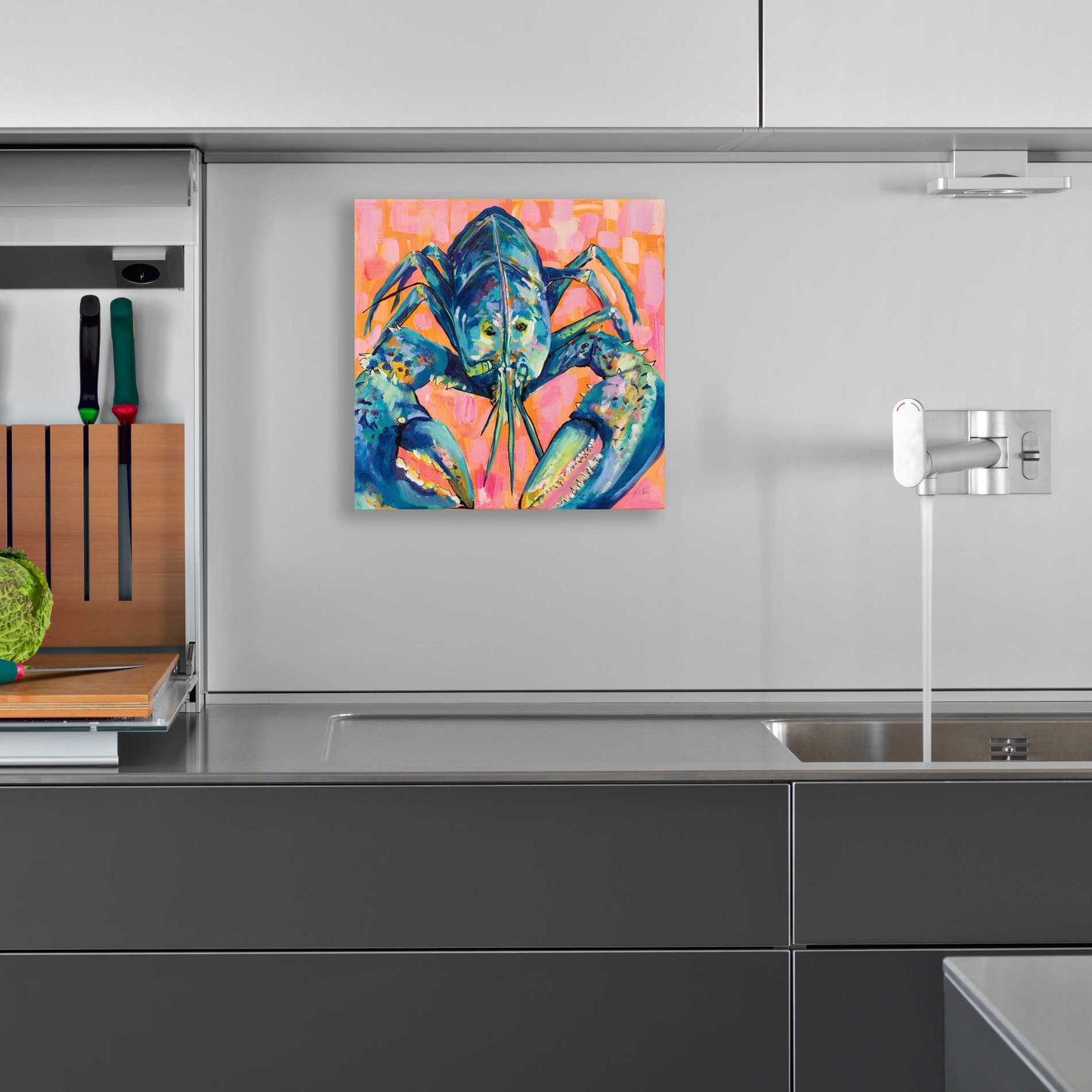 "Lilly Lobster I" by Jeanette Vertentes. Jeanette's contemporary paintings pay homage to North Stonington, Connecticut, where she lives with her dogs and gardens. She adds each artwork vibrancy with the use of color, texture, movement and bold compositions. As a child, she trained under the painter John Lutes. She earned a Bachelor of Fine Art with a concentration in painting from Rhode Island College. You can find Jeanette's work displayed throughout spring and summer. She teaches throughout the winter and works on commissions worldwide. Acrylic wall art looks amazing in your home or business. Printed on the back of the acrylic giving it depth and easy maintenance. The highly durable and hard-to-damage qualities make high definition acrylic the ideal wall art for hotels, rental properties, and restaurants. Now Epic Art brings you unmatched value in contemporary wall decor for your home as well. From small sizes to extra large sizes, it is easy to hang, won't shatter like glass if it ever falls down, and is easy to maintain. Simply dust it off or use a damp soft cloth for cleaning.