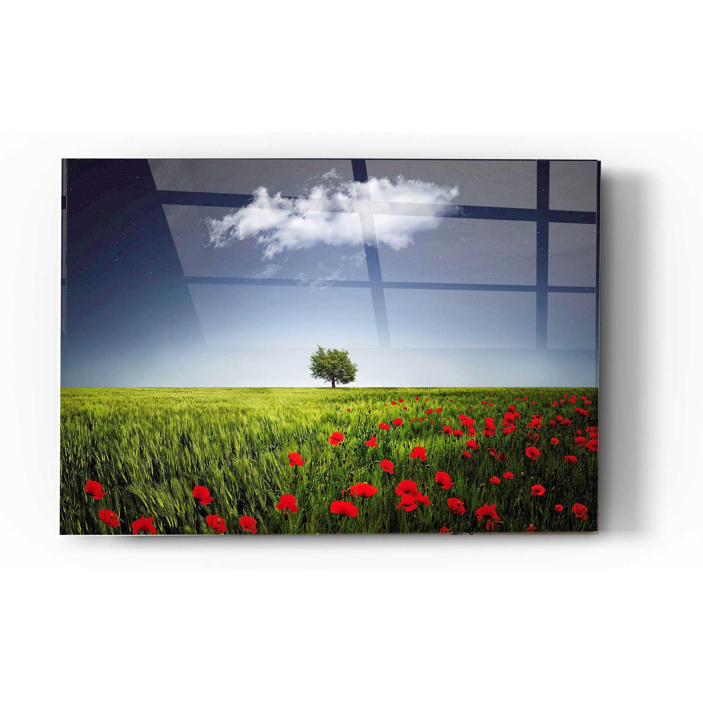 "Lone Tree in a Poppy Field" by Epic Graffiti Portfolio printed on crystal clear acrylic glass. Featuring a tree in a field of poppies with a looming cloud.