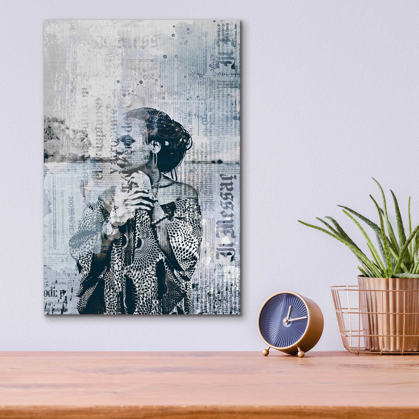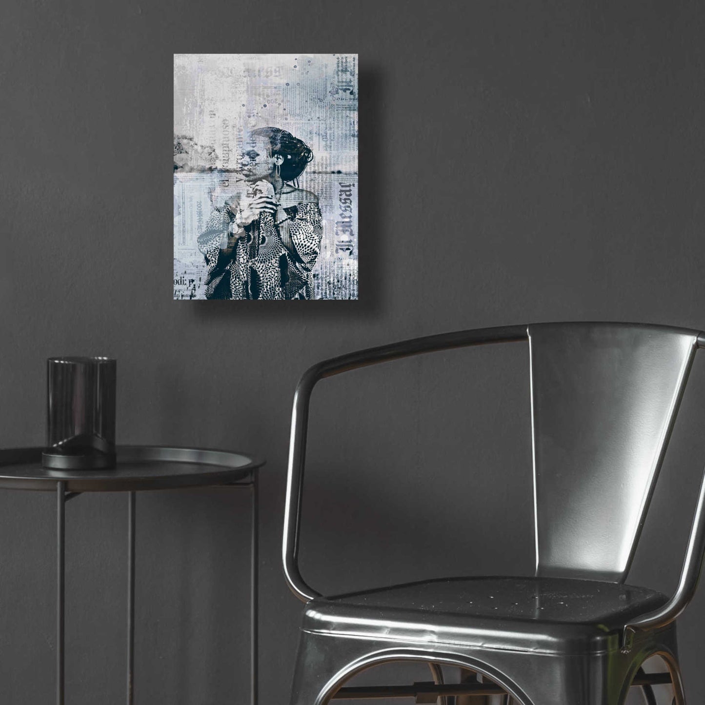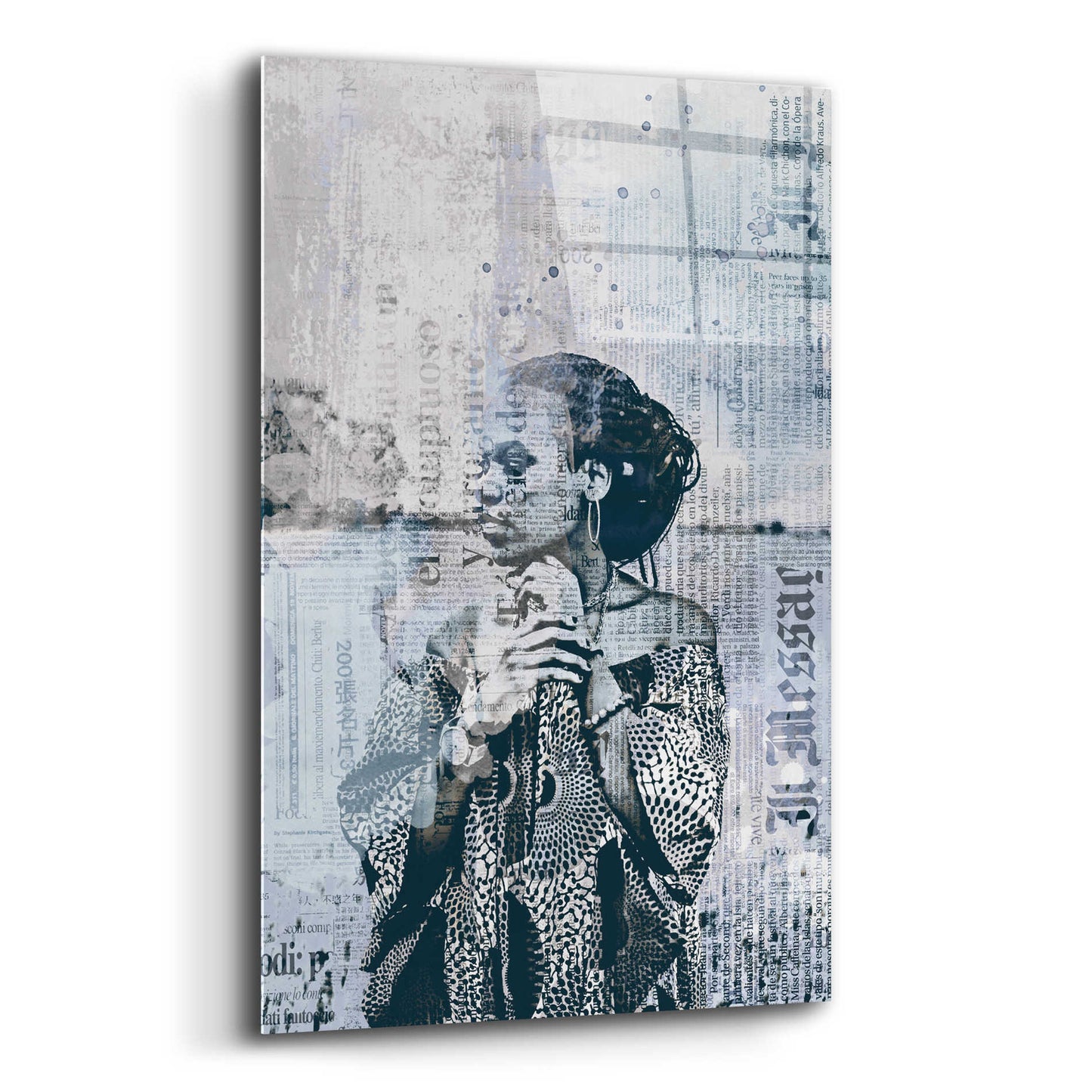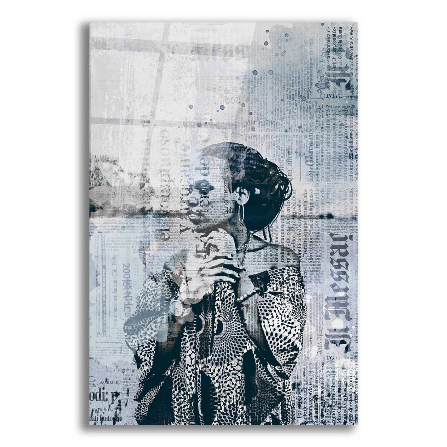 Blue grey mixed media art of modern woman with newspaper and headline fragments