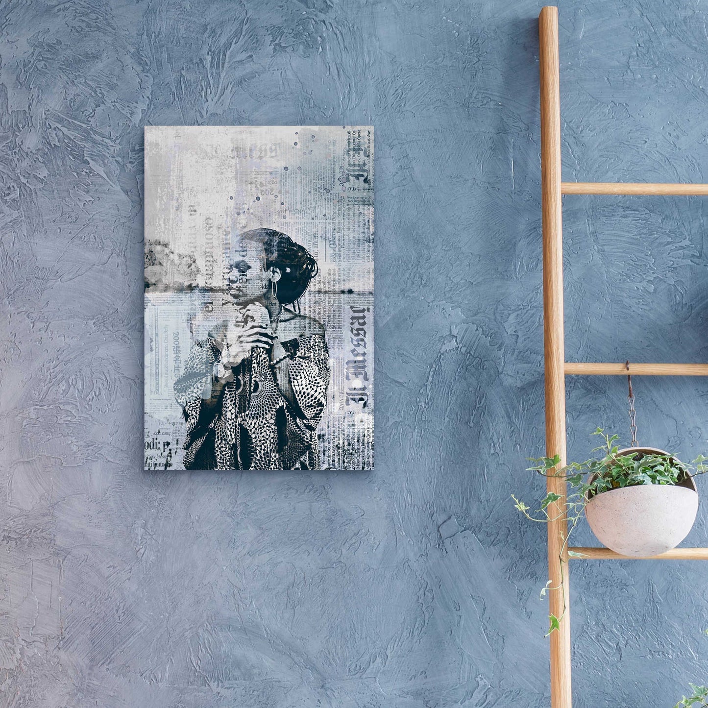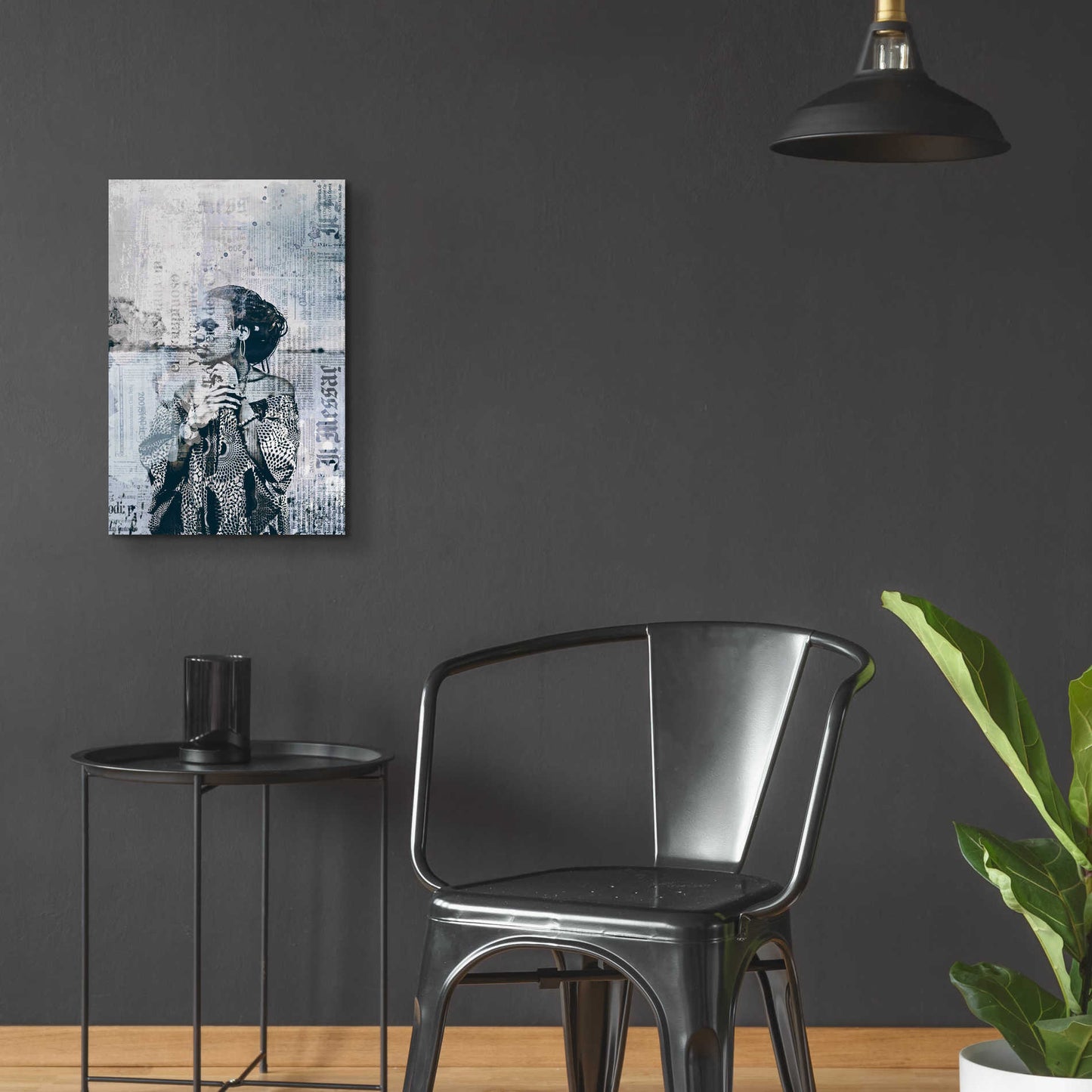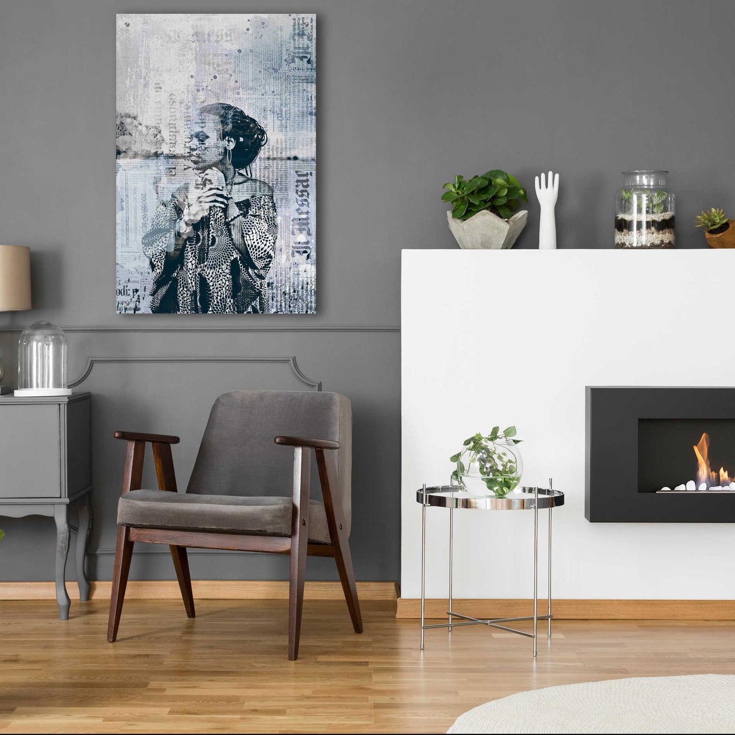 Blue grey mixed media art of modern woman with newspaper and headline fragments