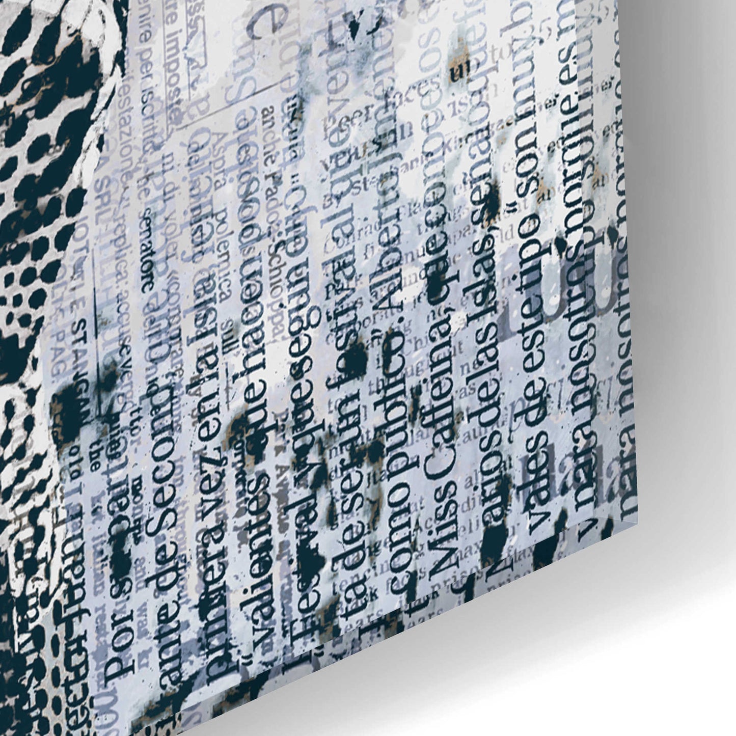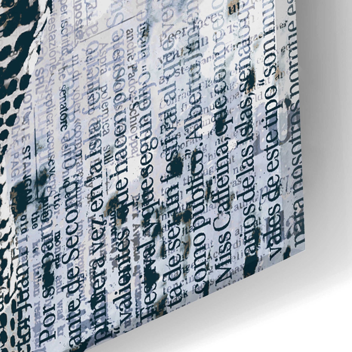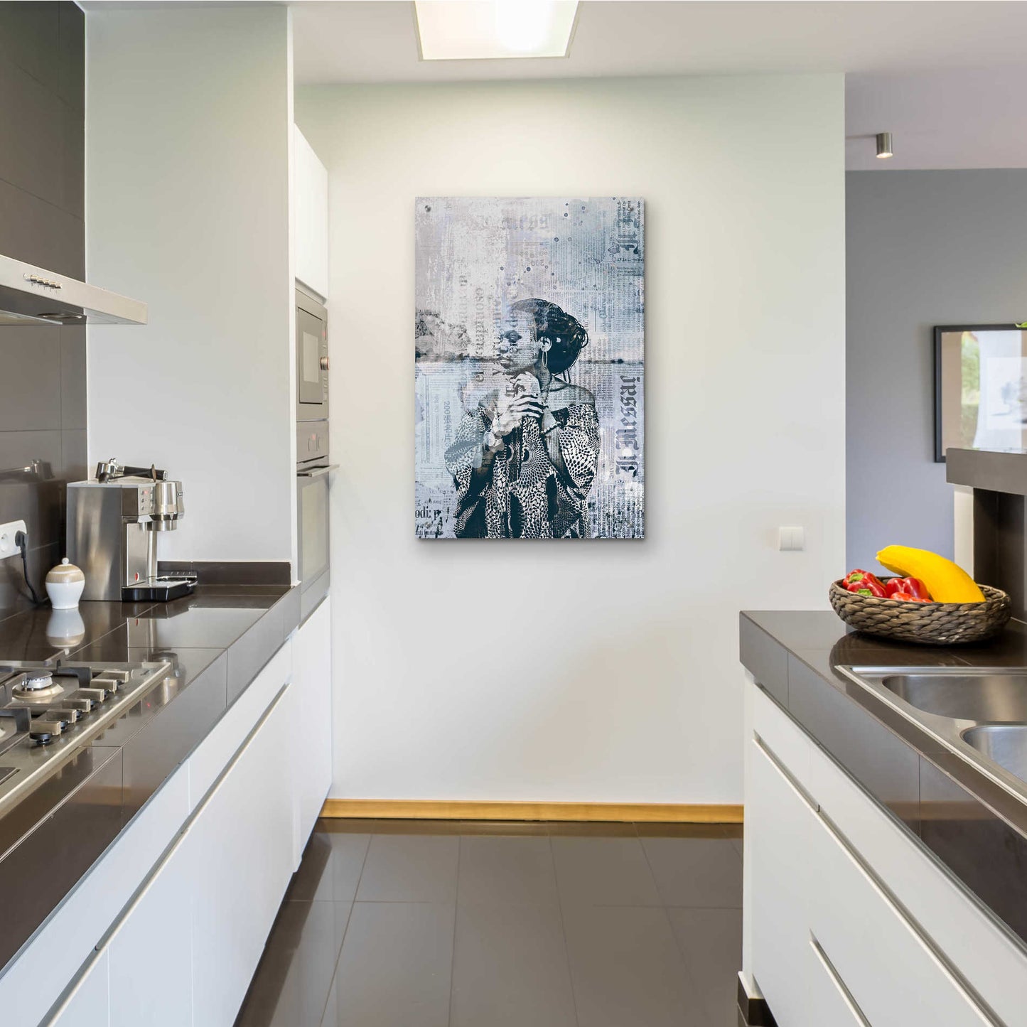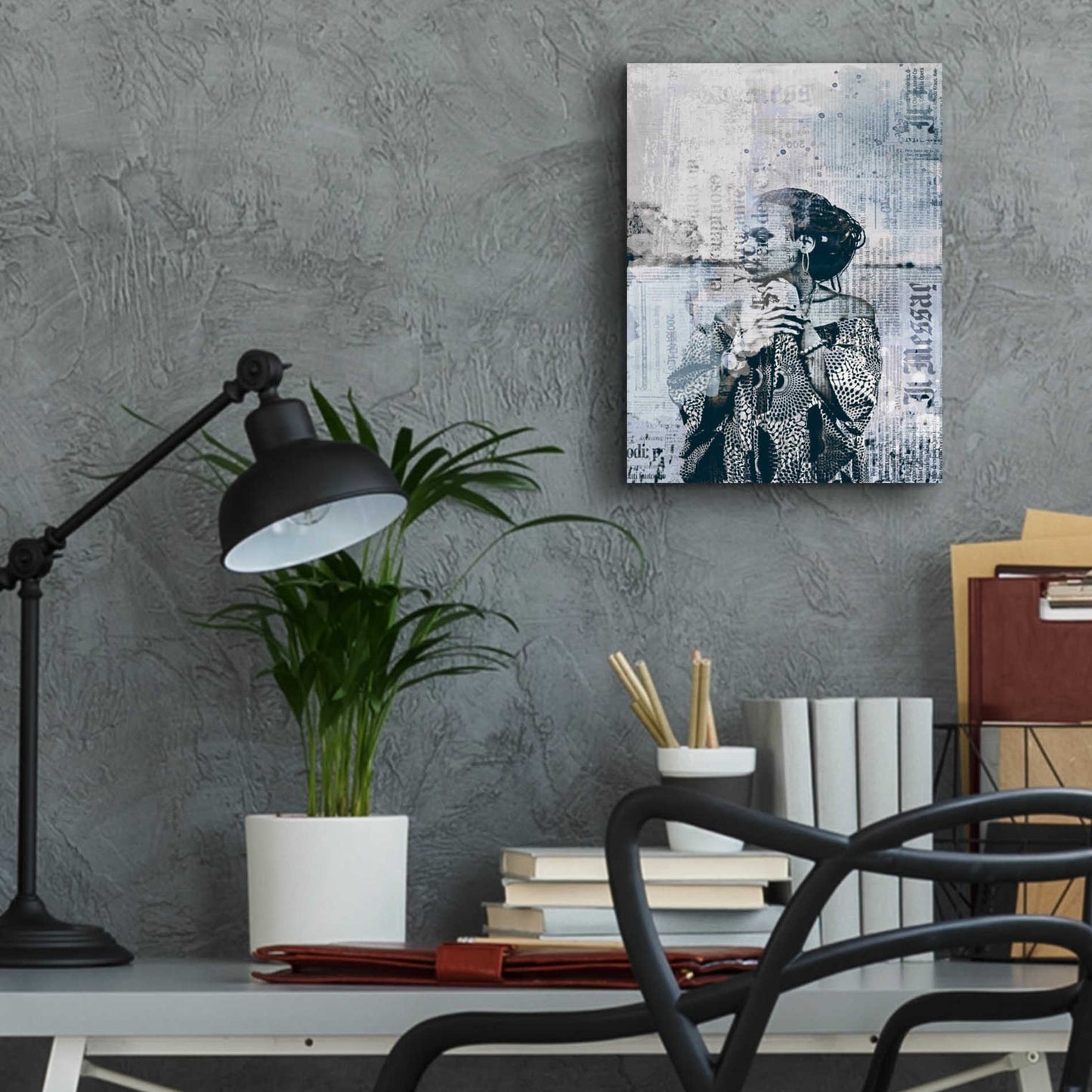 Blue grey mixed media art of modern woman with newspaper and headline fragments