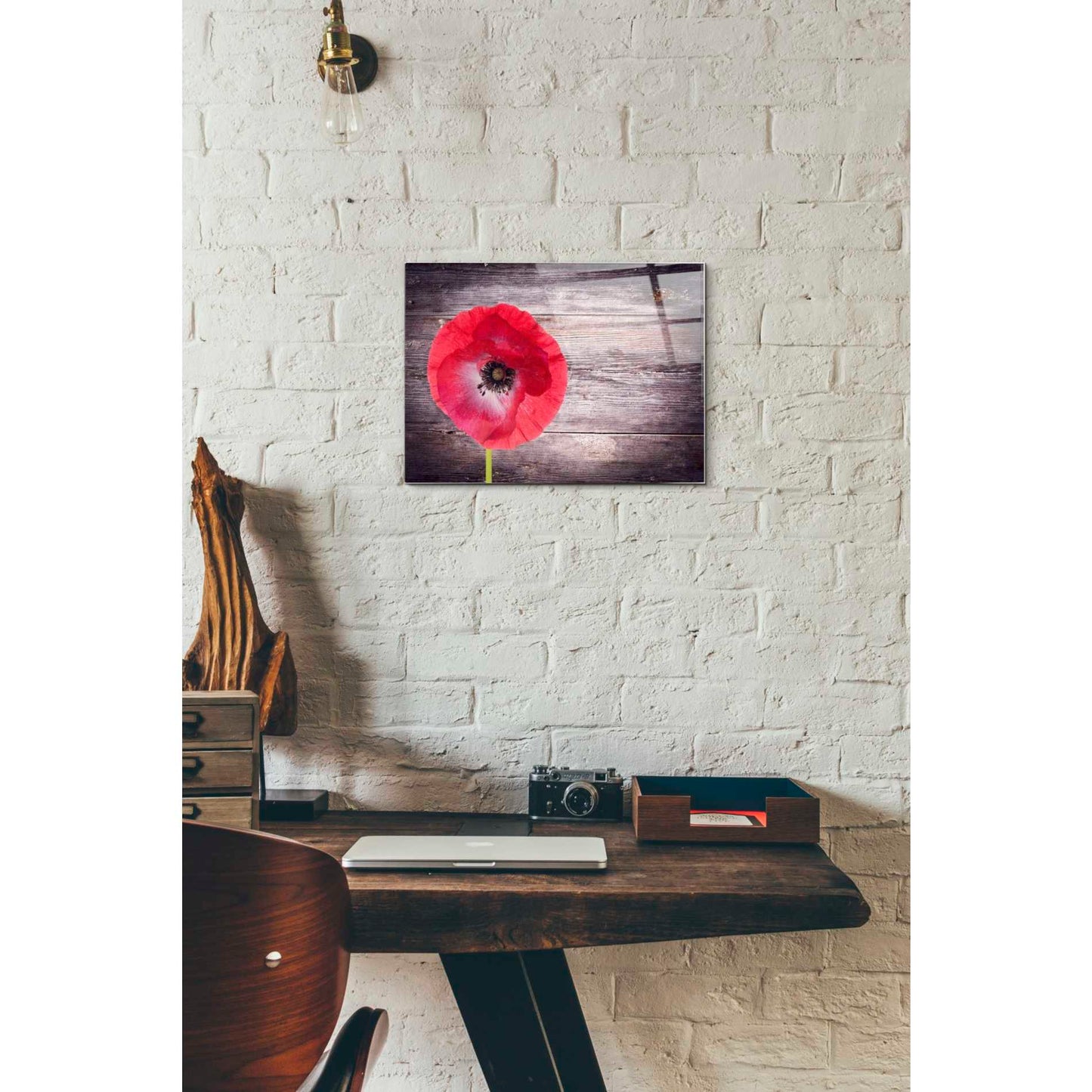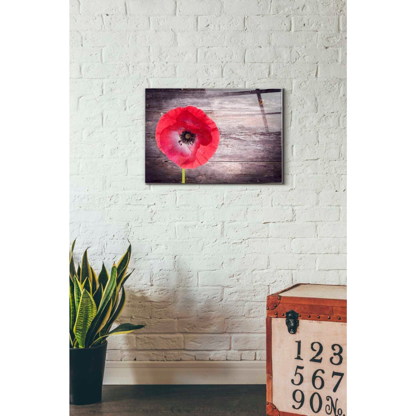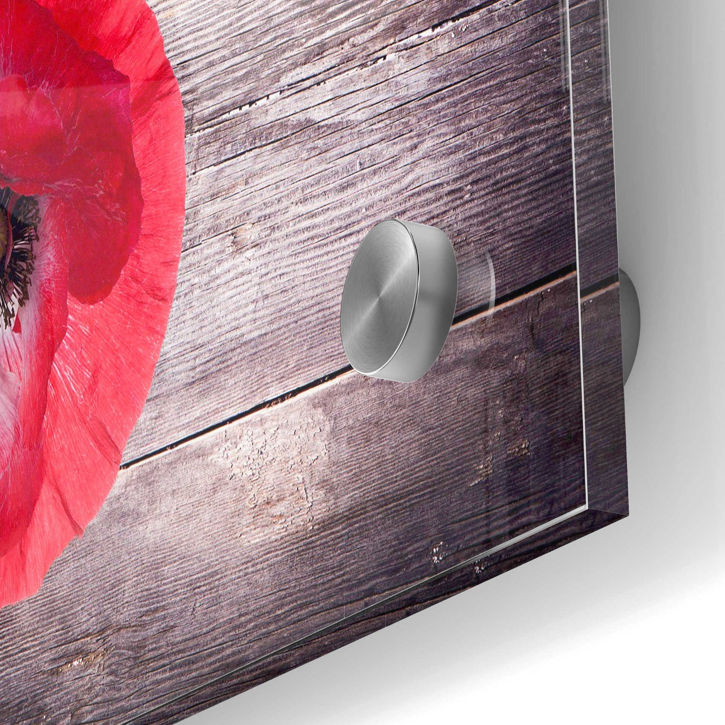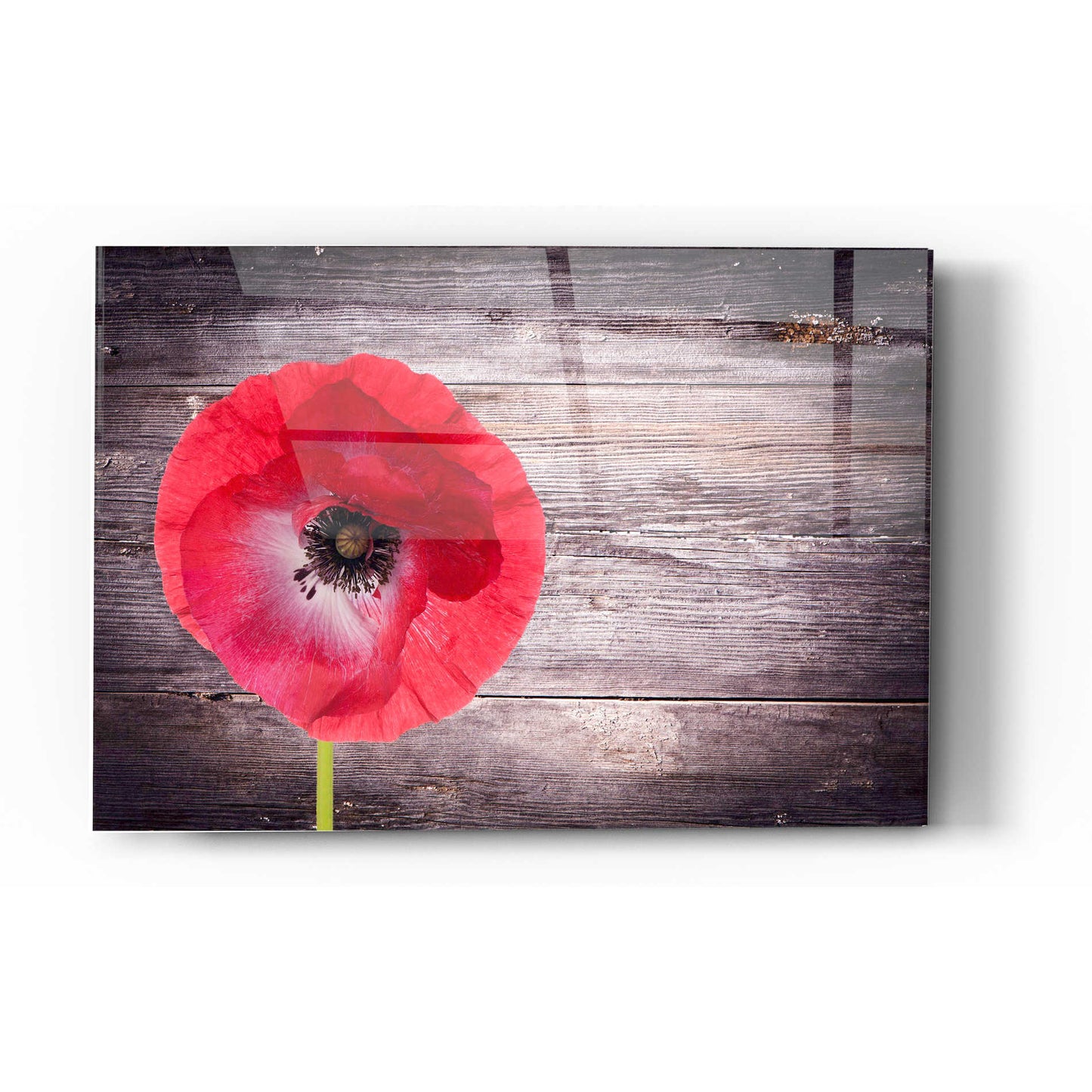 "Luxury On Rustic" by Epic Graffiti Portfolio printed on crystal clear acrylic glass. Featuring a red poppy on wood panels with vignette borders.