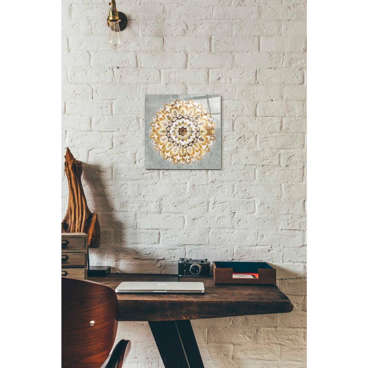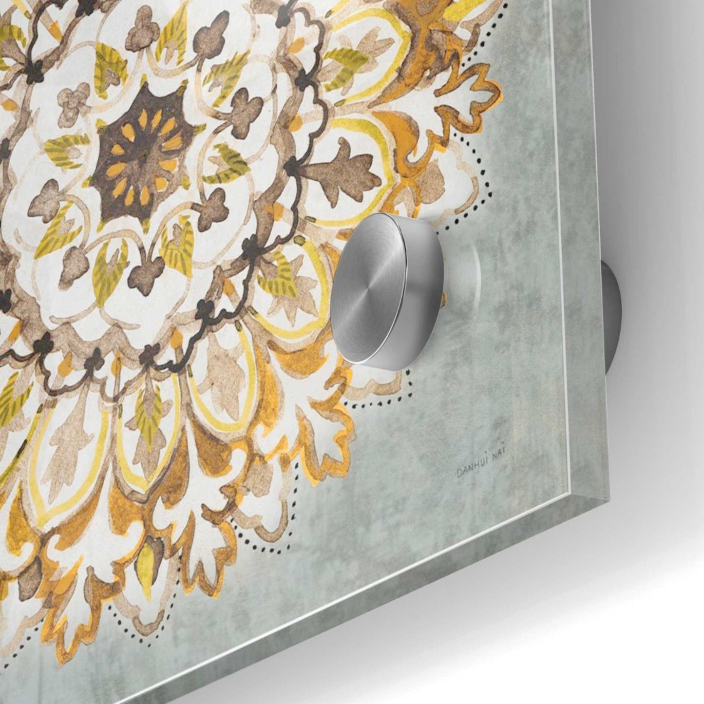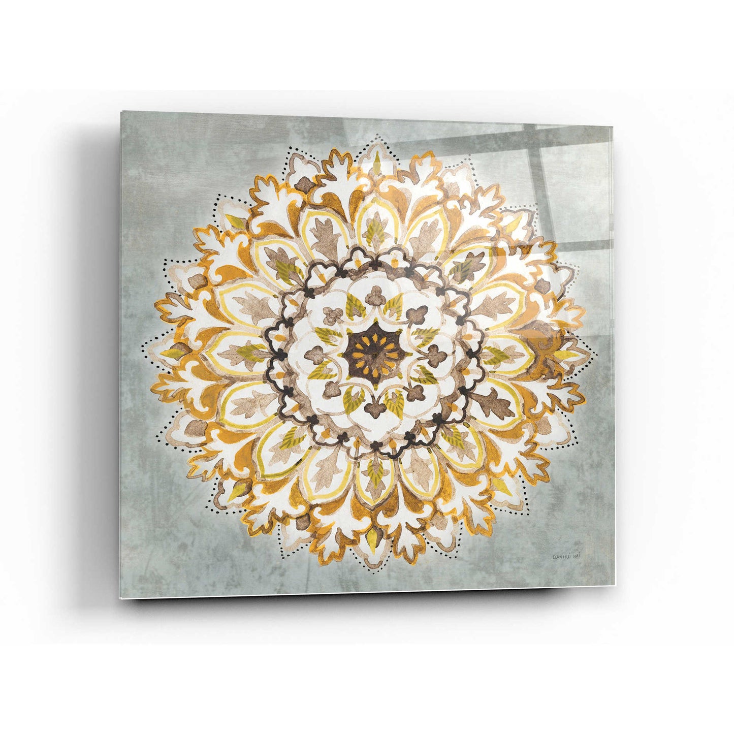 "Mandala Delight II Yellow Grey" by Danhui Nai printed on crystal clear acrylic glass.