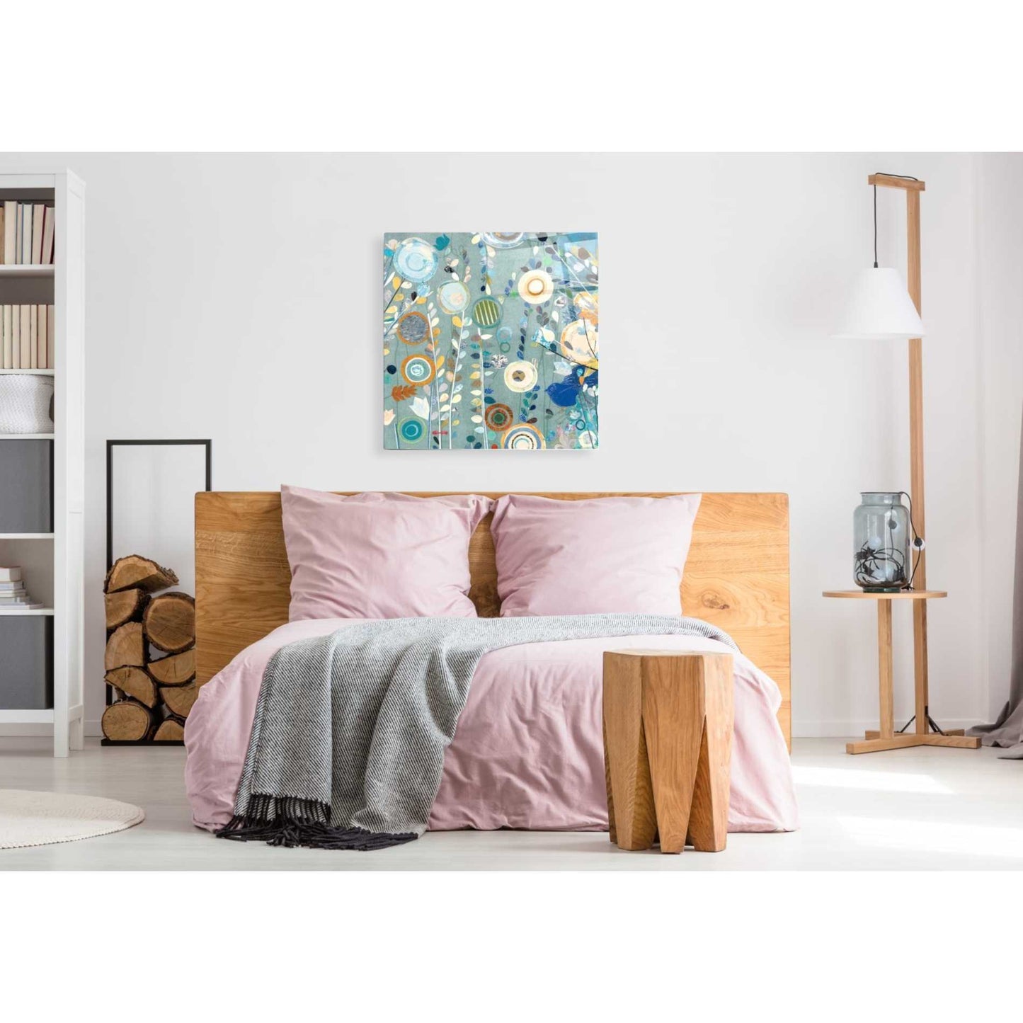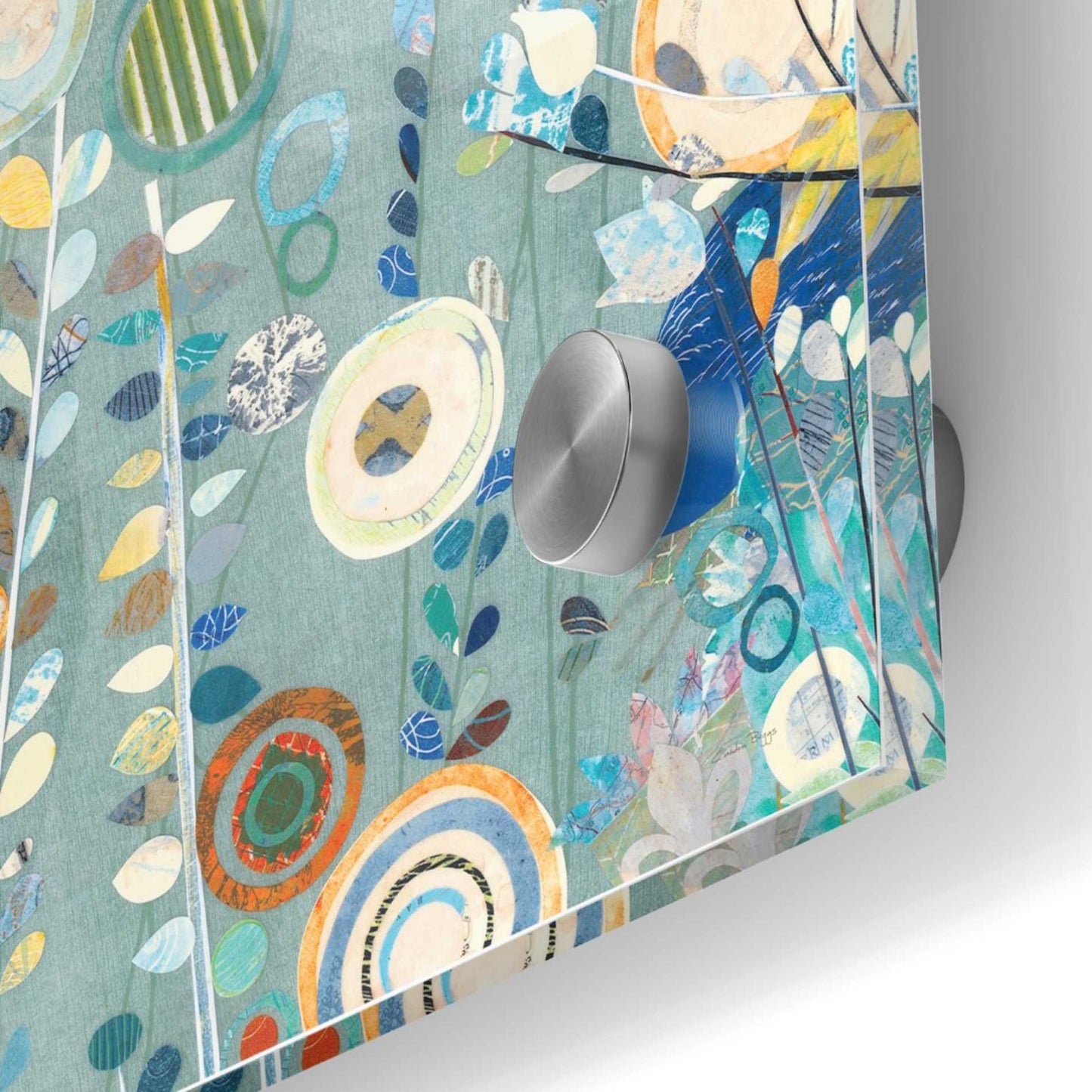 "Ocean Garden II" by Candra Boggs printed on crystal clear acrylic glass. Featuring an abstract painting of flowers. This is made up of circles and bright colors creating the view of flowers in ocean tones.
