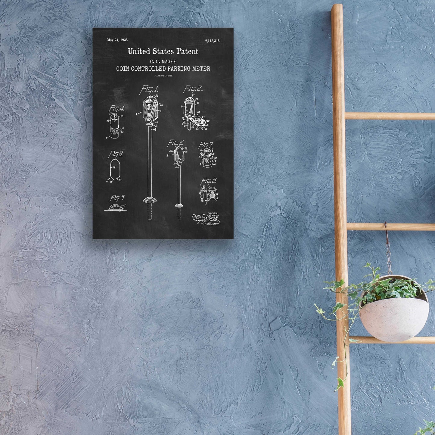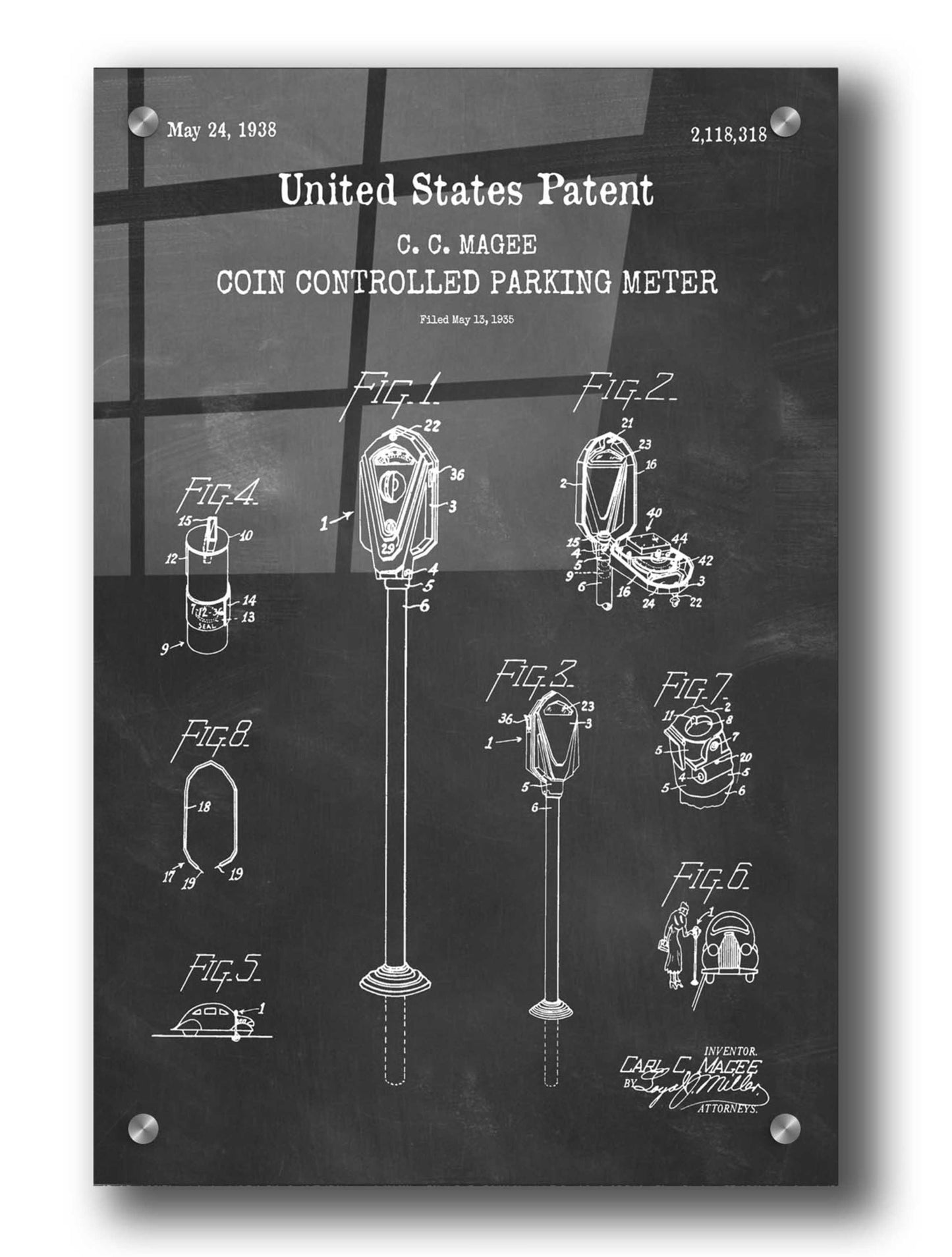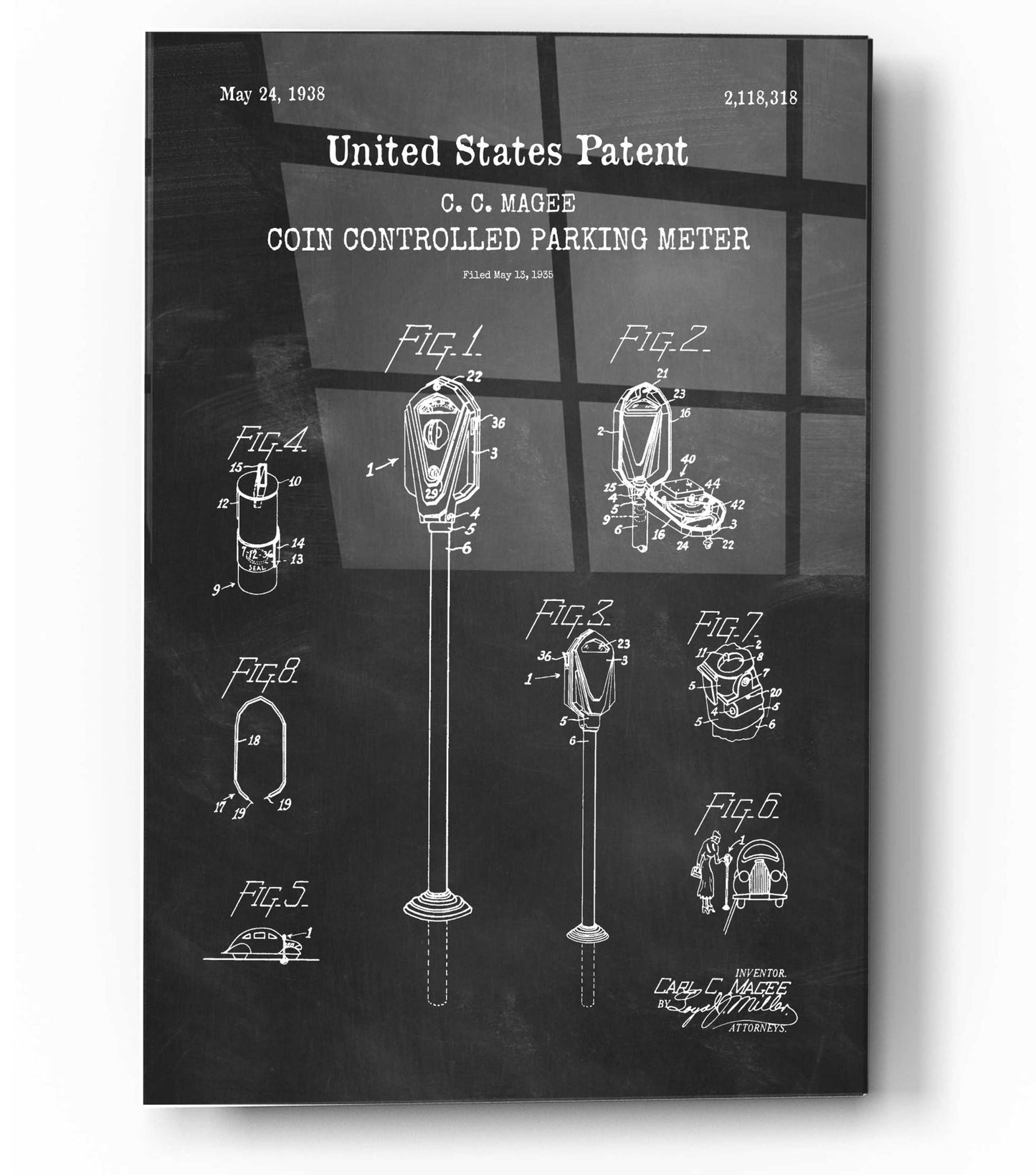 Parking Meter Blueprint Patent Chalkboard. An official US Patent remastered by Epic Art. Available on blackboard or parchment background.