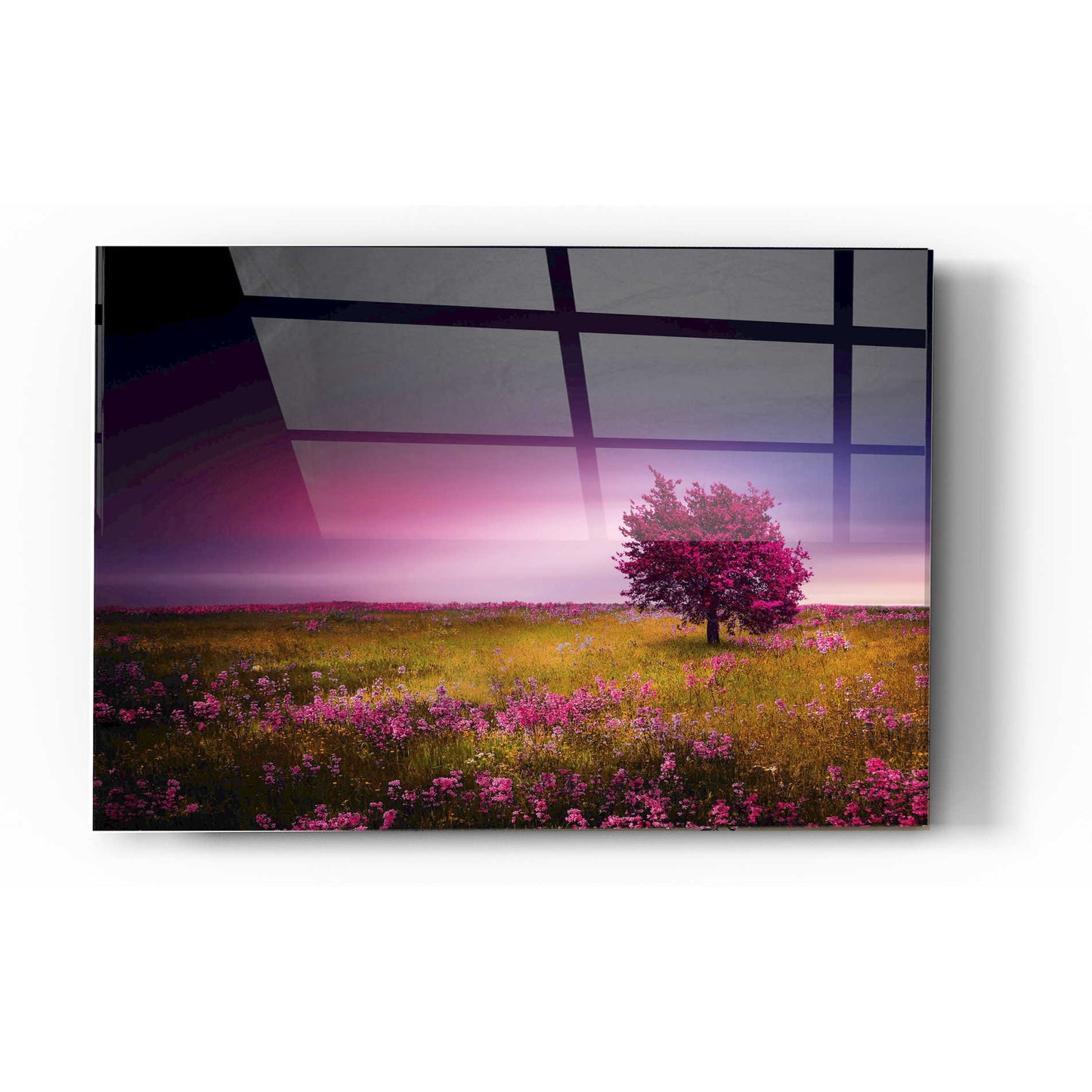 "Pink Nights" by Epic Graffiti Portfolio printed on crystal clear acrylic glass. Featuring a tree in a field of flowers bathed in a beautiful sky.