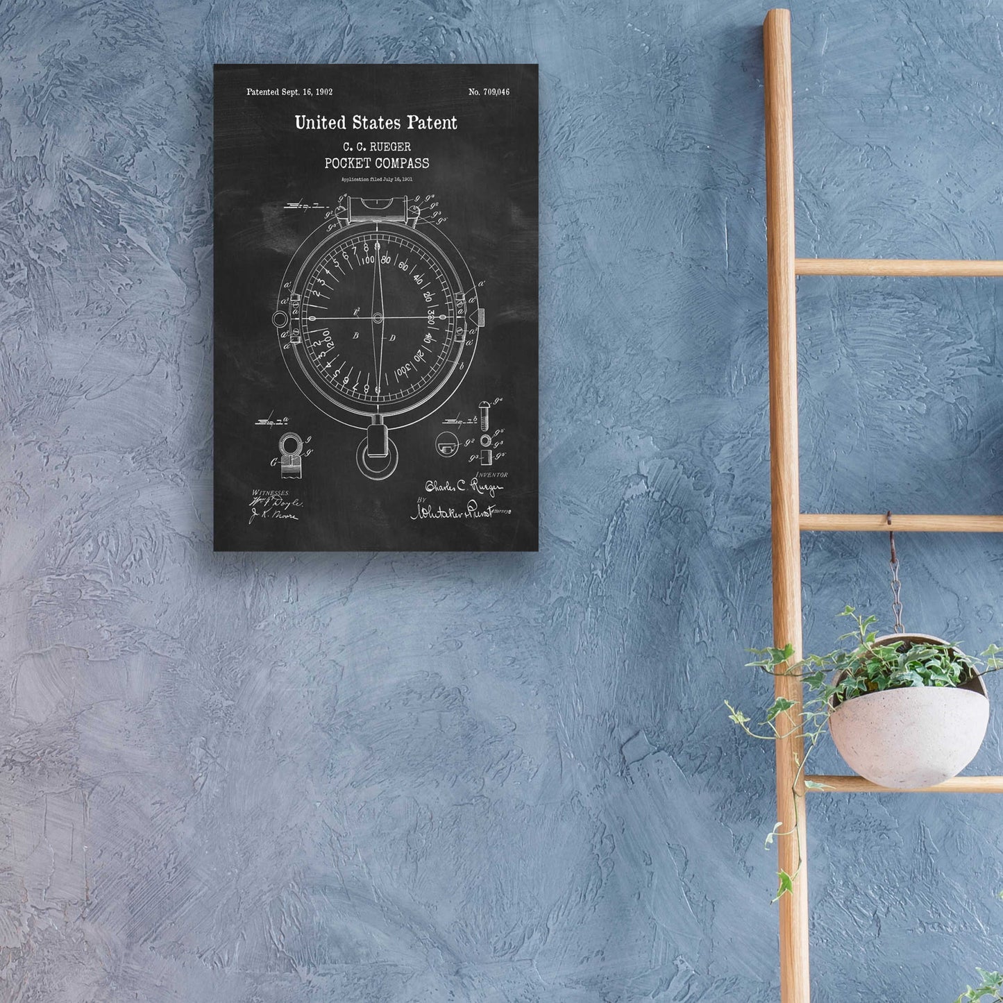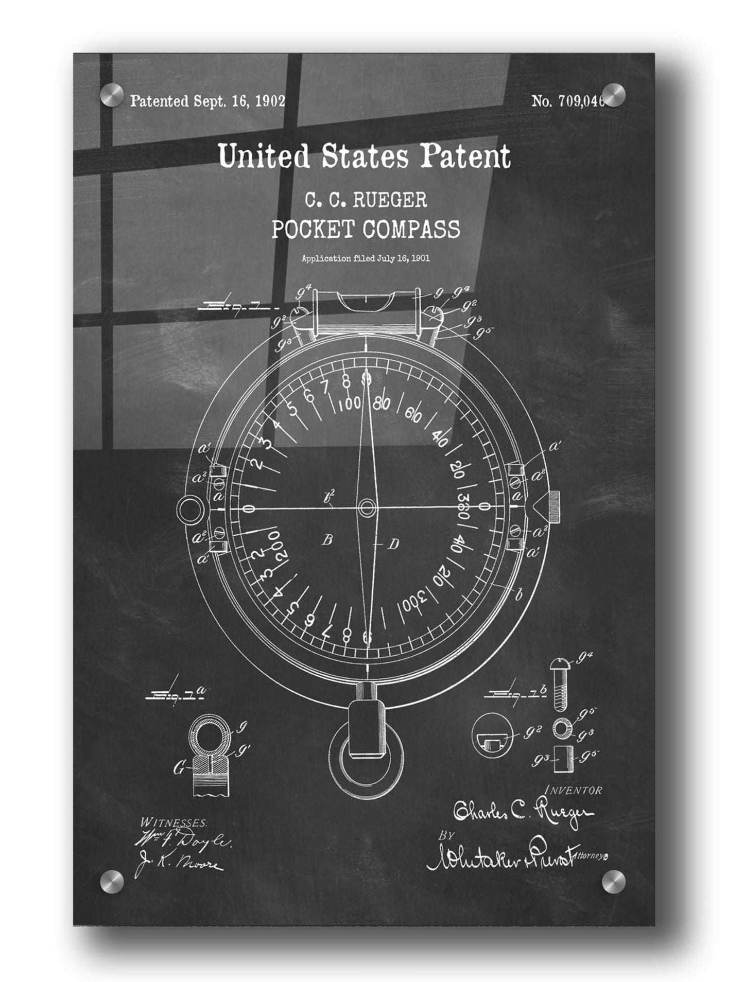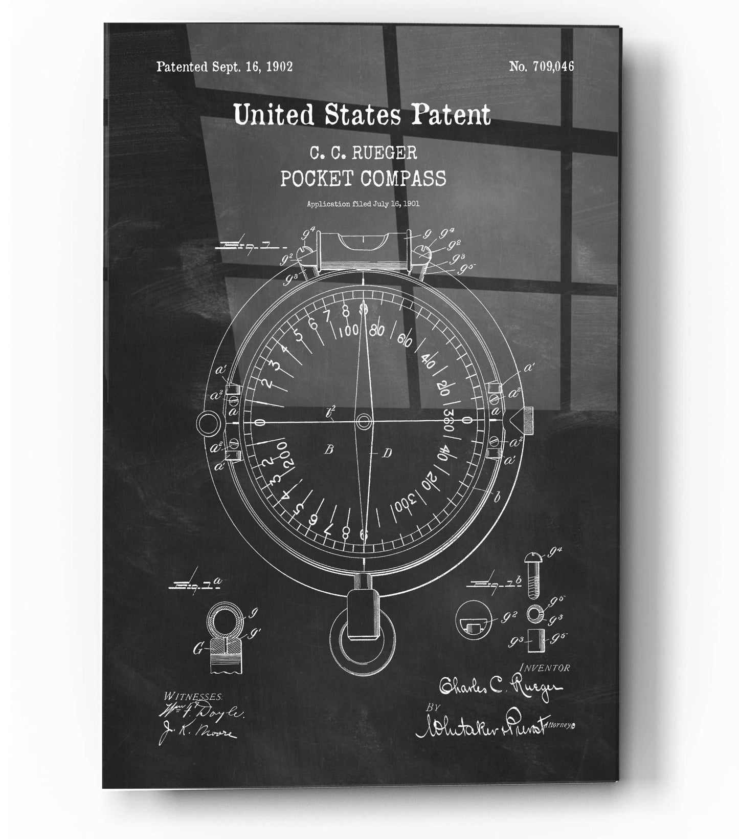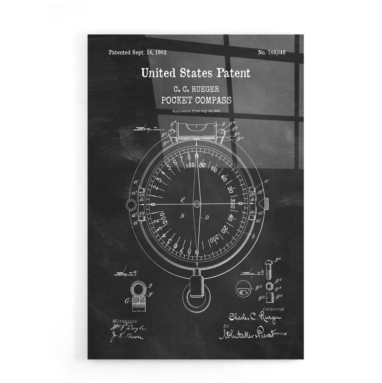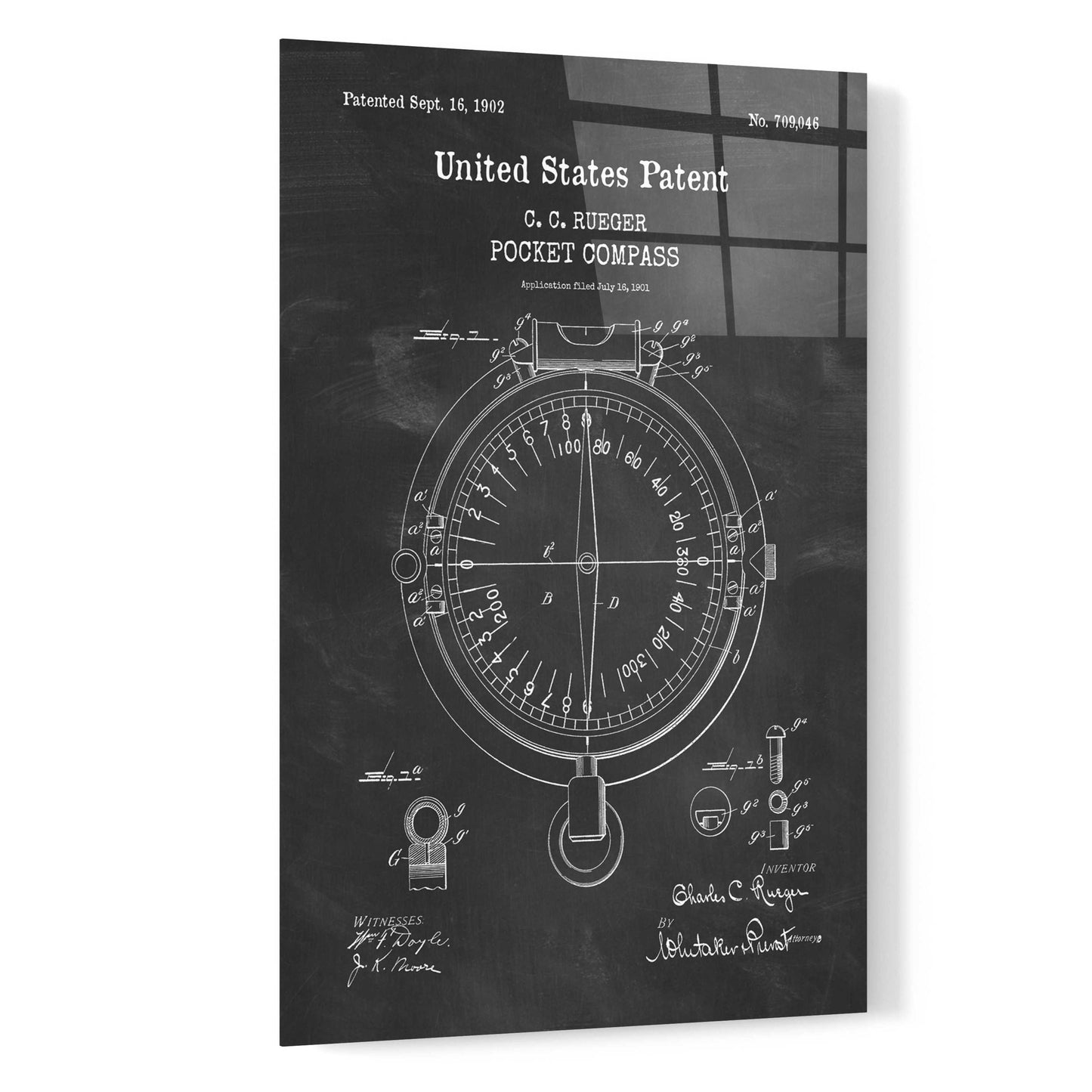 Pocket Compass Blueprint Patent Chalkboard. An official US Patent remastered by Epic Art. Available on blackboard or parchment background.
