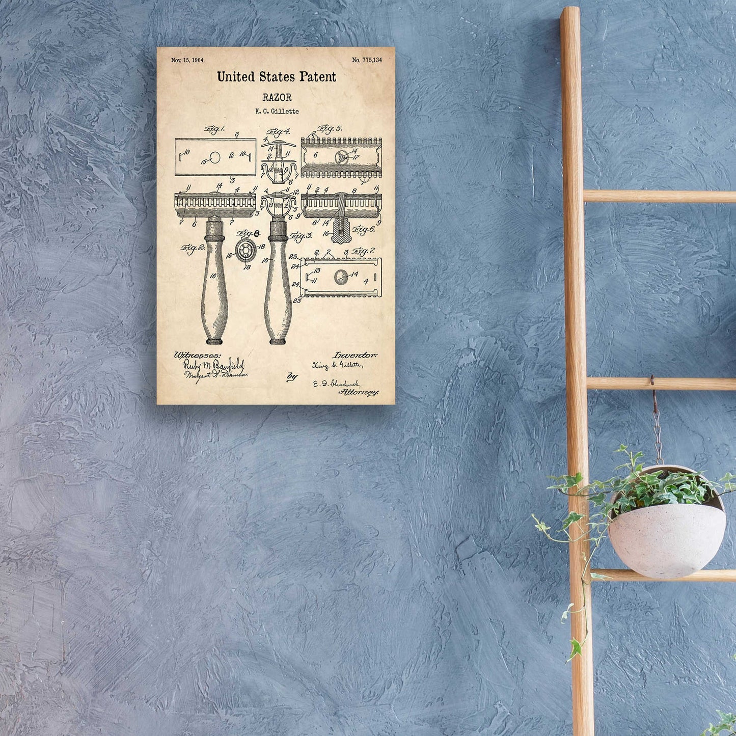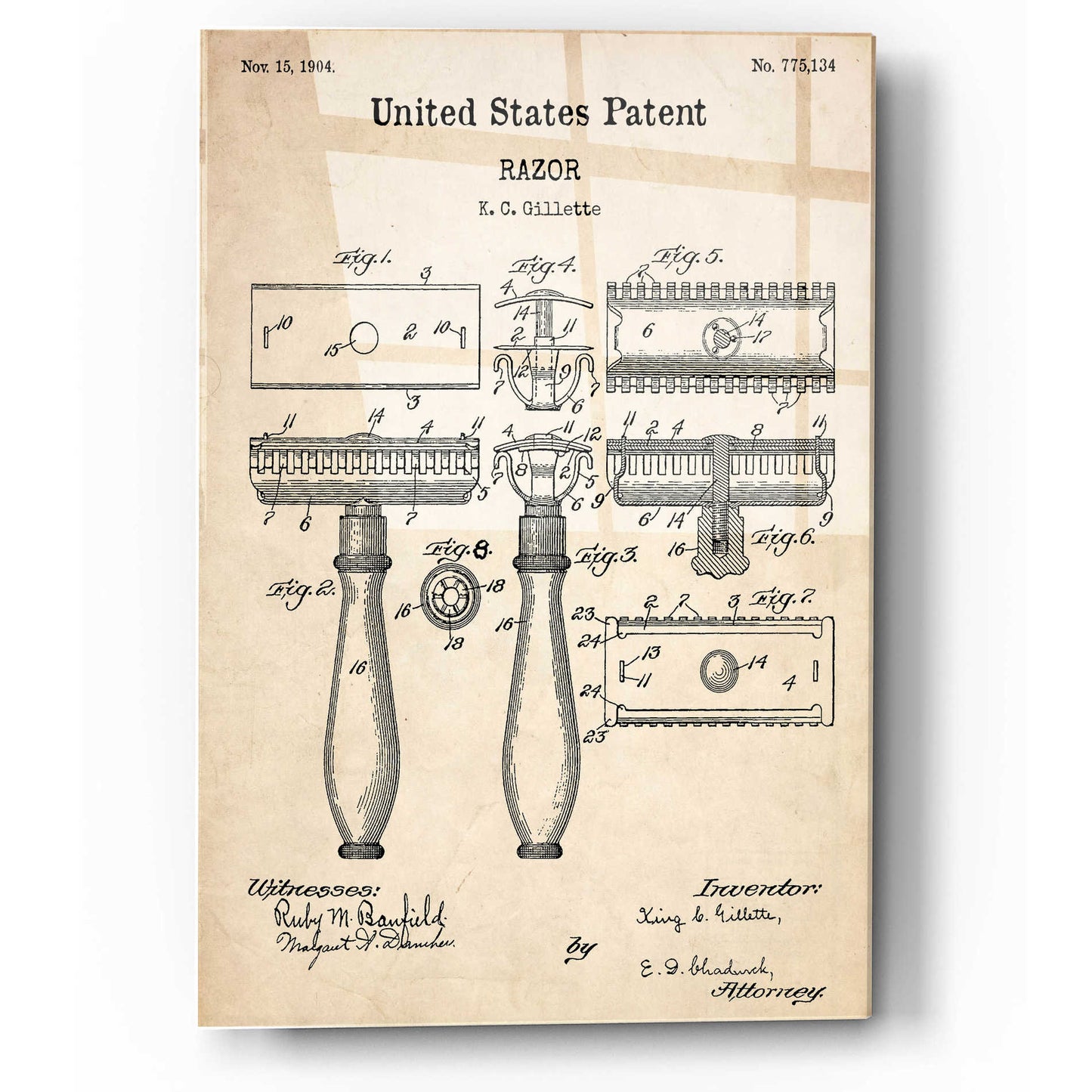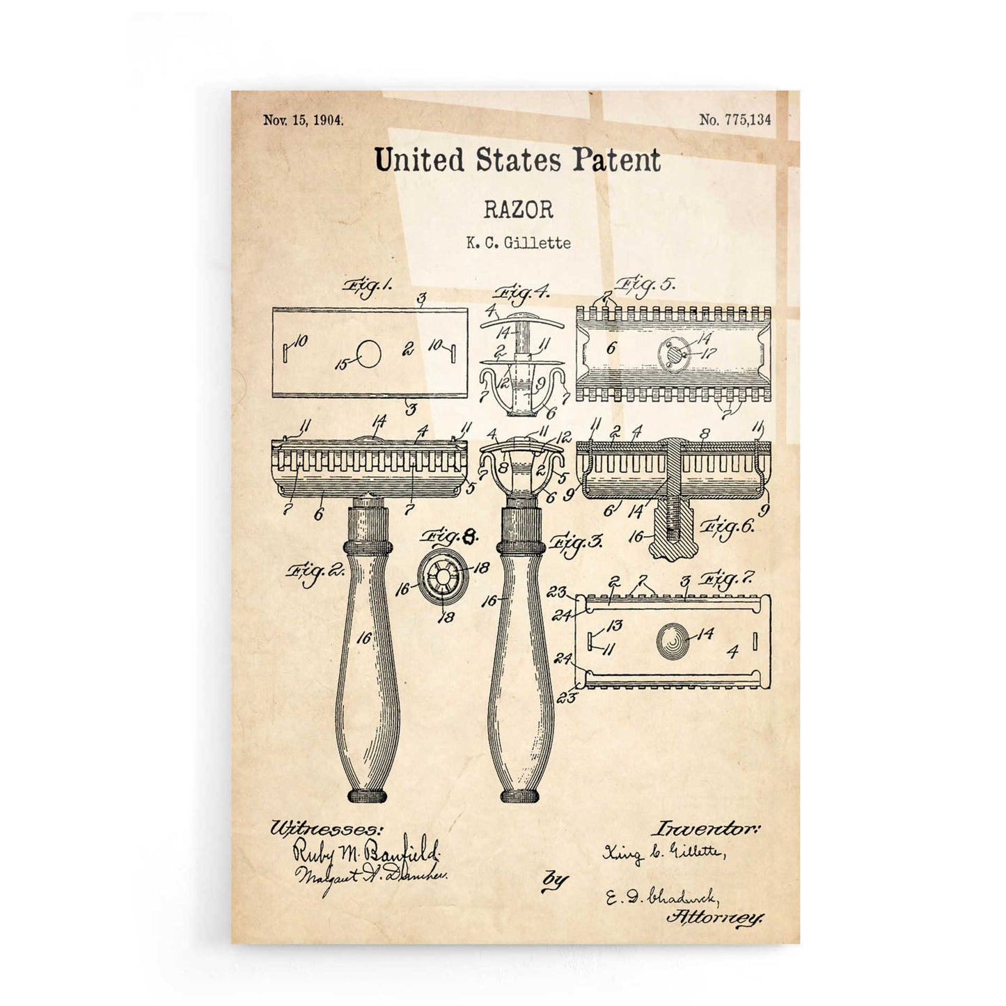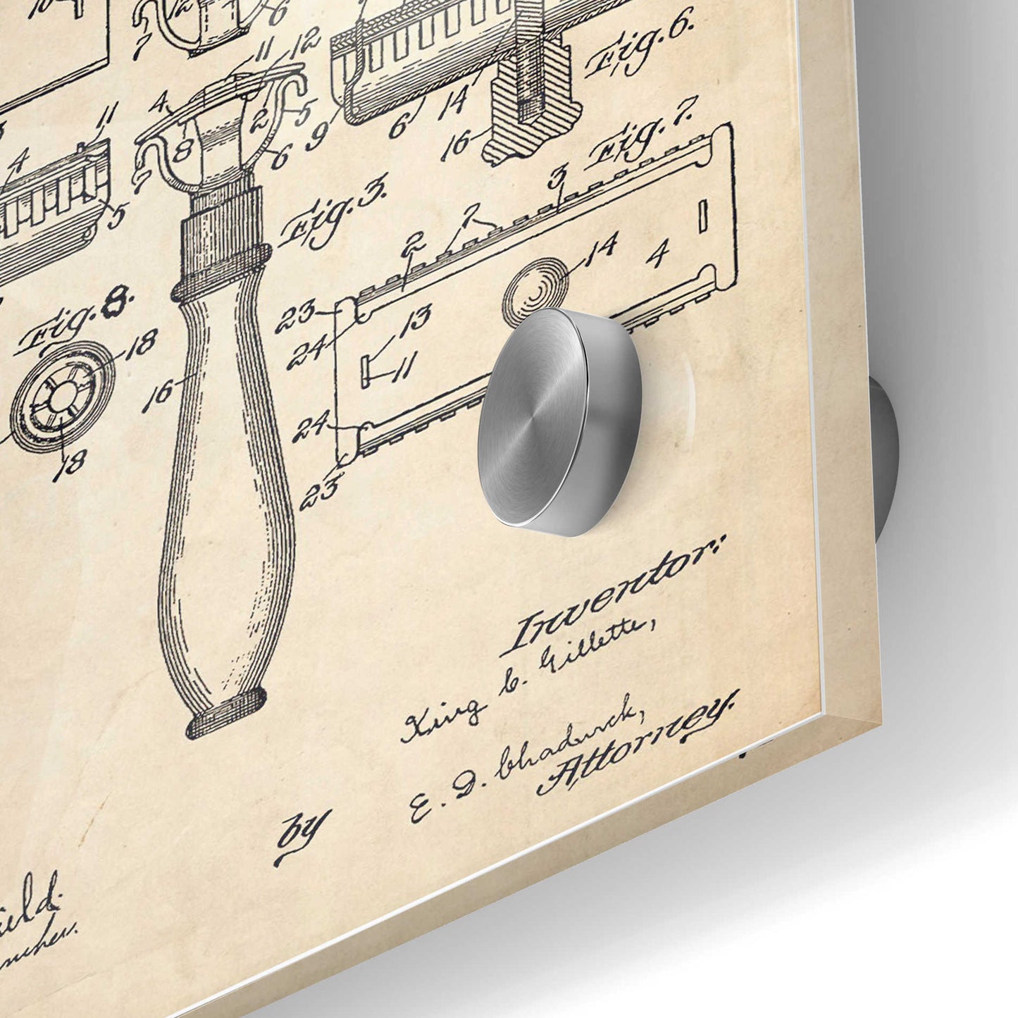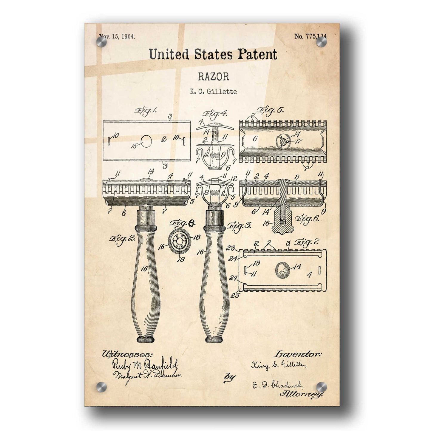 "Razor Vintage Patent printed on crystal clear acrylic glass. Official US Patent remastered" by Epic Art. Available on blackboard or parchment background. Acrylic wall art looks amazing in your home or business. Printed on the back of the acrylic giving it depth and easy maintenance. The super durable and hard-to-damage qualities make it the ideal wall art for hotels, rental properties, and restaurants. Now Epic Art brings it to you at unbelievably low prices making it very affordable for your home as well. From small sizes to extra large sizes, it is easy to hang, won"t shatter like glass if it ever falls down, and is easy to maintain. Simply dust it off or use a damp soft cloth for cleaning. For small sizes, mounting brackets and padded bumpers will be attached for simple hanging. For the larger sizes, pre-drilled holes and fitted metal standoffs are included for easy wall installation.