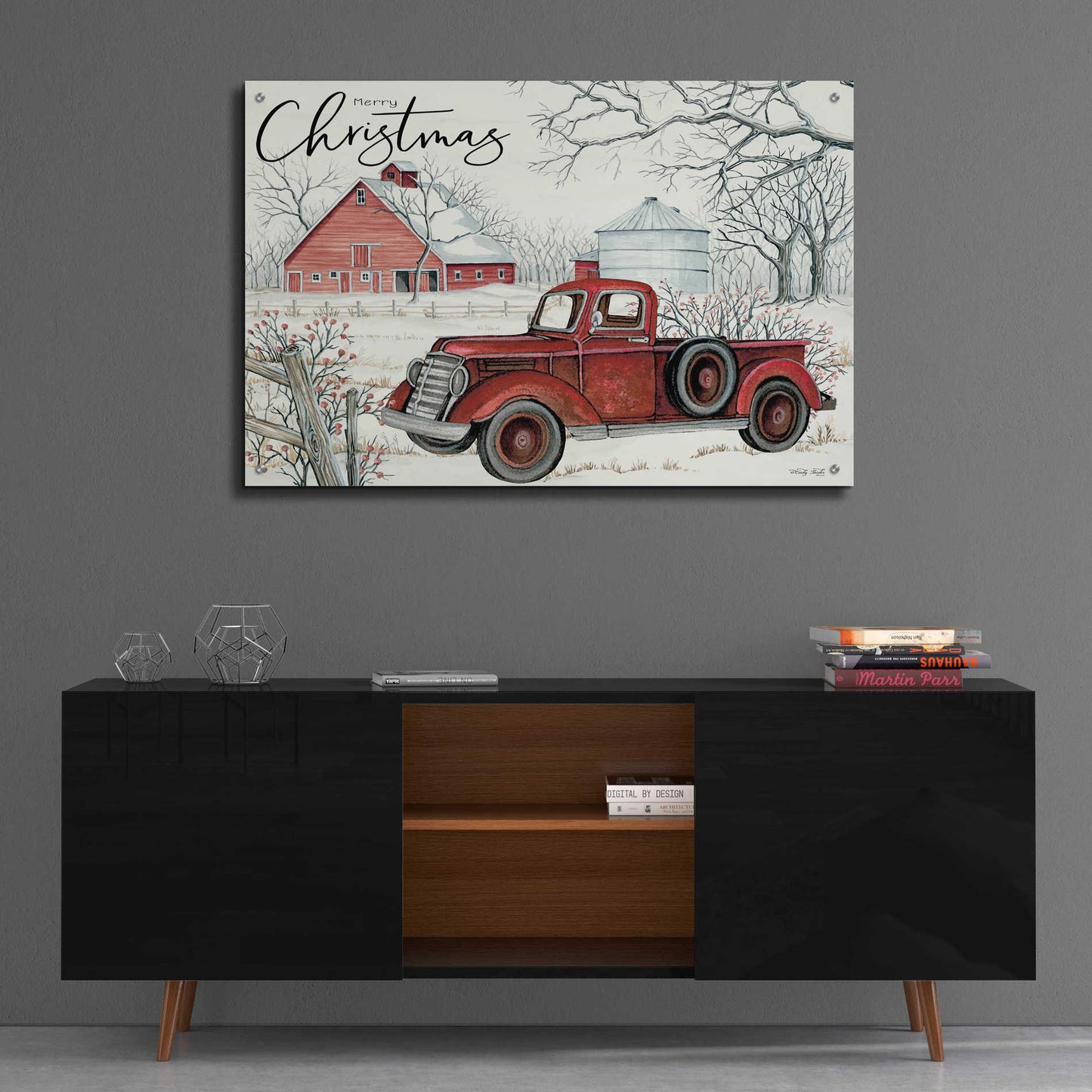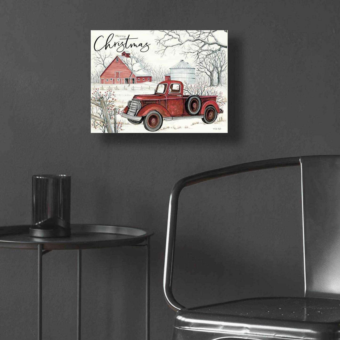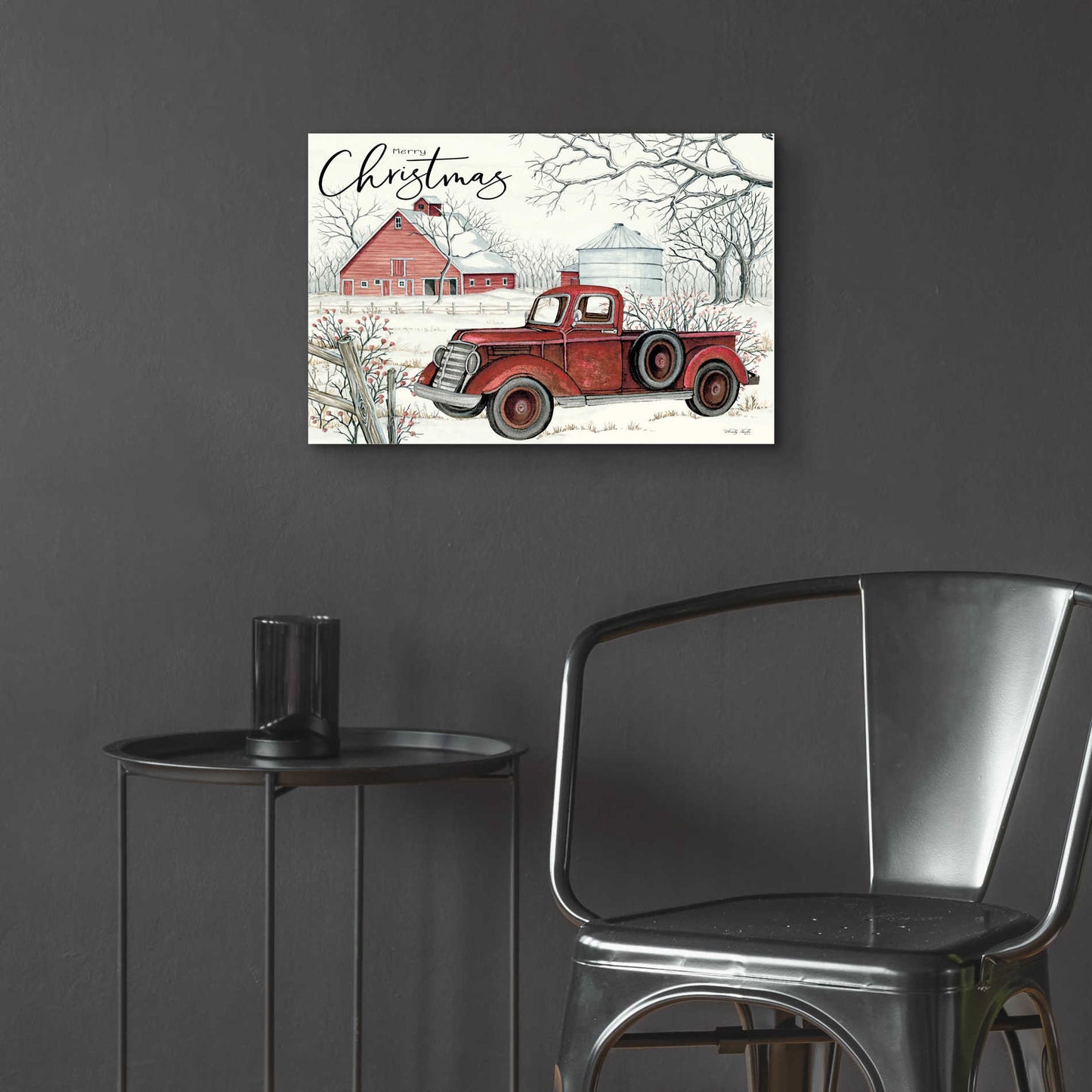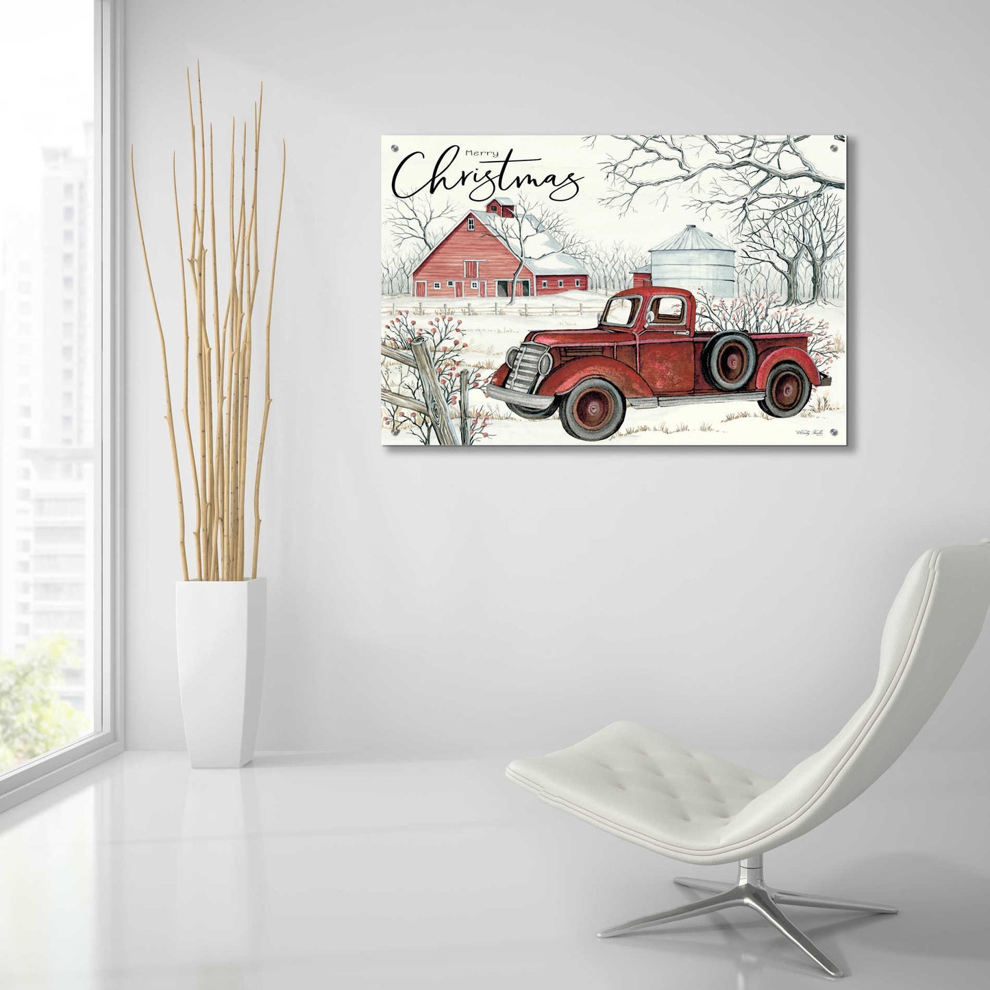 "Red Truck Winter Barn" by Cindy Jacobs.