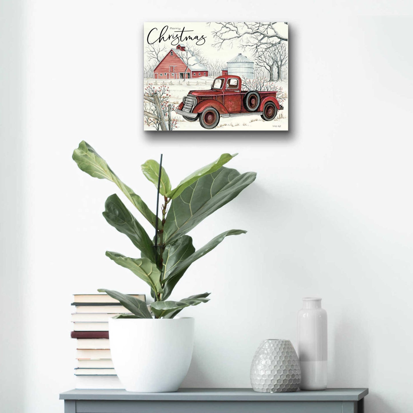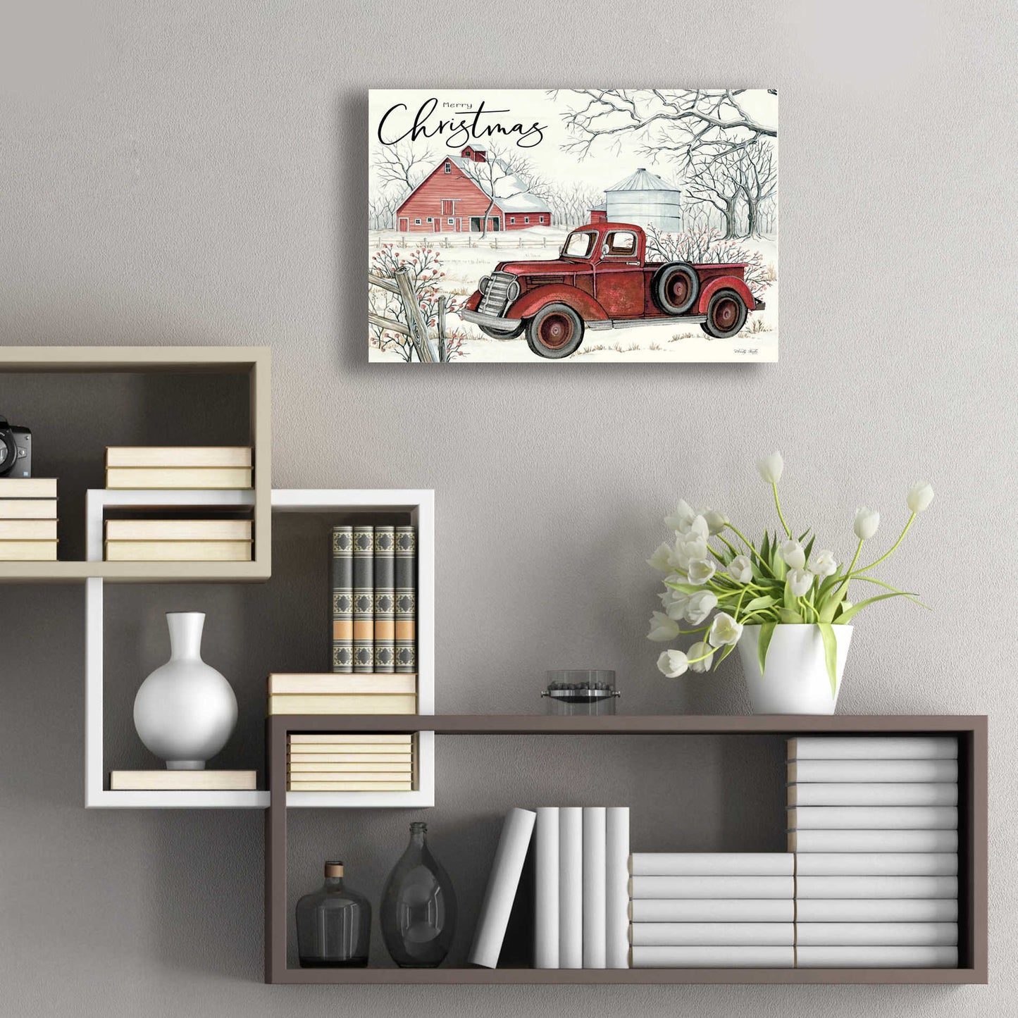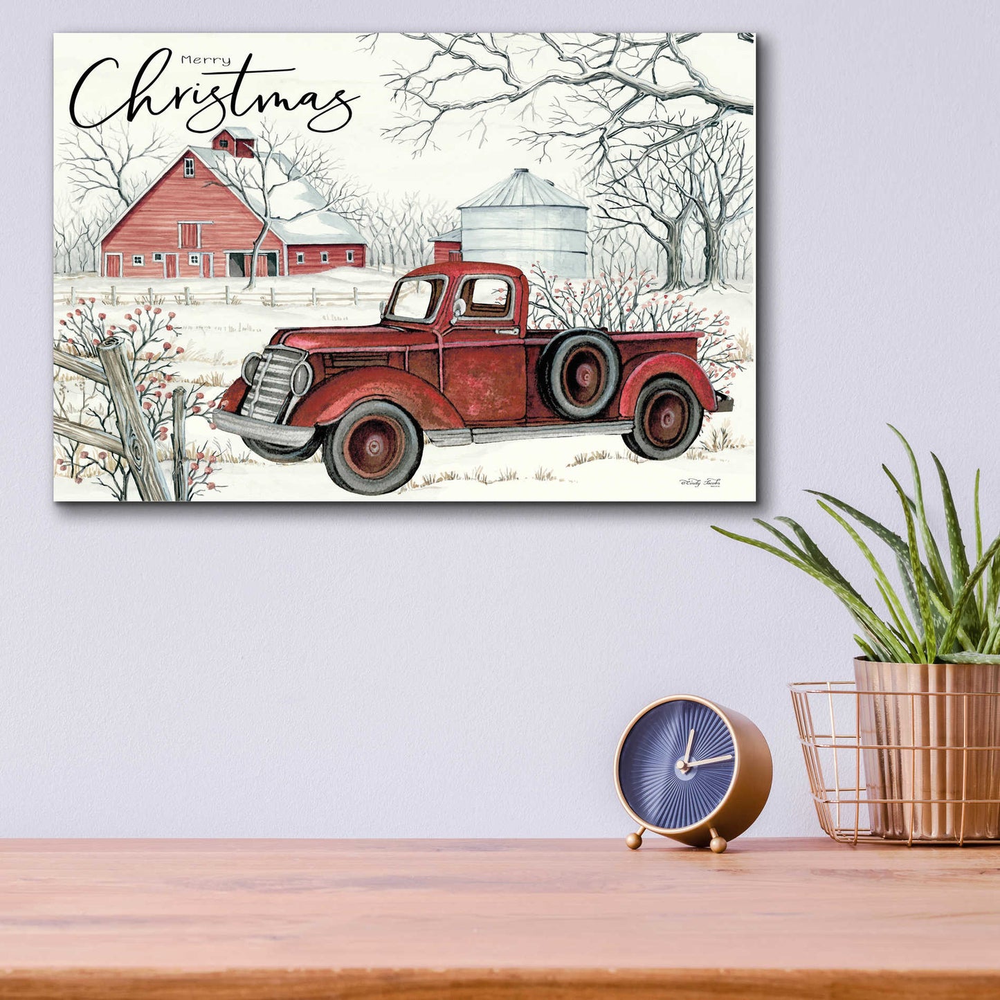 "Red Truck Winter Barn" by Cindy Jacobs.