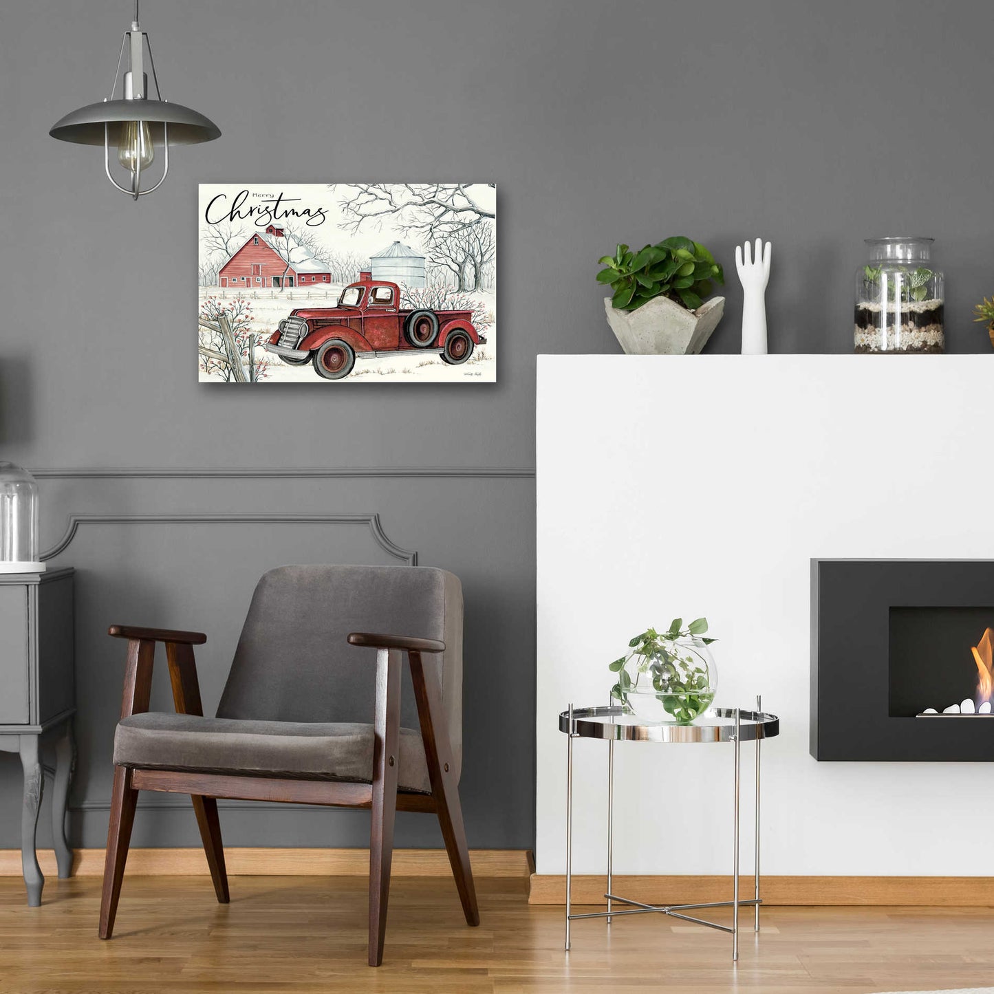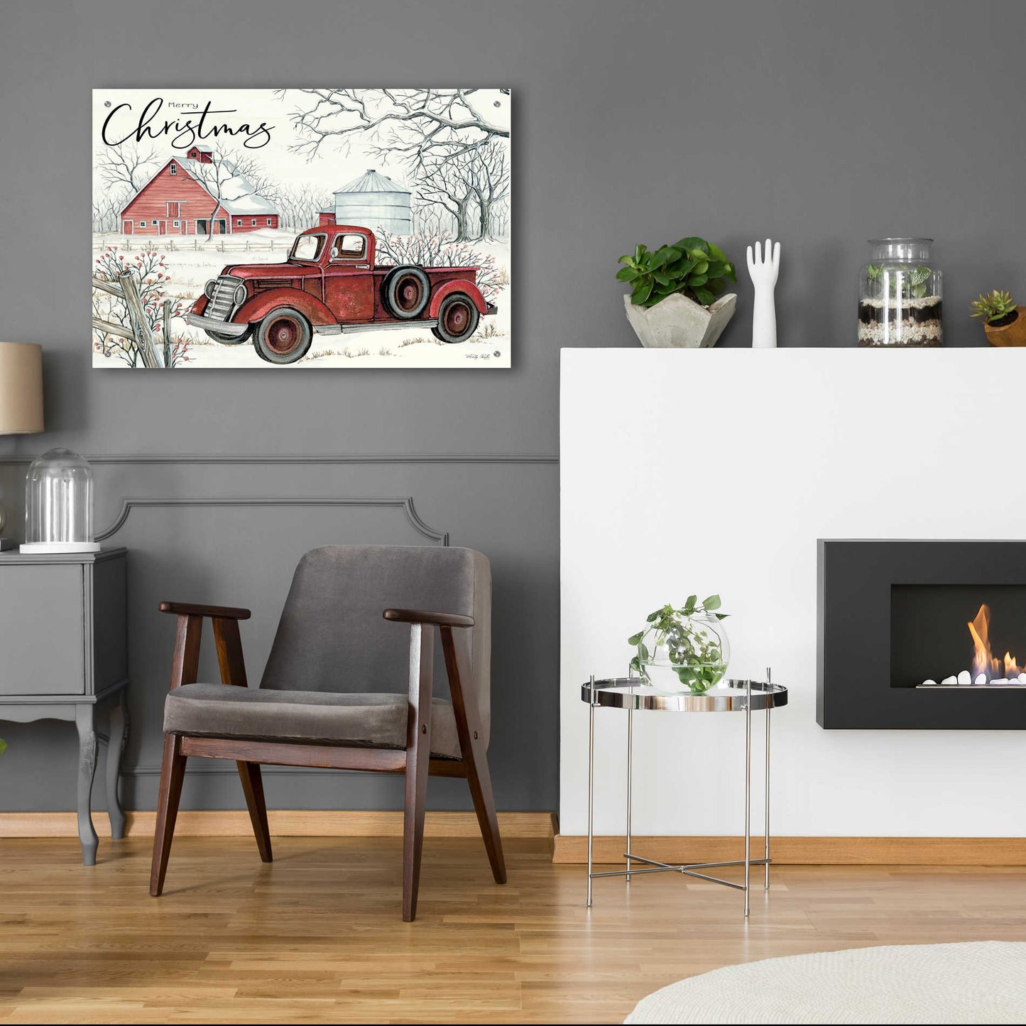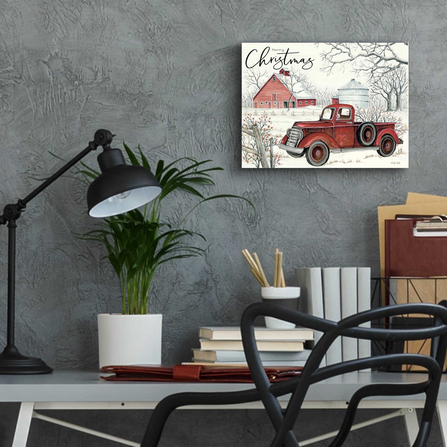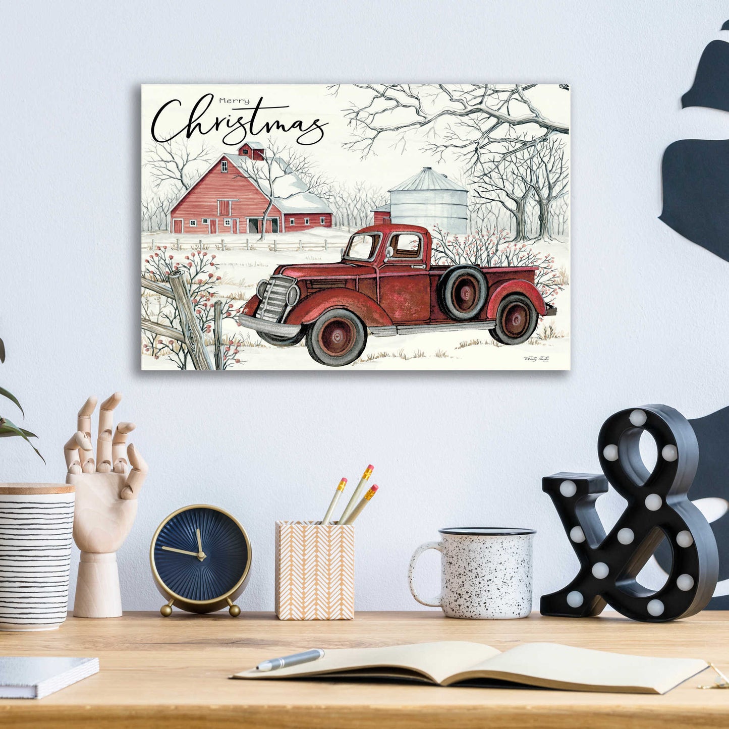 "Red Truck Winter Barn" by Cindy Jacobs.