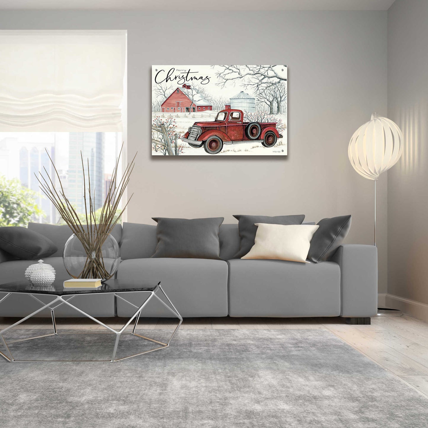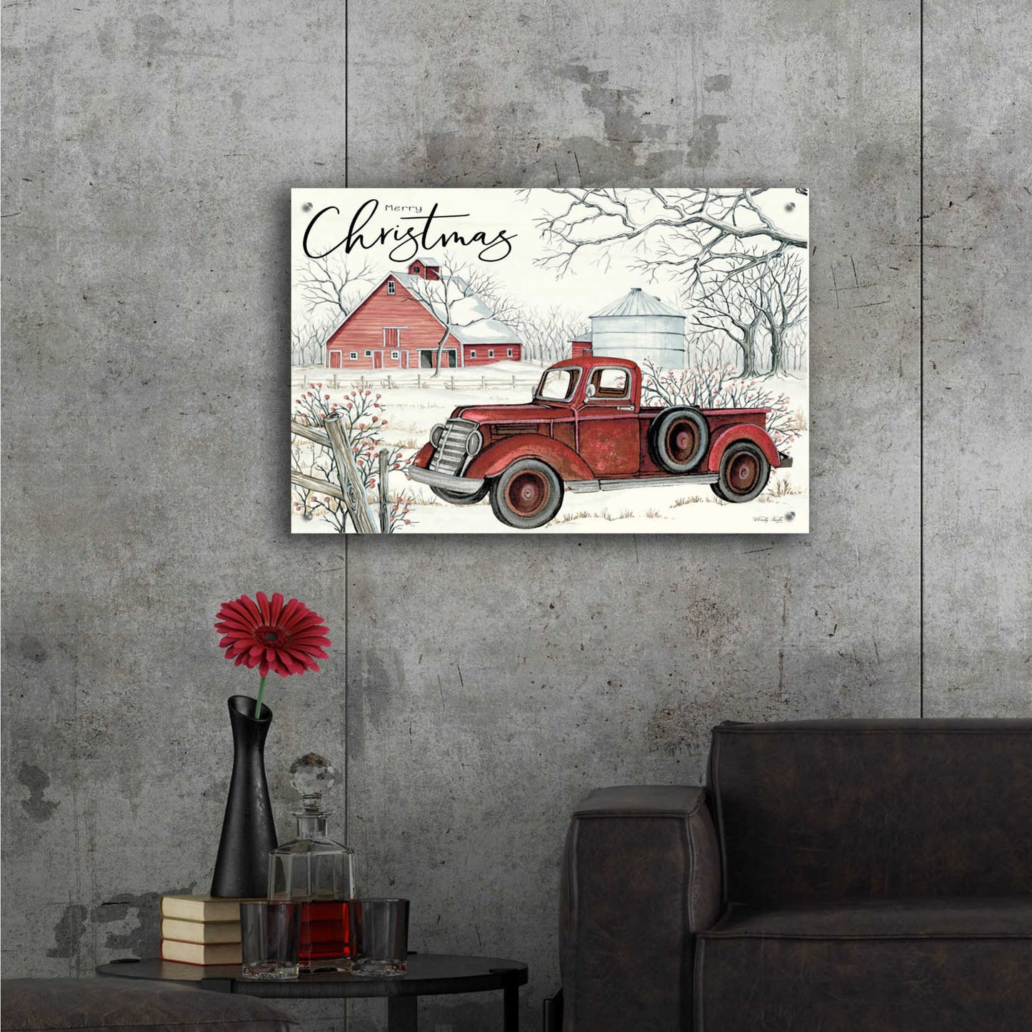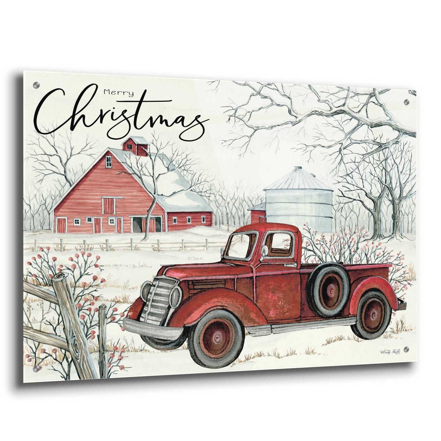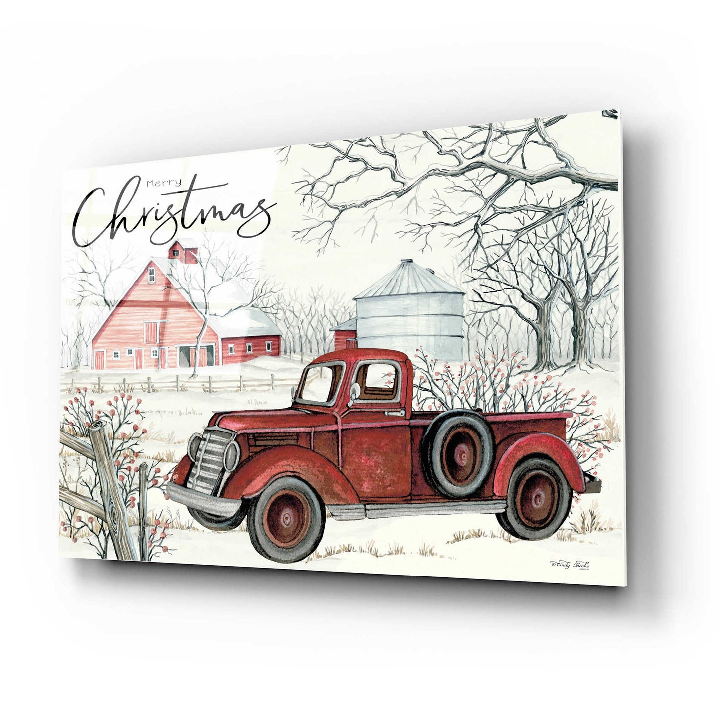 Epic Art 'Red Truck Winter Barn' by Cindy Jacobs, Acrylic Glass Wall Art