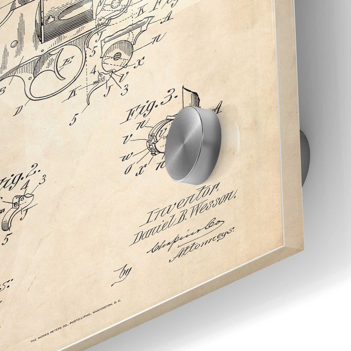 "Revolver Blueprint Patent Parchment printed on crystal clear acrylic glass. Official US Patent remastered" by Epic Art. Available on blackboard or parchment background. Acrylic wall art looks amazing in your home or business. Printed on the back of the acrylic giving it depth and easy maintenance. The super durable and hard-to-damage qualities make it the ideal wall art for hotels, rental properties, and restaurants. Now Epic Art brings it to you at unbelievably low prices making it very affordable for your home as well. From small sizes to extra large sizes, it is easy to hang, won"t shatter like glass if it ever falls down, and is easy to maintain. Simply dust it off or use a damp soft cloth for cleaning. For small sizes, mounting brackets and padded bumpers will be attached for simple hanging. For the larger sizes, pre-drilled holes and fitted metal standoffs are included for easy wall installation.