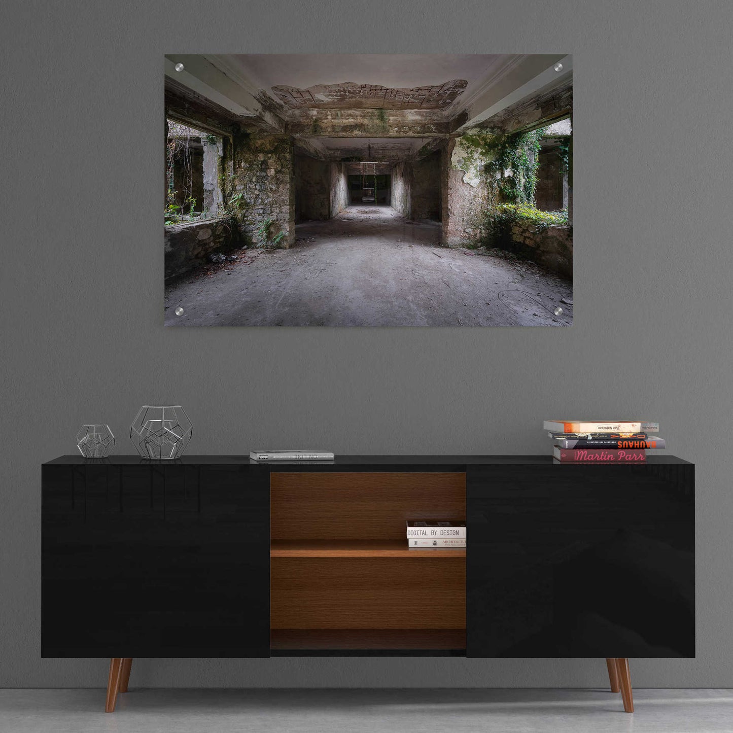 "Scary Dark Hall" by Roman Robroek. Roman is award-winning, urban photography born and raised in the south of the Netherlands. He specializes in capturing interiors and exteriors of buildings with the use of natural light only. He likes to bring abandoned and decayed buildings a curiosity to the viewer: “What was the story behind those buildings? Who used to live there? What purpose did these objects serve and why were they abandoned?” Acrylic wall art looks amazing in your home or business. Printed on the back of the acrylic giving it depth and easy maintenance. The highly durable and hard-to-damage qualities make high definition acrylic the ideal wall art for hotels, rental properties, and restaurants. Now Epic Art brings you unmatched value in contemporary wall decor for your home as well. From small sizes to extra large sizes, it is easy to hang, won"t shatter like glass if it ever falls down, and is easy to maintain. Simply dust it off or use a damp soft cloth for cleaning.