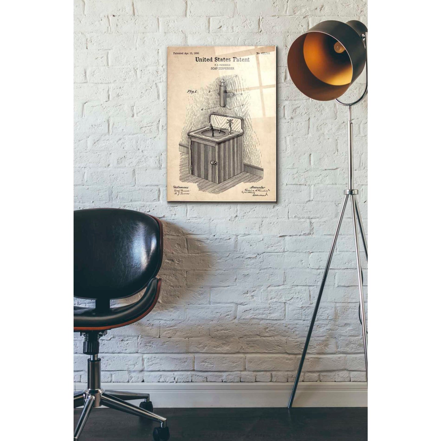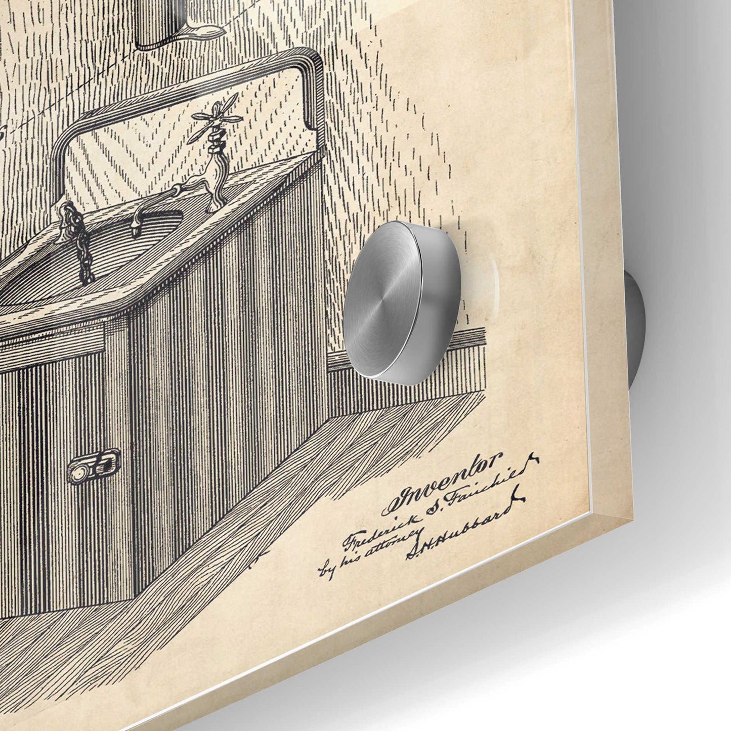 "Soap Dispenser Blueprint Patent Parchment printed on crystal clear acrylic glass. Official US Patent remastered" by Epic Art. Available on blackboard or parchment background. Acrylic wall art looks amazing in your home or business. Printed on the back of the acrylic giving it depth and easy maintenance. The super durable and hard-to-damage qualities make it the ideal wall art for hotels, rental properties, and restaurants. Now Epic Art brings it to you at unbelievably low prices making it very affordable for your home as well. From small sizes to extra large sizes, it is easy to hang, won"t shatter like glass if it ever falls down, and is easy to maintain. Simply dust it off or use a damp soft cloth for cleaning. For small sizes, mounting brackets and padded bumpers will be attached for simple hanging. For the larger sizes, pre-drilled holes and fitted metal standoffs are included for easy wall installation.