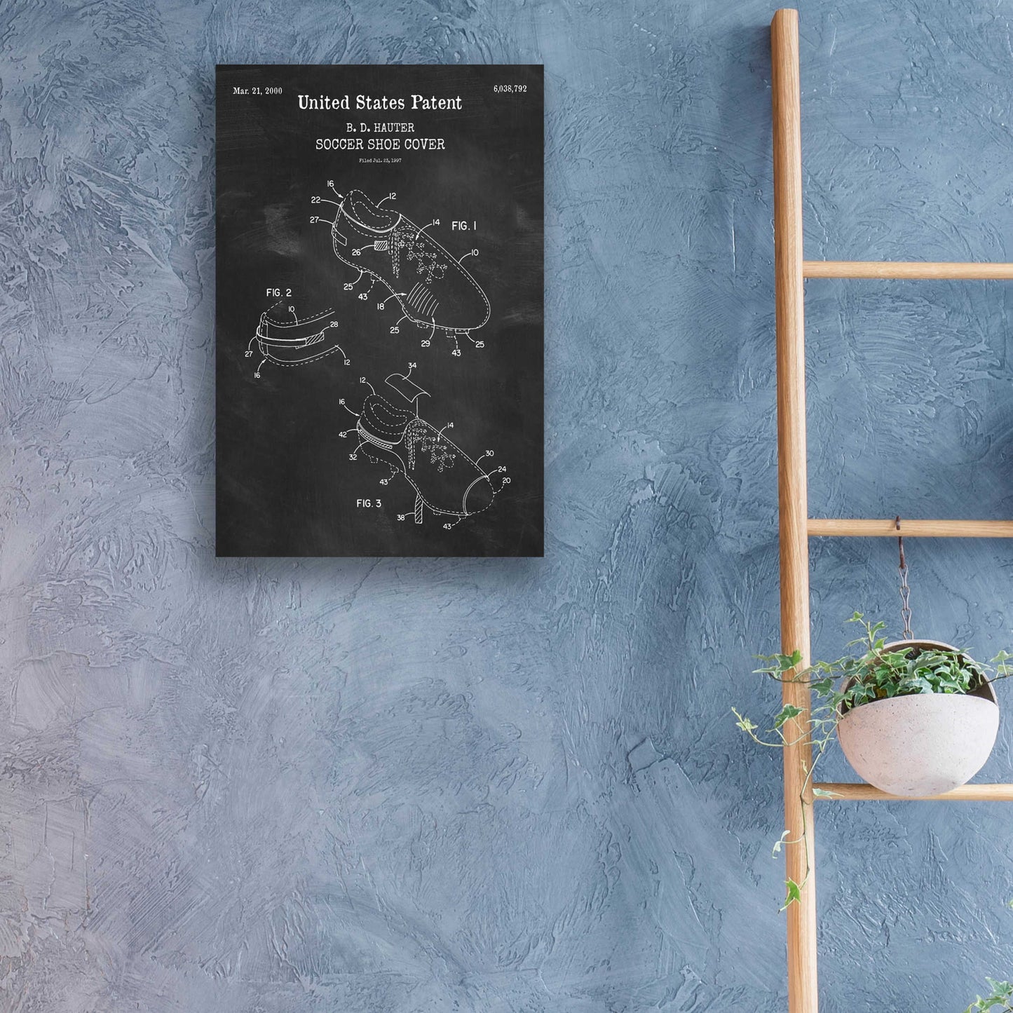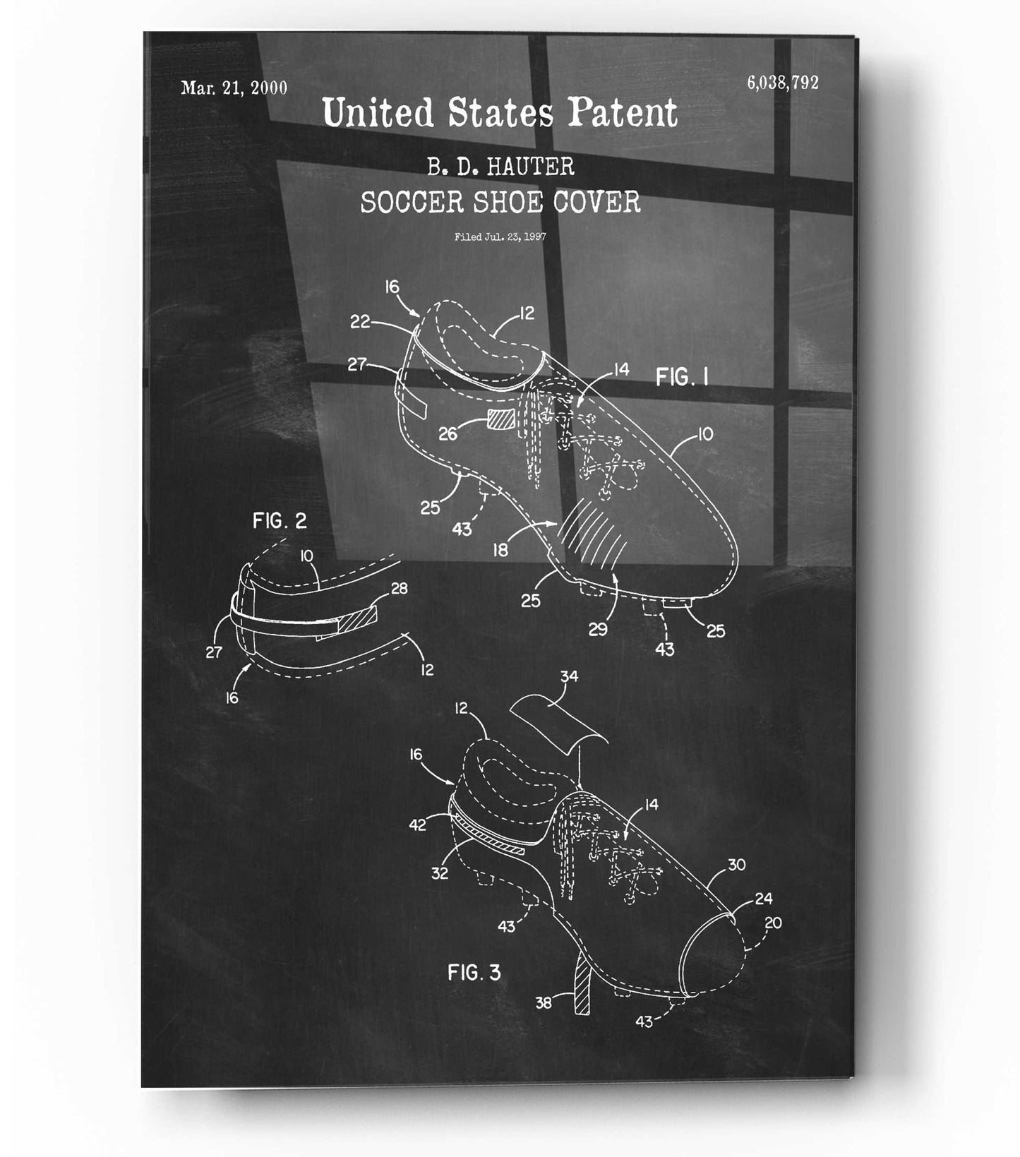 Soccer Shoe Cover Blueprint Patent Chalkboard. An official US Patent remastered by Epic Art. Available on blackboard or parchment background.