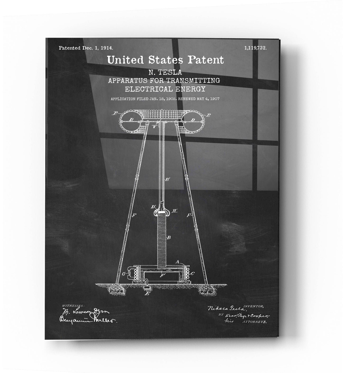 Tesla Apparatus for Transmitting Electrical Energy Blueprint Patent Chalkboard printed on crystal clear acrylic glass. Official US Patent remastered by Epic Art. Available on blackboard or parchment background.