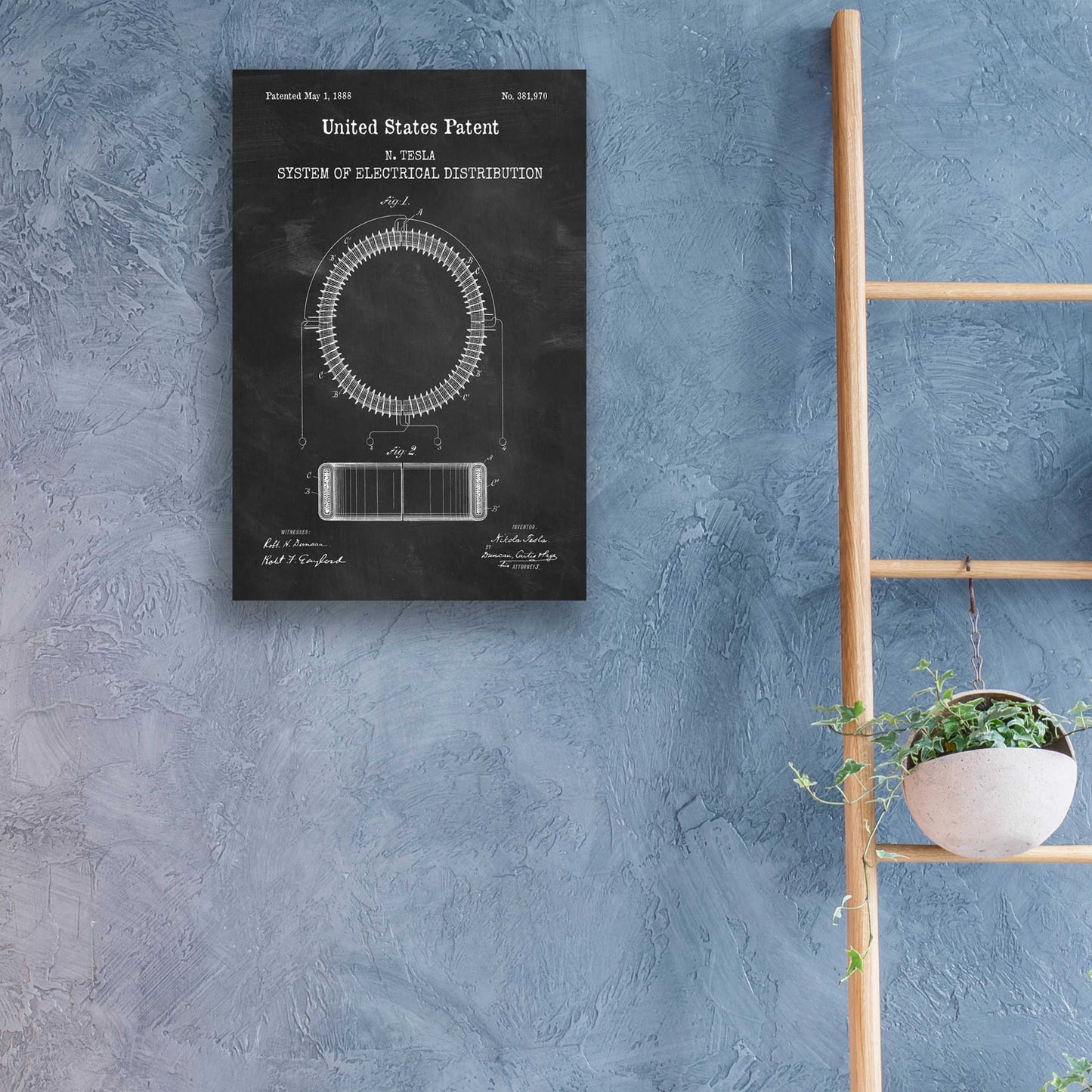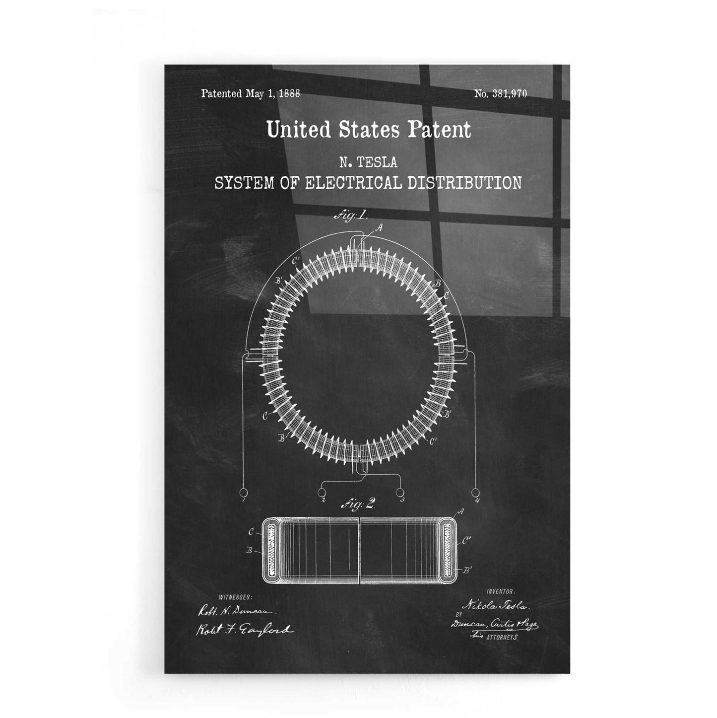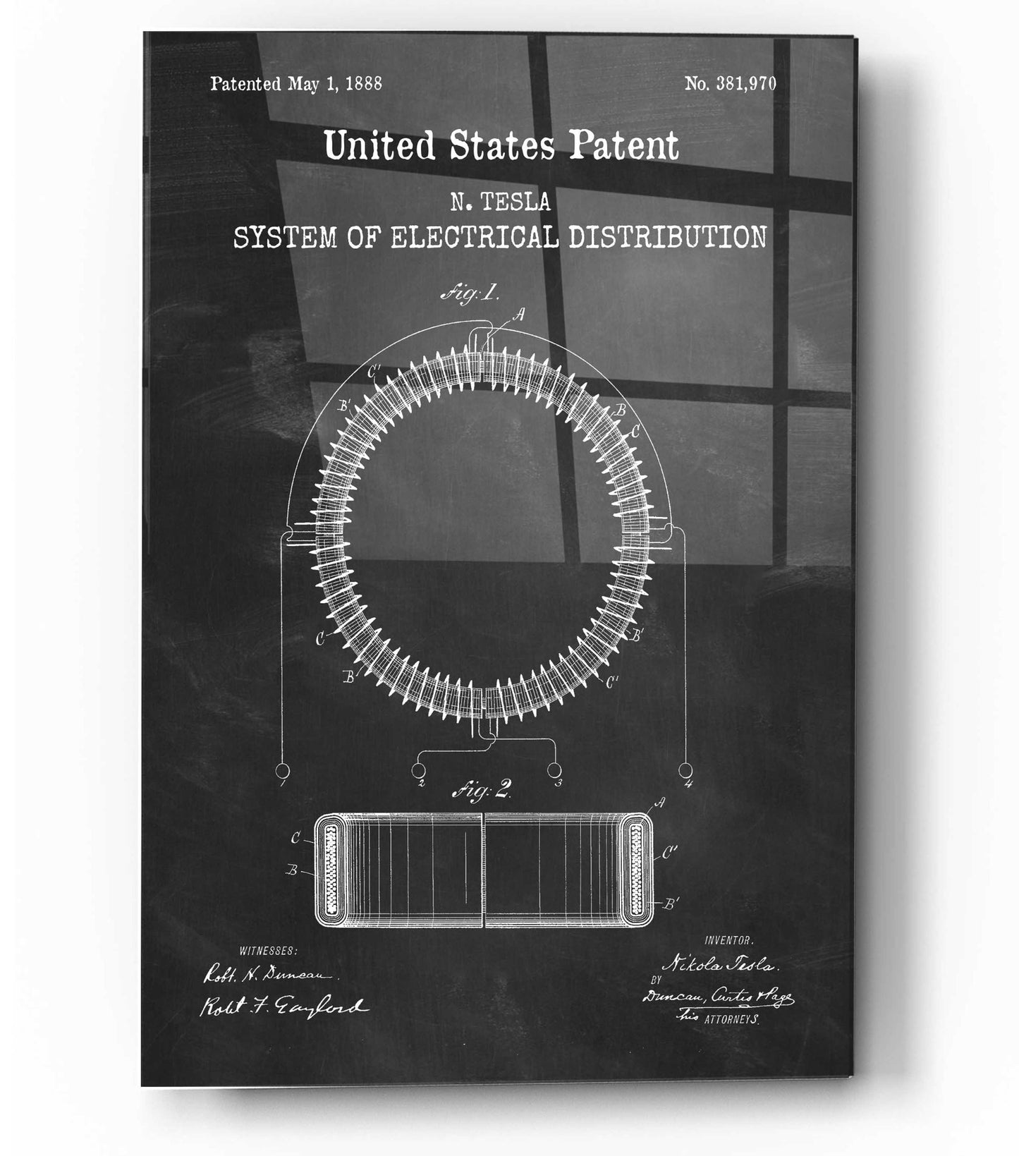 Tesla's System of Electrical Distribution Blueprint Patent Chalkboard. An official US Patent remastered by Epic Art. Available on blackboard or parchment background.
