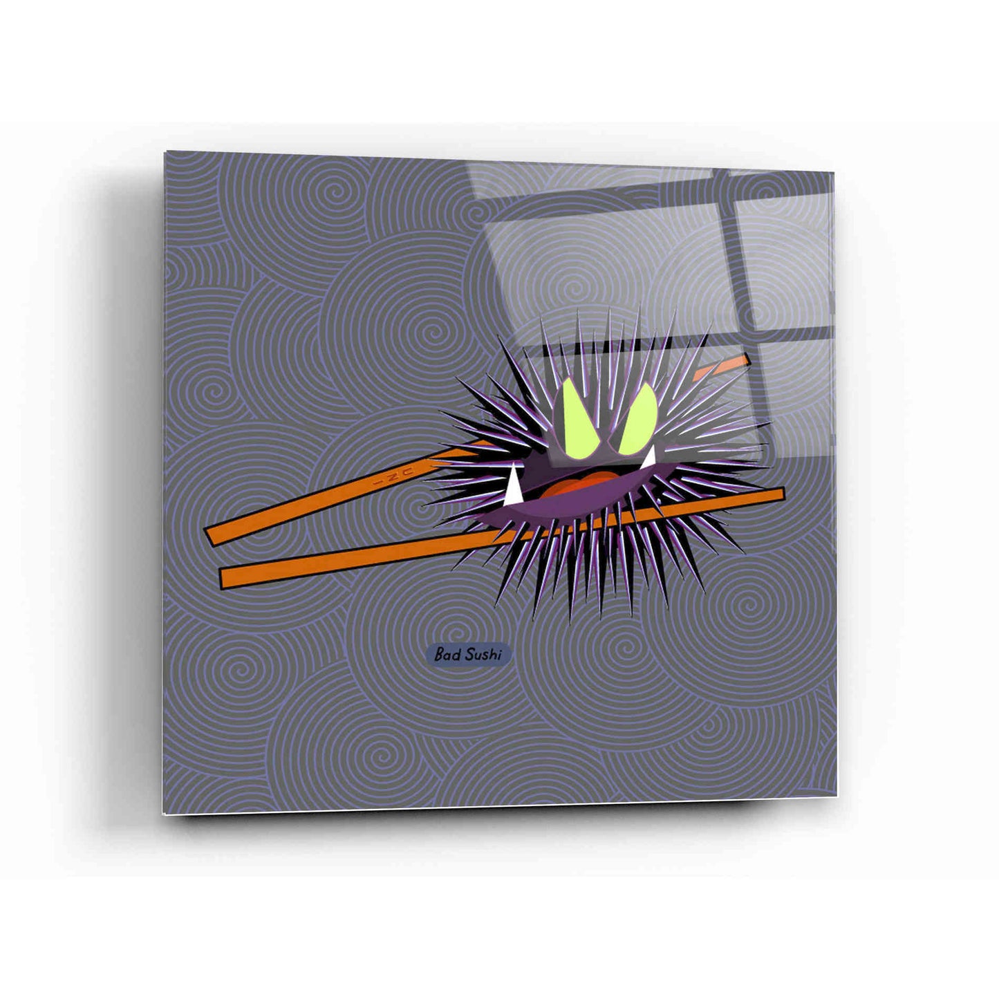 "Uni" by Chuck Wimmer printed on crystal clear acrylic glass. Featuring a grumpy piece of sushi caught between two chopsticks. Perfect piece for your home kitchen or commercial space.