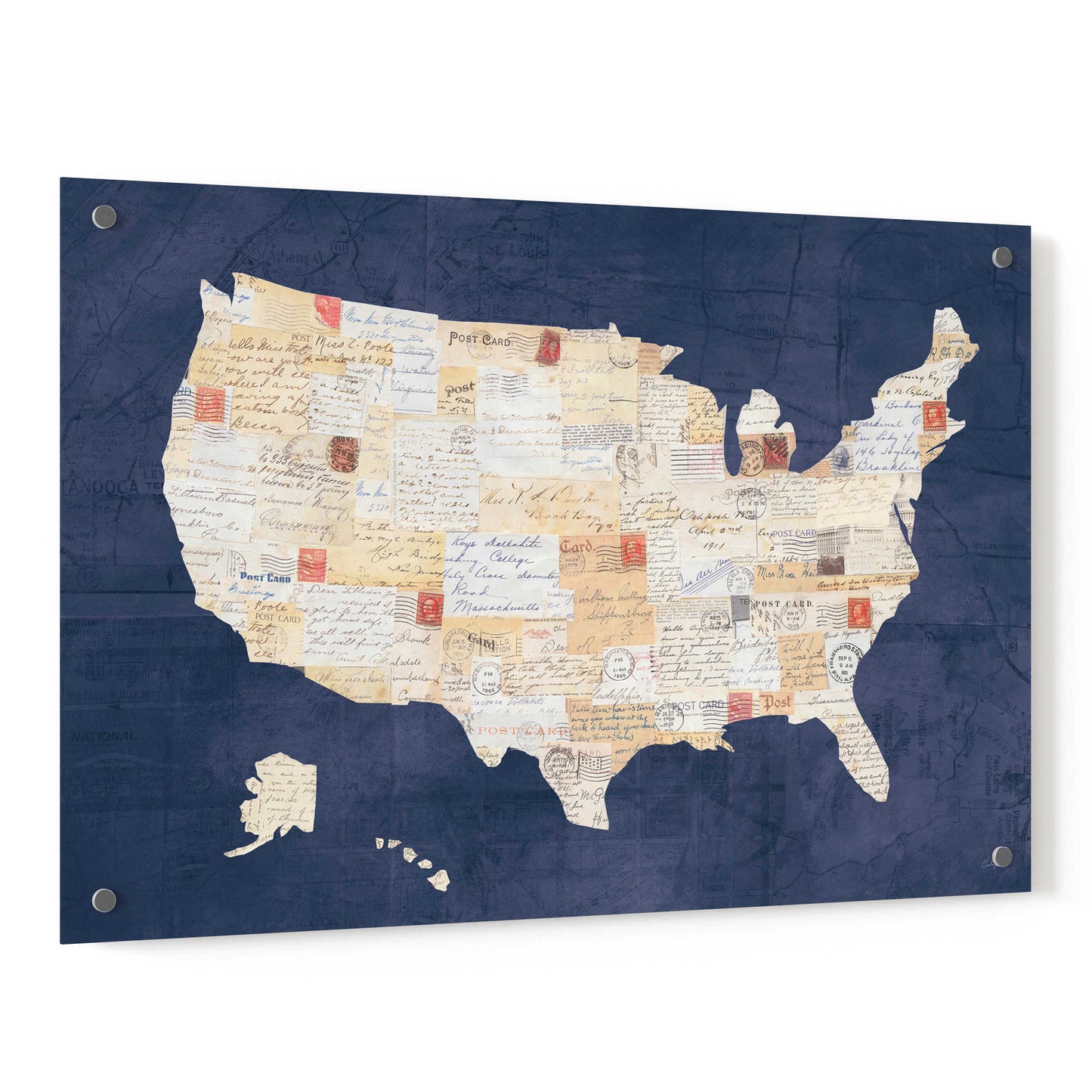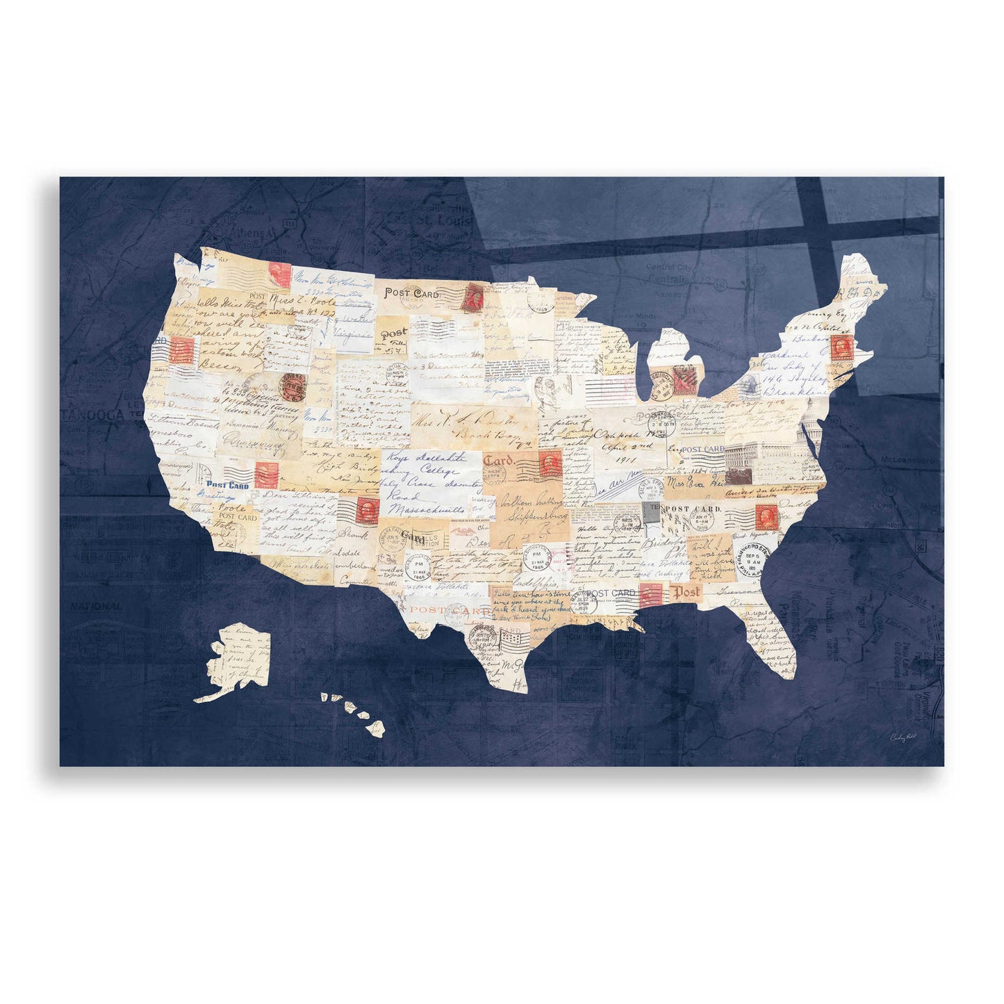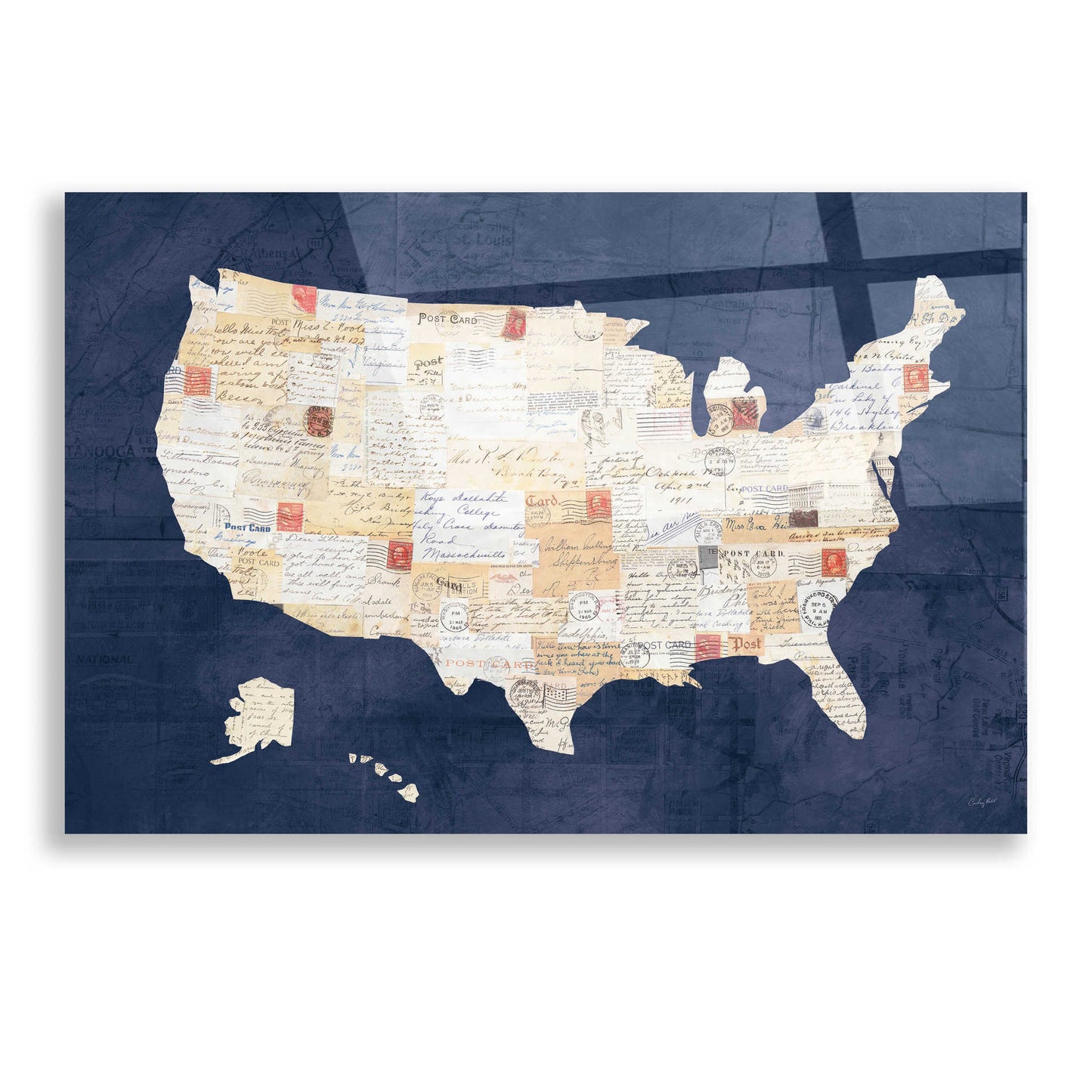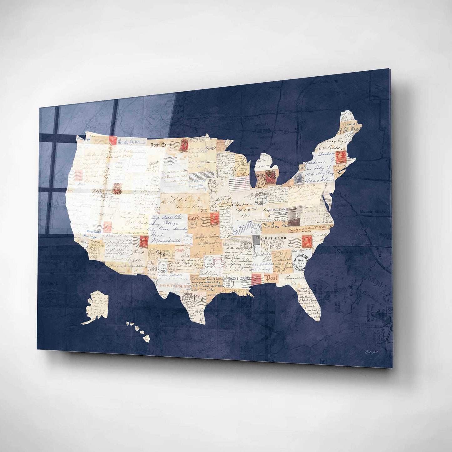 "Vintage USA on Indigo" by Courtney Prahl. Courtney is a mixed media artist. Collaging old and new materials are her signature style. She enjoys searching for vintage art materials to incorporate into her artwork. Residing in Maryland with her husband and two sons, she teaches art to children and is co-founder of her local art charity "Lend a Hand." Acrylic wall art looks amazing in your home or business. Printed on the back of the acrylic giving it depth and easy maintenance. The highly durable and hard-to-damage qualities make high definition acrylic the ideal wall art for hotels, rental properties, and restaurants. Now Epic Art brings you unmatched value in contemporary wall decor for your home as well. From small sizes to extra large sizes, it is easy to hang, won't shatter like glass if it ever falls down, and is easy to maintain. Simply dust it off or use a damp soft cloth for cleaning.