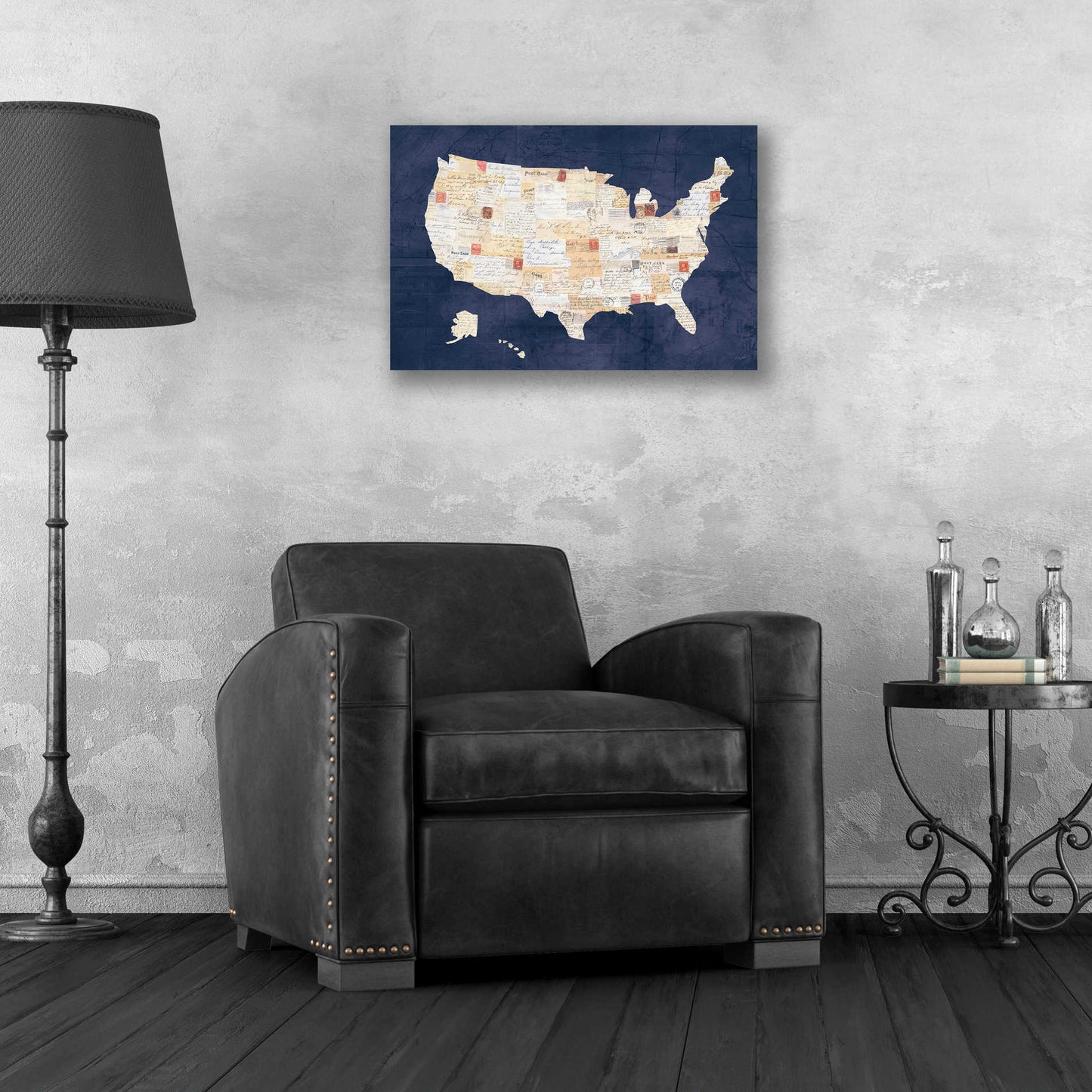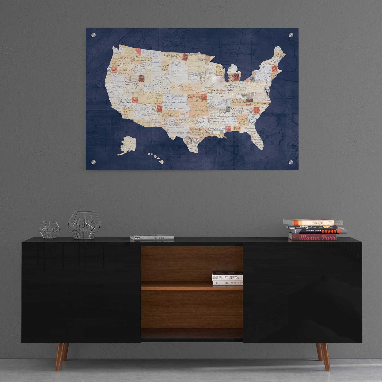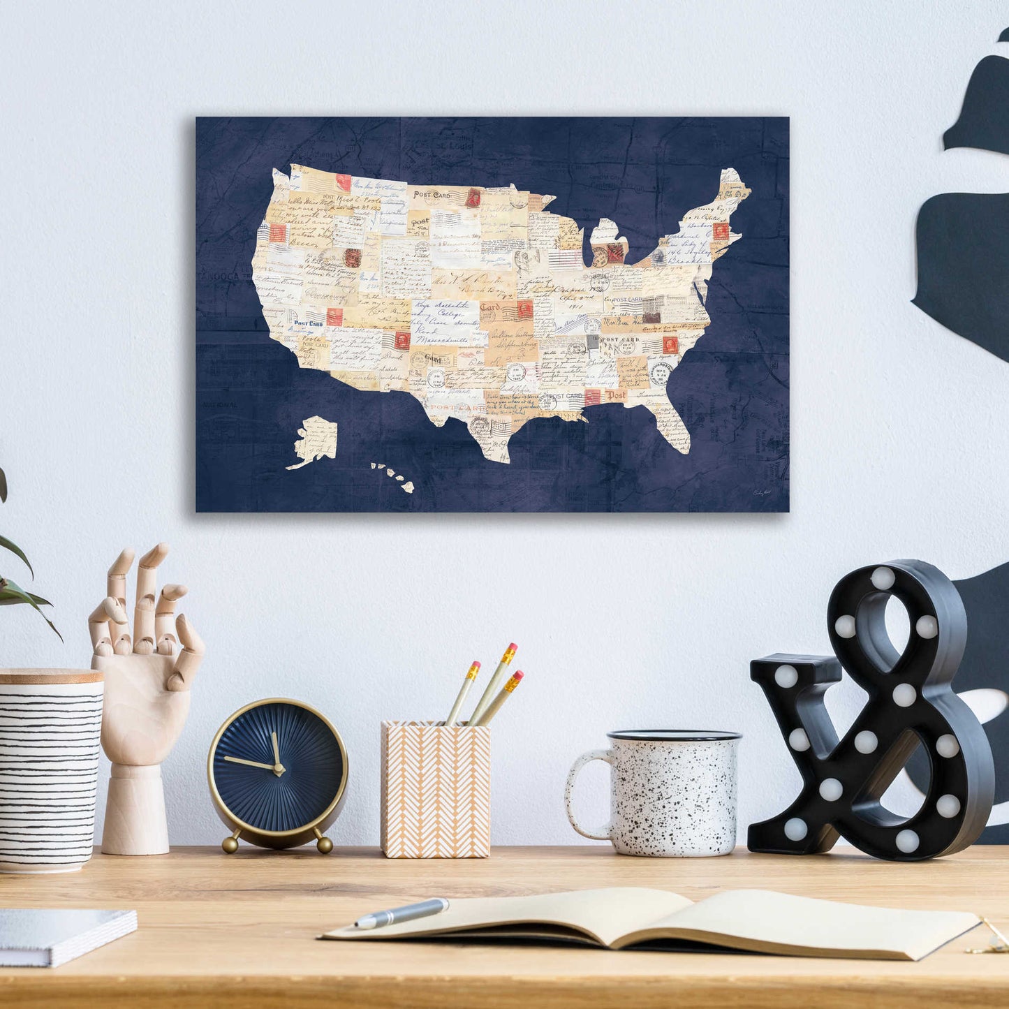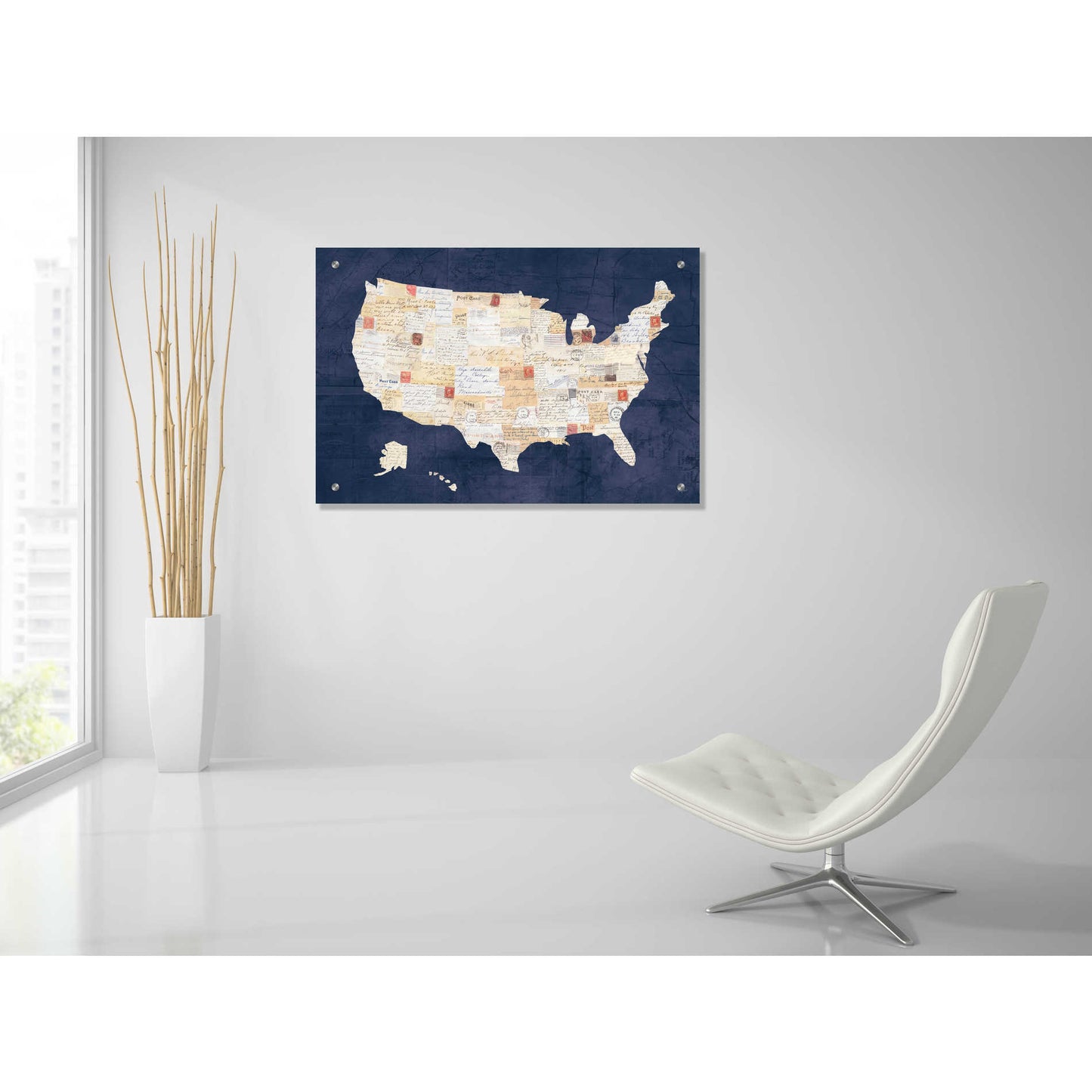 "Vintage USA on Indigo" by Courtney Prahl. Courtney is a mixed media artist. Collaging old and new materials are her signature style. She enjoys searching for vintage art materials to incorporate into her artwork. Residing in Maryland with her husband and two sons, she teaches art to children and is co-founder of her local art charity "Lend a Hand." Acrylic wall art looks amazing in your home or business. Printed on the back of the acrylic giving it depth and easy maintenance. The highly durable and hard-to-damage qualities make high definition acrylic the ideal wall art for hotels, rental properties, and restaurants. Now Epic Art brings you unmatched value in contemporary wall decor for your home as well. From small sizes to extra large sizes, it is easy to hang, won't shatter like glass if it ever falls down, and is easy to maintain. Simply dust it off or use a damp soft cloth for cleaning.