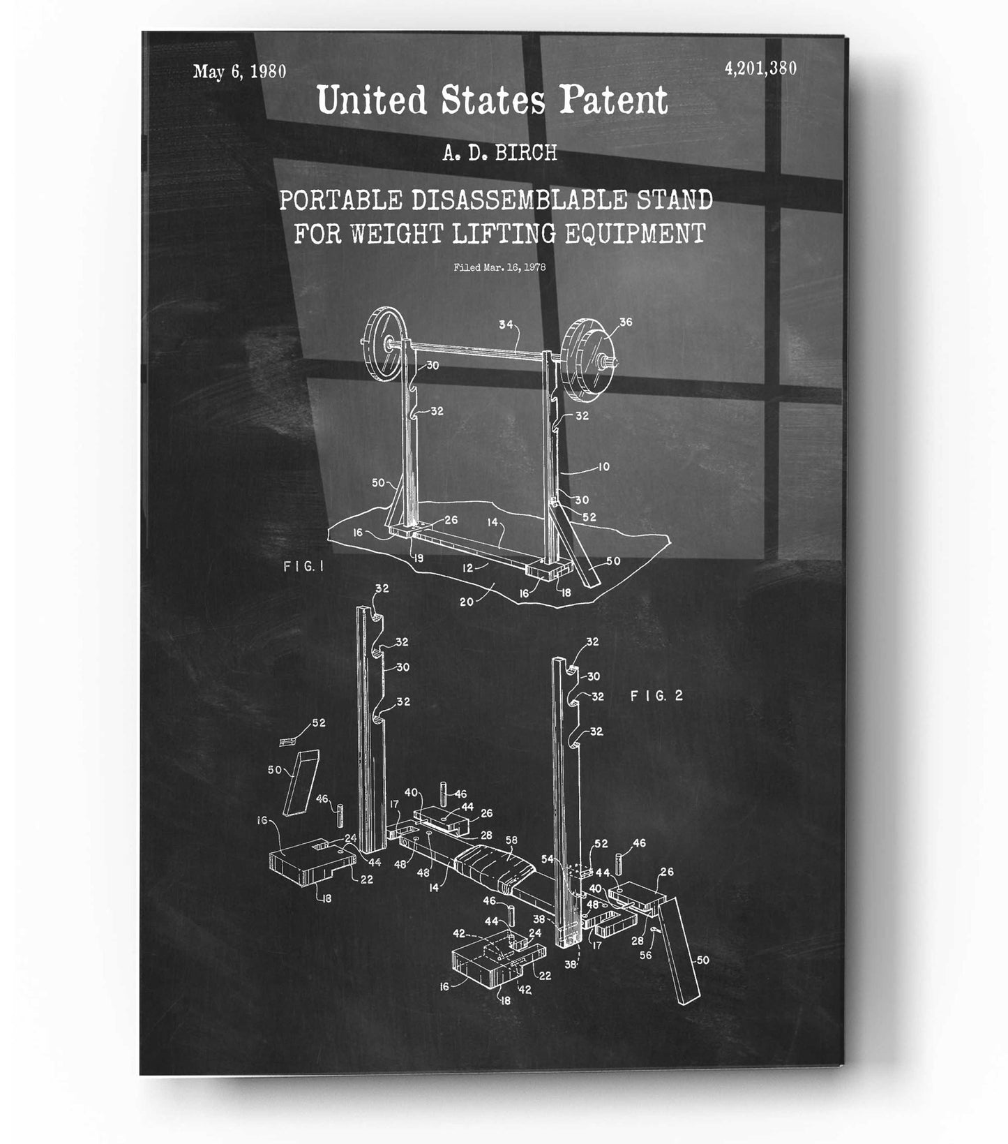 Weight Lifting Equipment Blueprint Patent Chalkboard. An official US Patent remastered by Epic Art. Available on blackboard or parchment background.