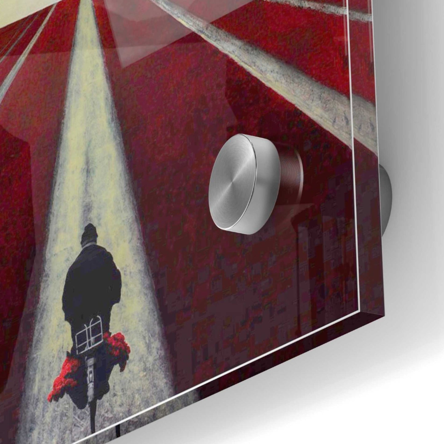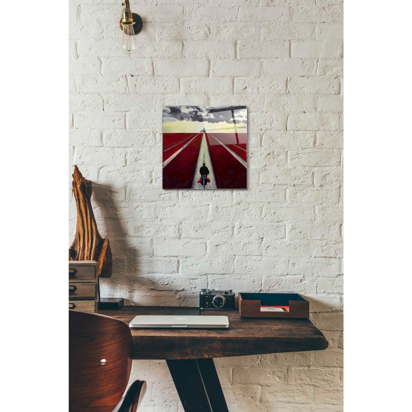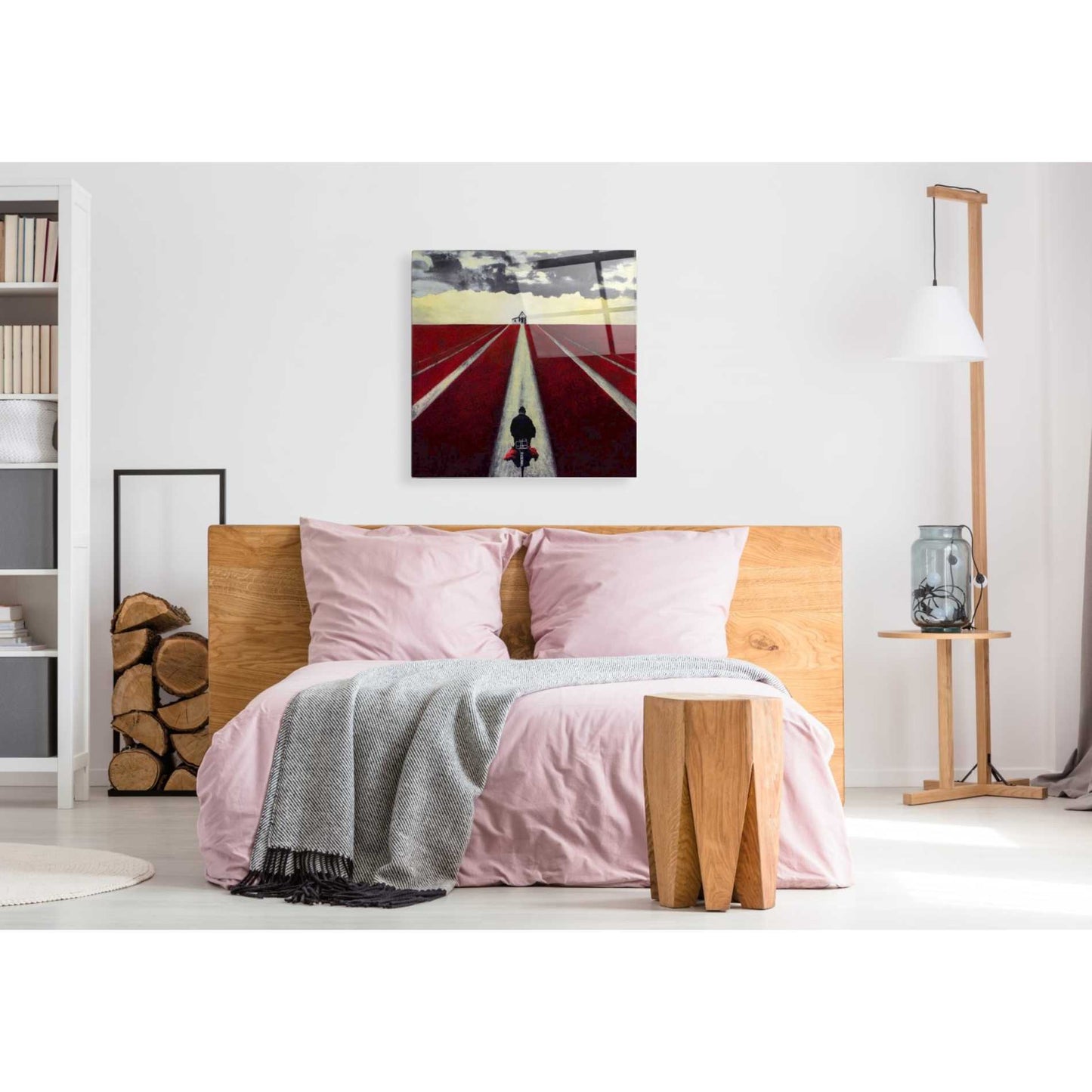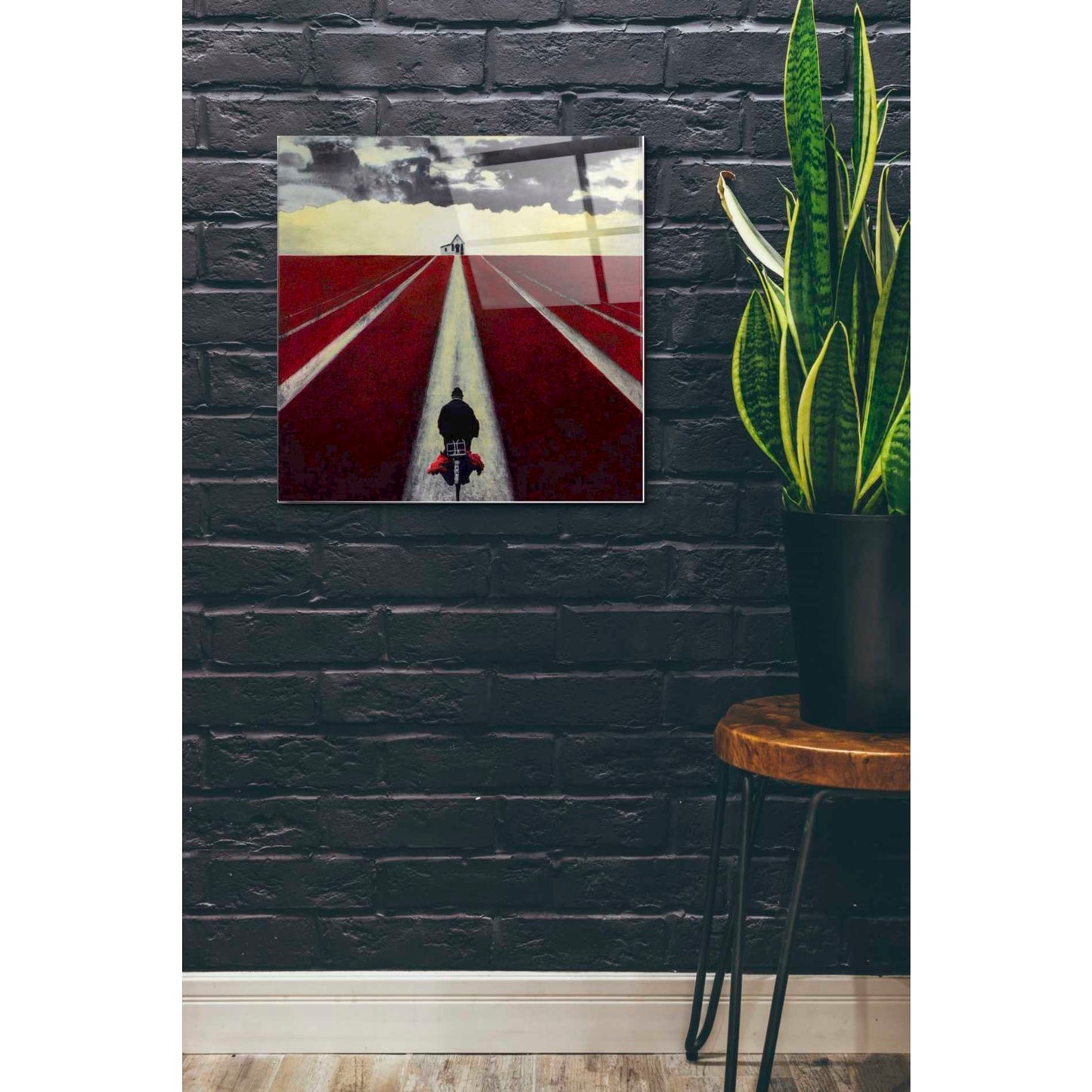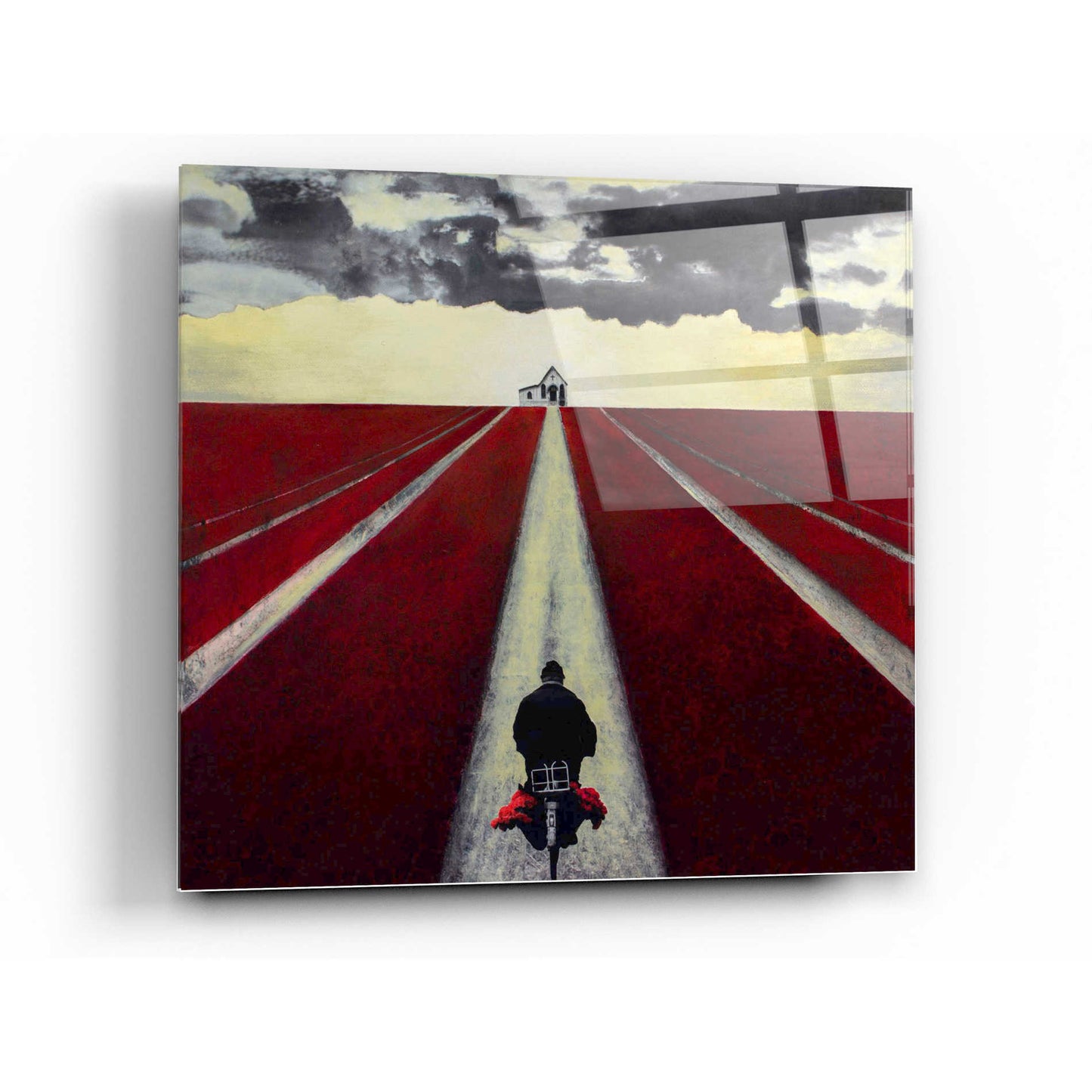 "WE'LL MEET AGAIN" by DB Waterman printed on crystal clear acrylic glass. Featuring a man biking to church through a field of red.