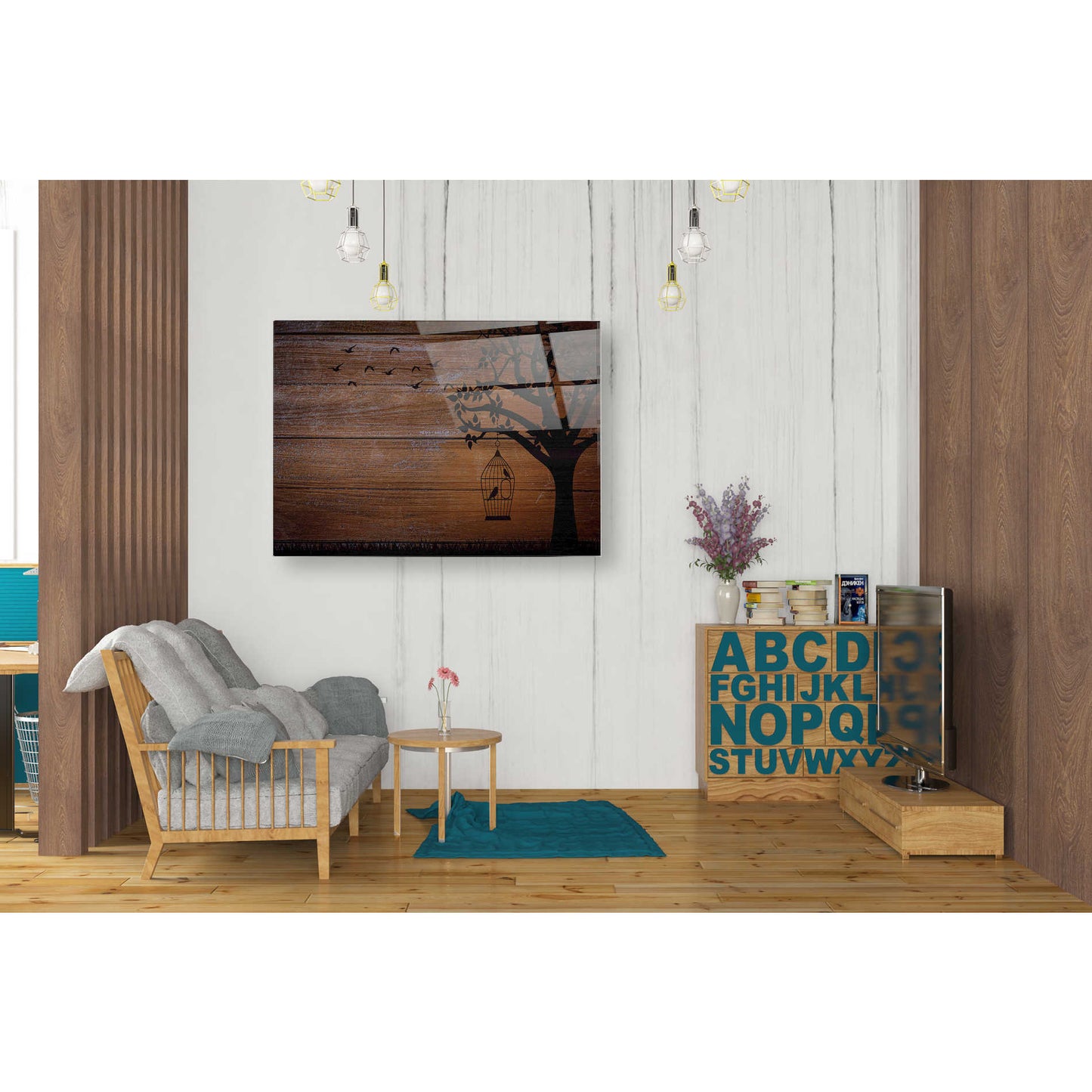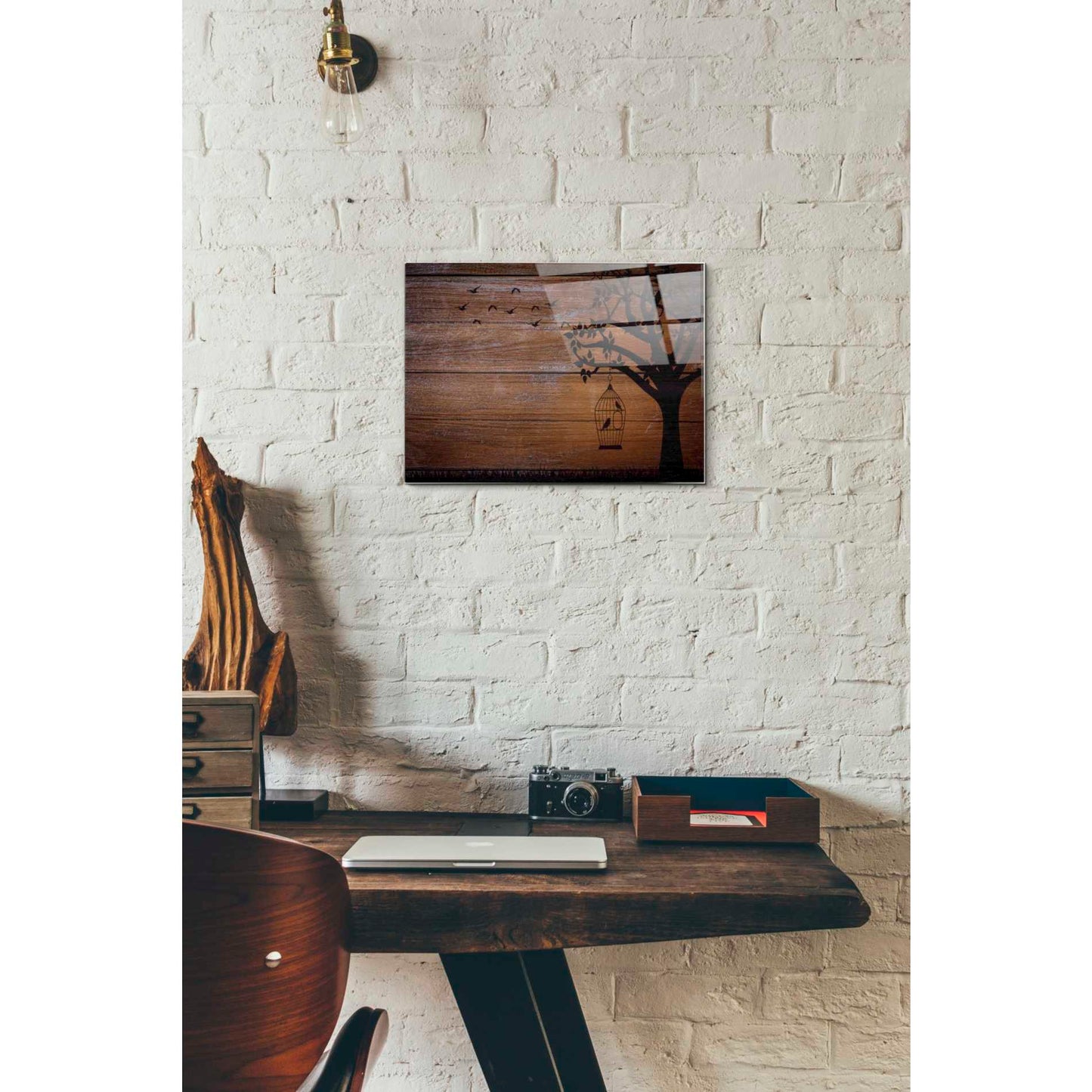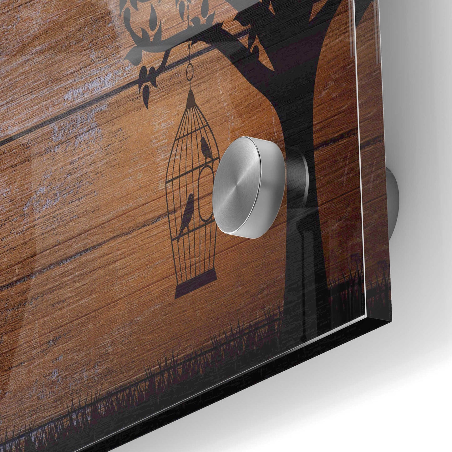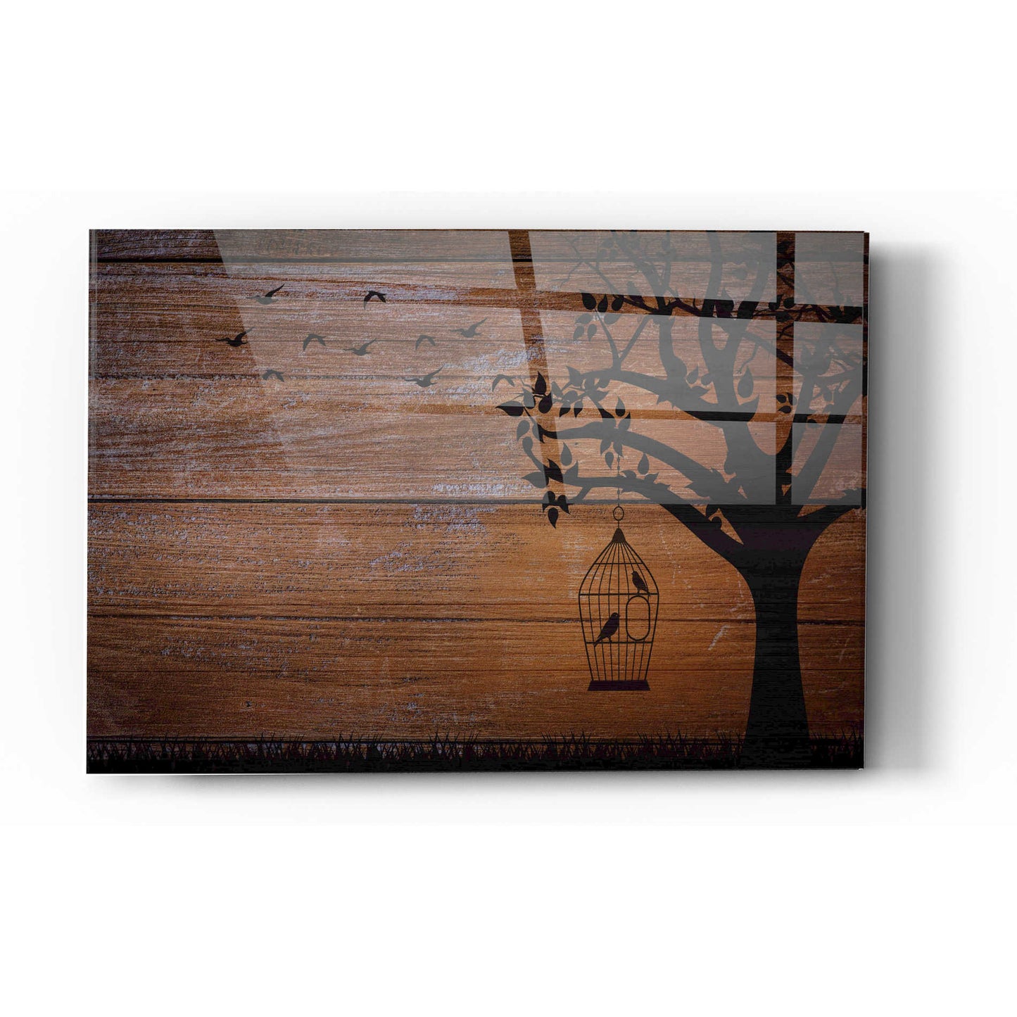 "Wood Series: Birds and Tree Silhouettes" by Epic Graffiti Portfolio printed on crystal clear acrylic glass. Featuring silhouettes of a tree with birds on wood pattern.