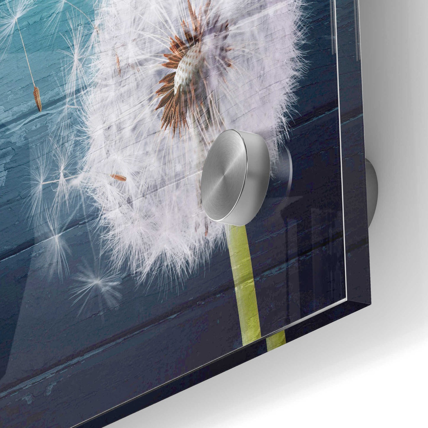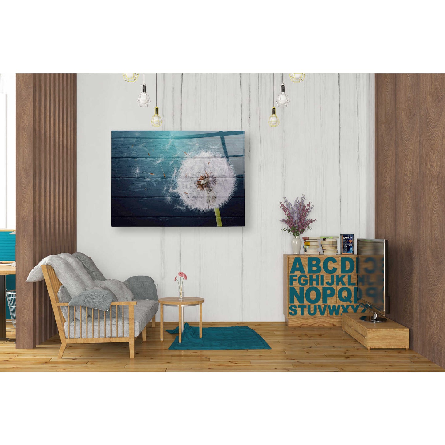 "Wood Series: Dandi Blue" by Epic Graffiti Portfolio printed on crystal clear acrylic glass. Featuring a close up of a dandelion layered on blue wood pattern.
