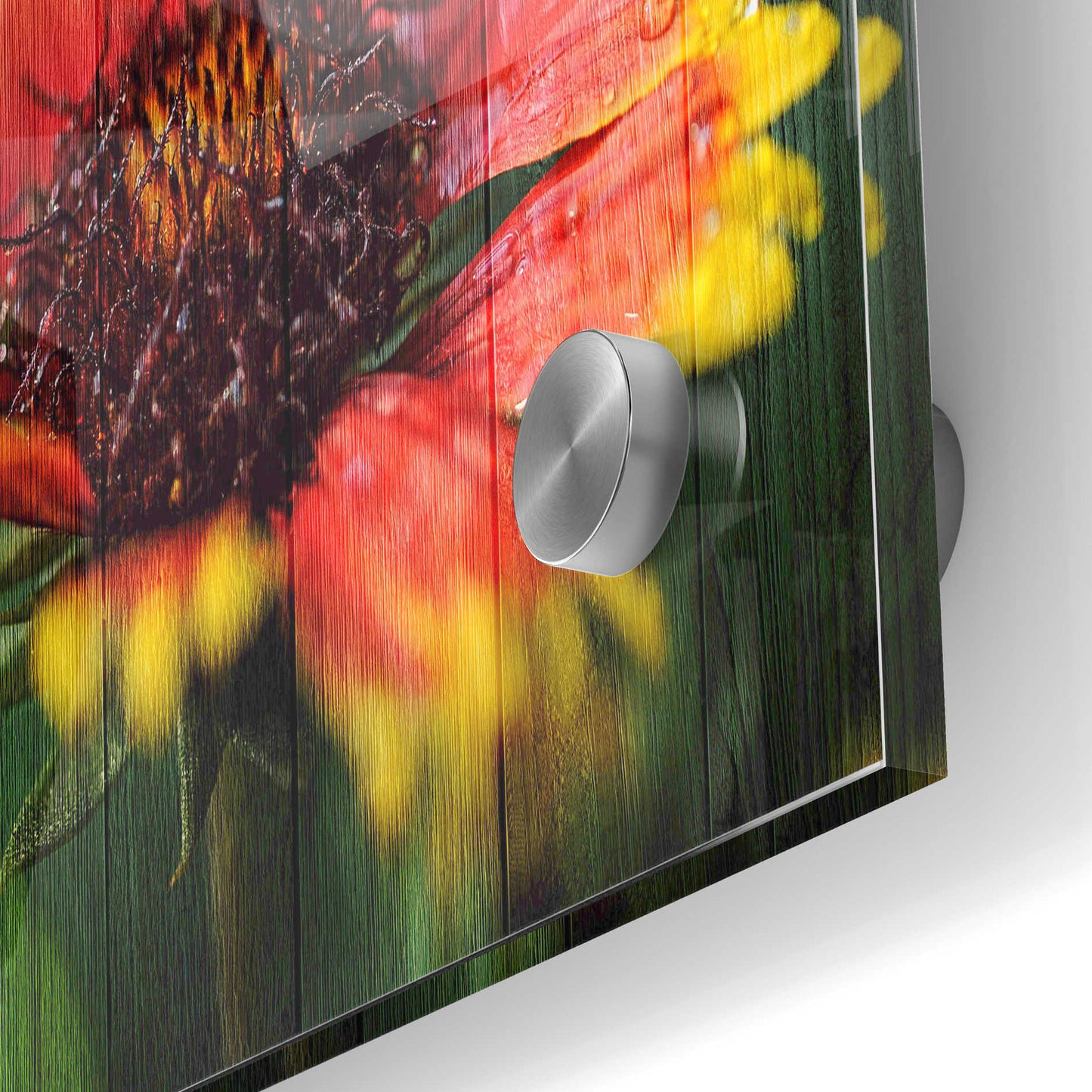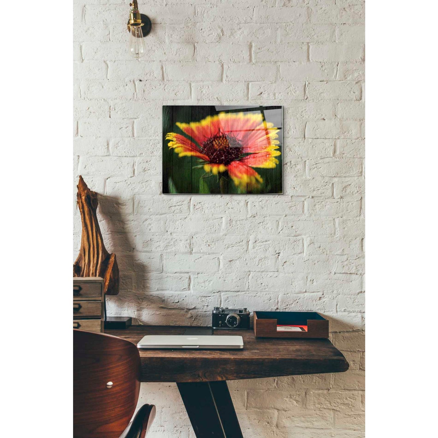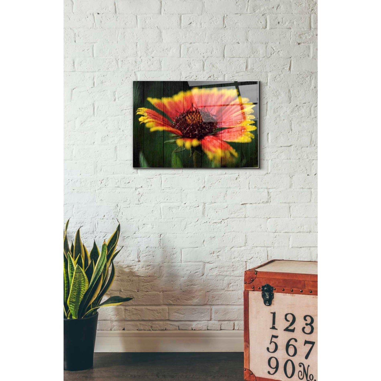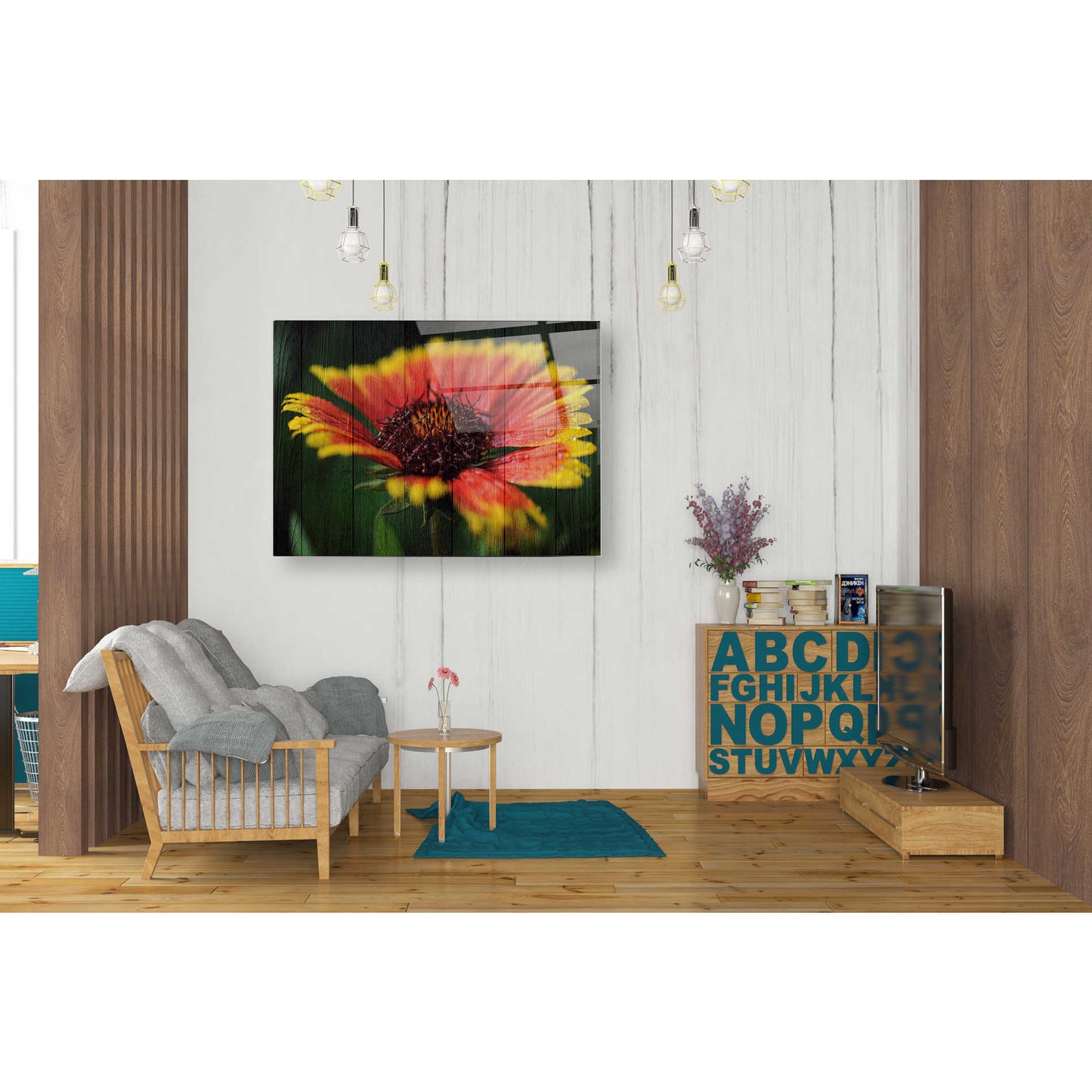 "Wood Series: Sunburst" by Epic Graffiti Portfolio printed on crystal clear acrylic glass. Featuring a beautiful red flower layered on wood pattern.